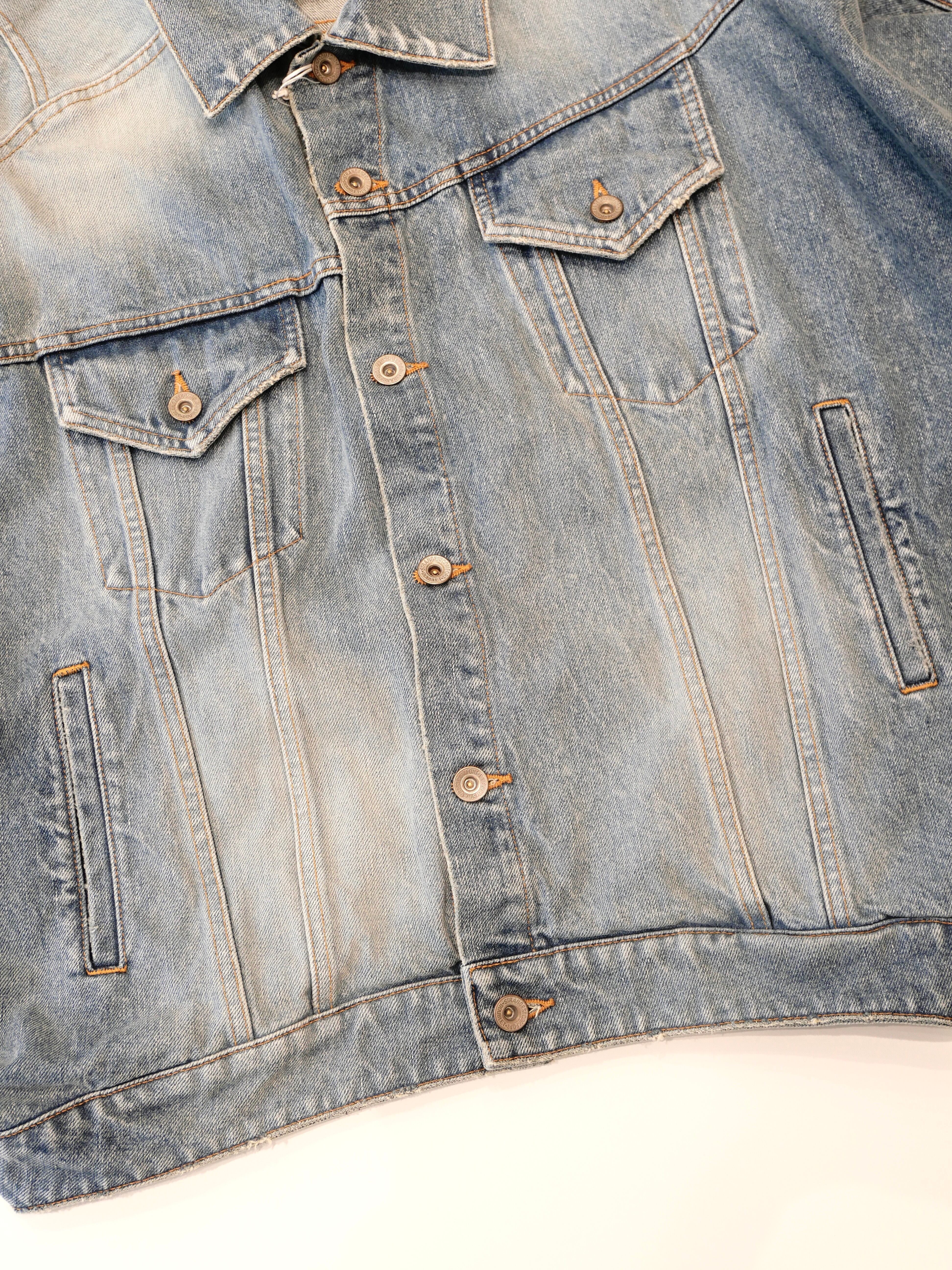 Synflux社の先端的なテクノロジーを駆使し、3Dモデリングしたデニムジャケットを、4パーツの平面パーツのみで構成し既存のジャケットの脇線や肩線などの位置では切り替えし線を入れないアルゴリズムにより生成されたパターンにより独特なカッティングとなったこのジャケットは、ジャケットの形は保ちながらも歪み、いびつな部分も見受けられます。