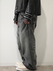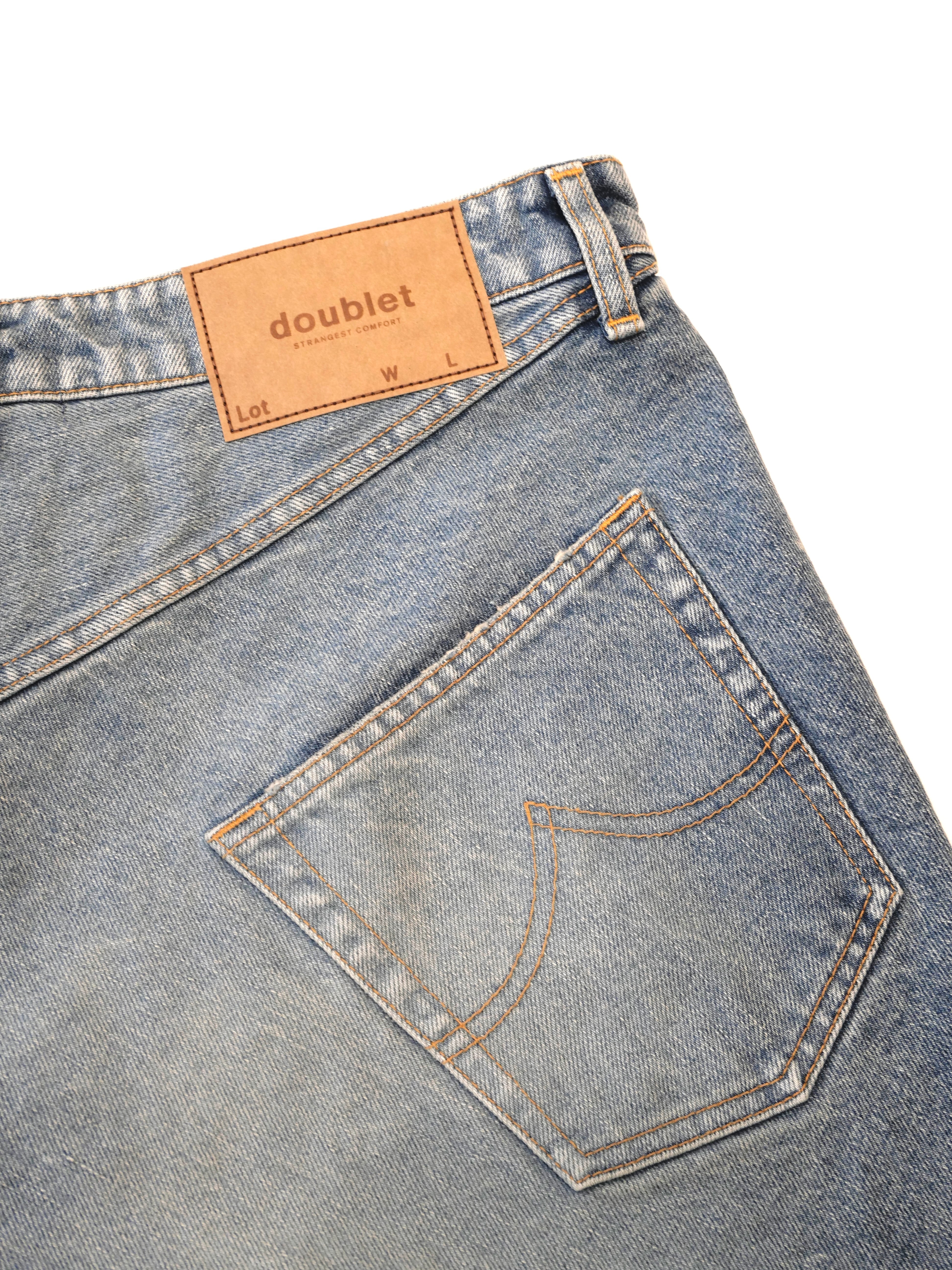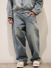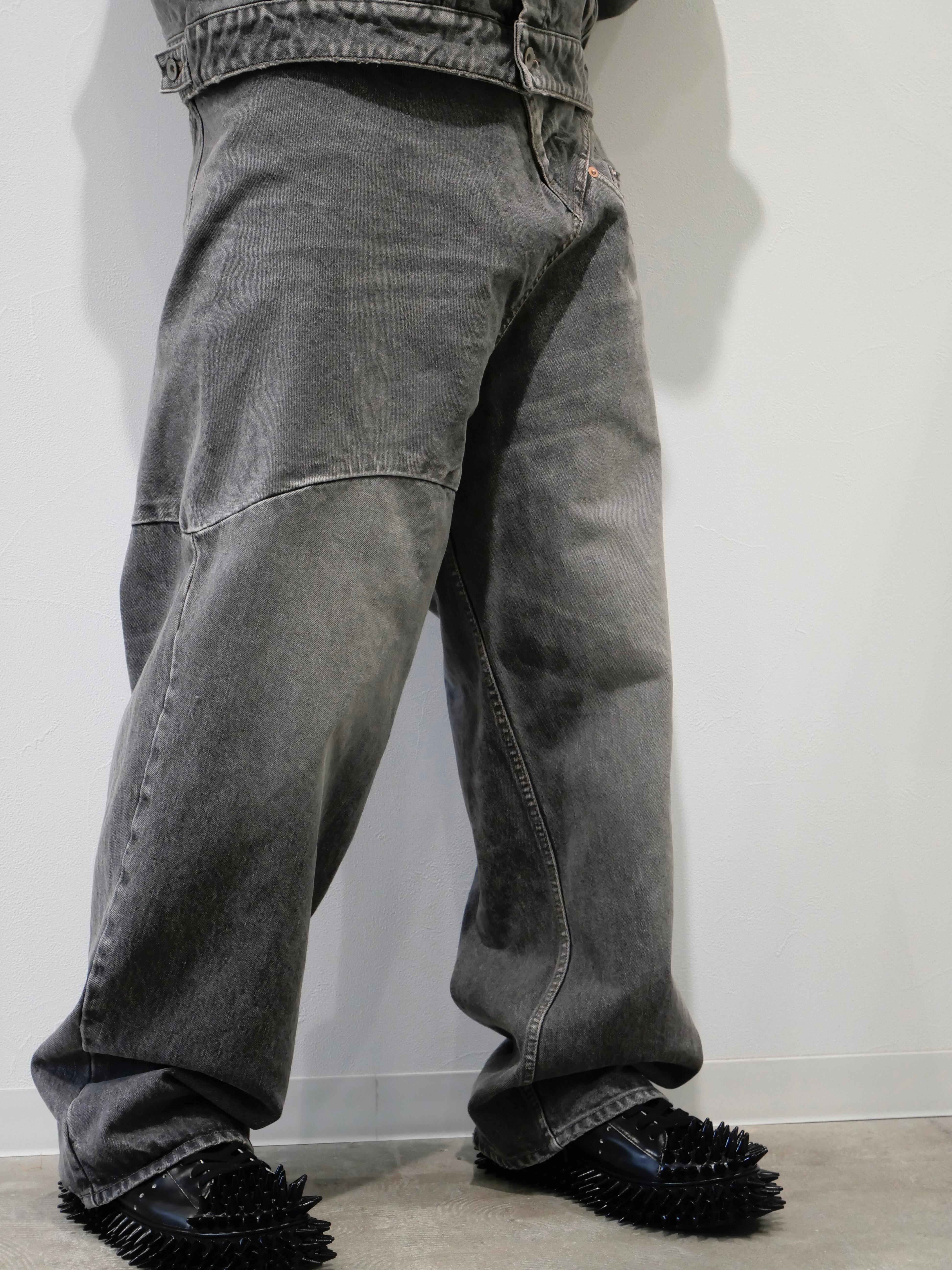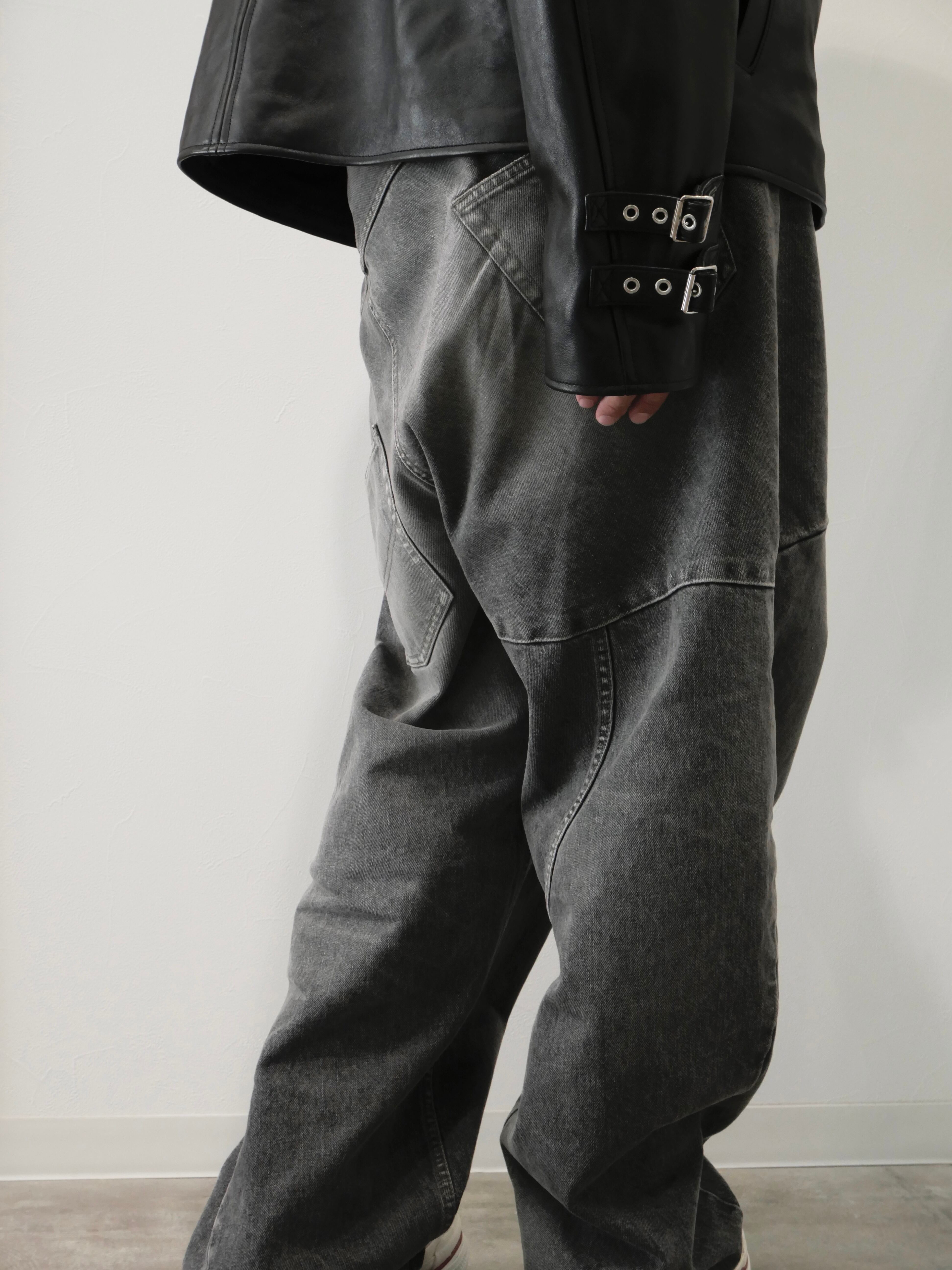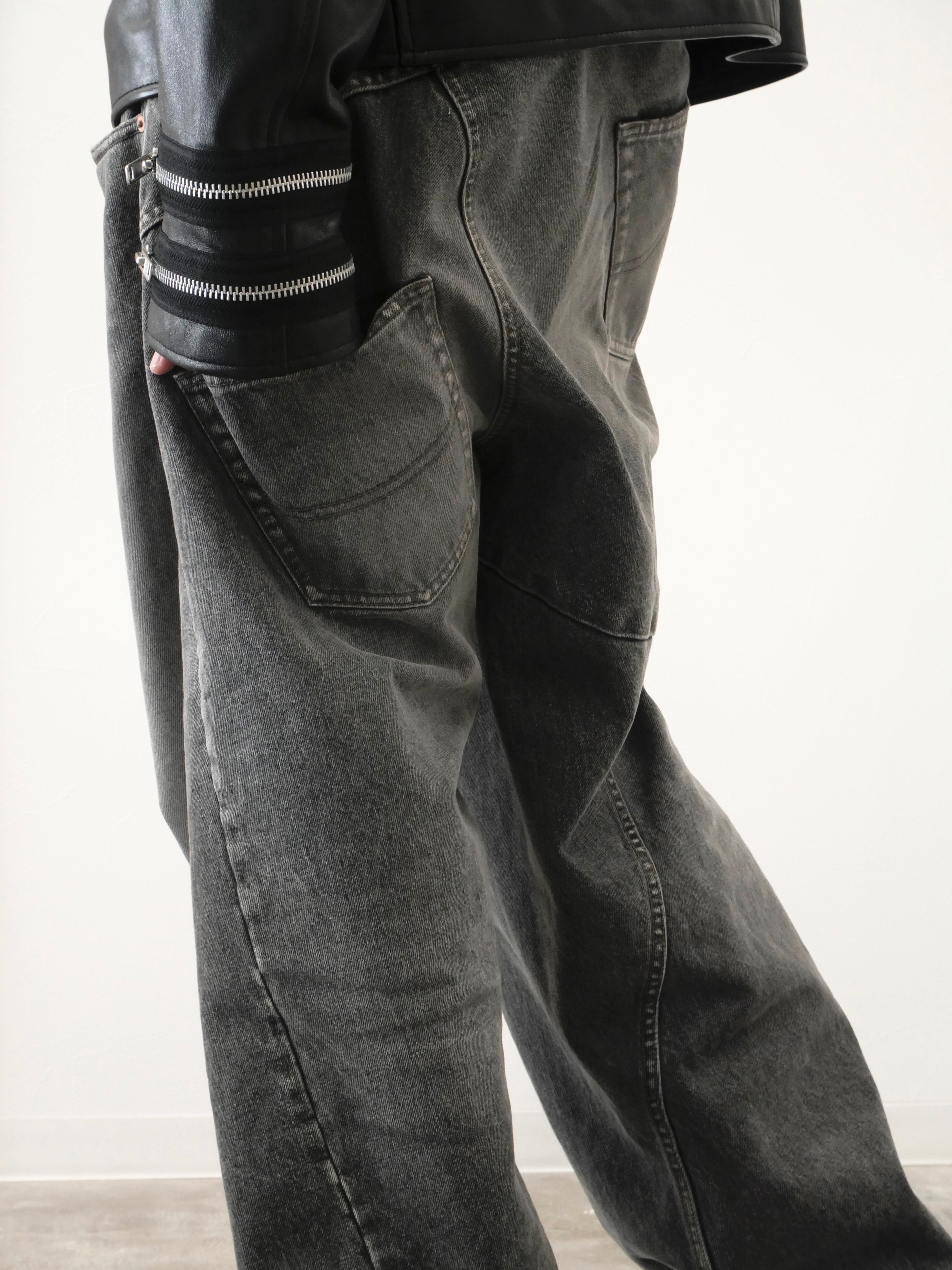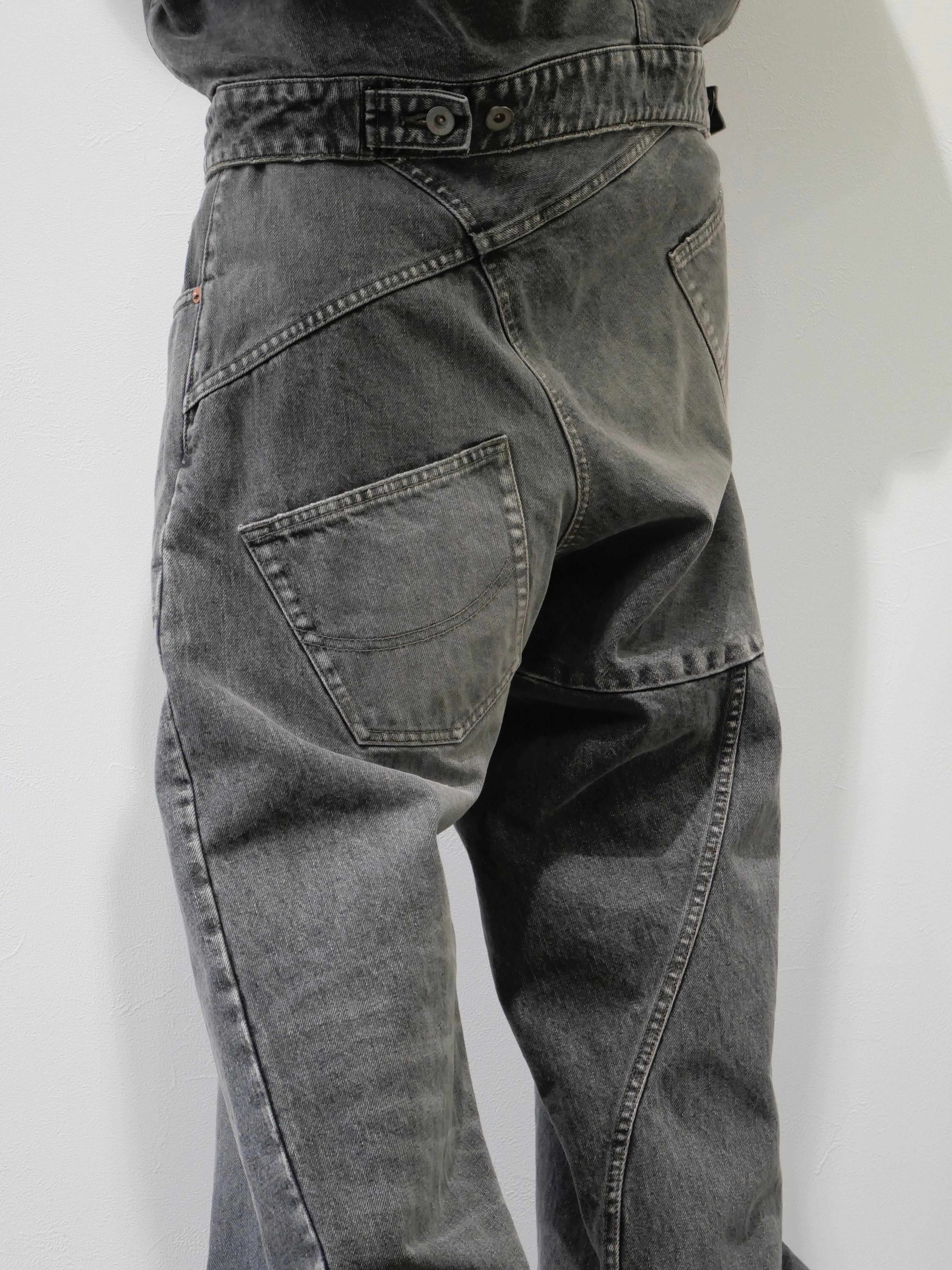 Synflux社の先端的なテクノロジーを駆使し、3Dモデリングしたデニムパンツを、4パーツの平面パーツのみで構成し既存のパンツの脇線や股ぐりなどの位置では切り替えし線を入れないアルゴリズムにより生成されたパターンにより独特なカッティングとなったこのパンツは、パンツの形は保ちながらも歪み、いびつな部分も見受けられます。