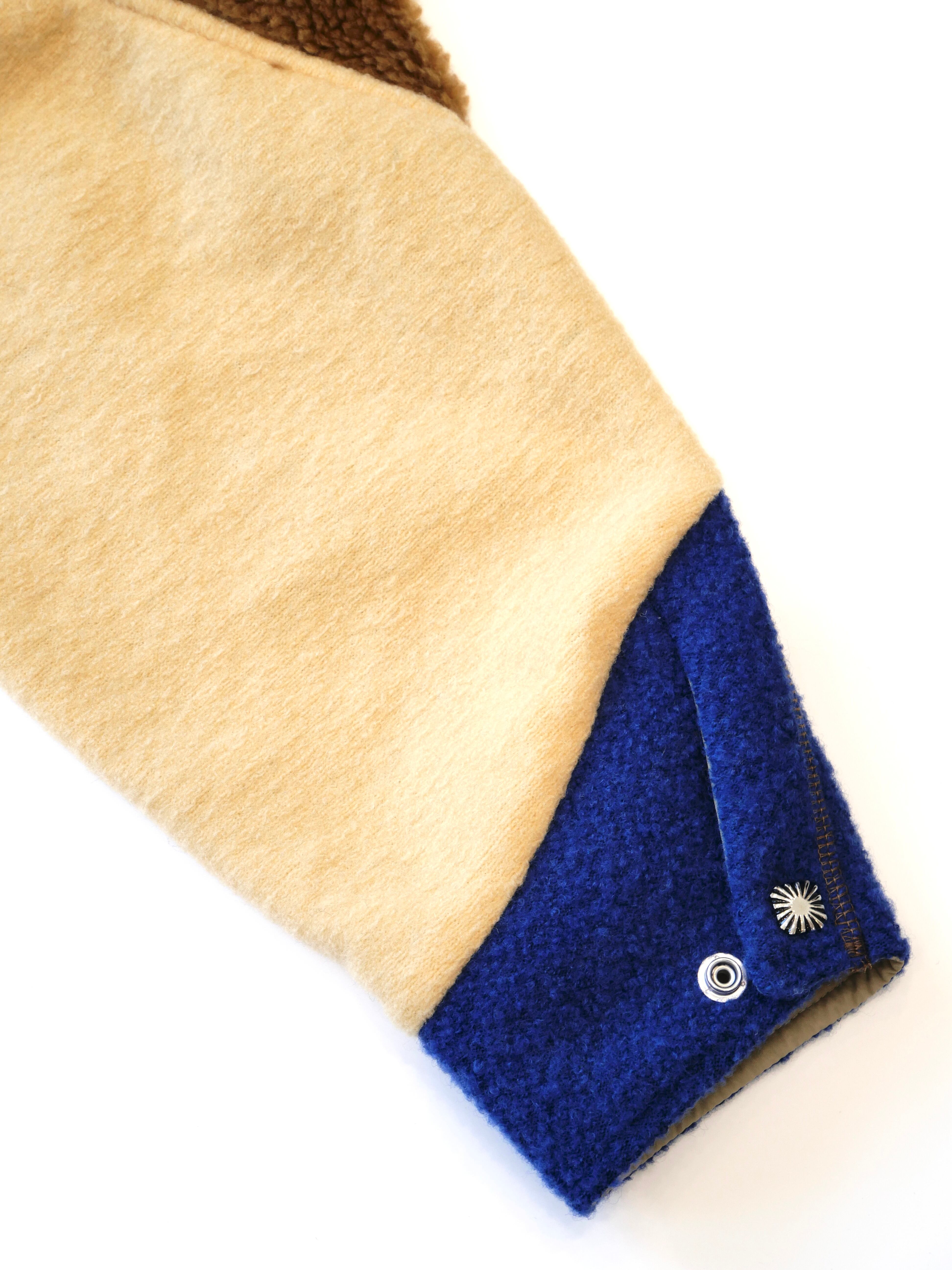 温かみのあるボア素材に特徴的な配色とメタルパーツが施されたデザインとなっております。
