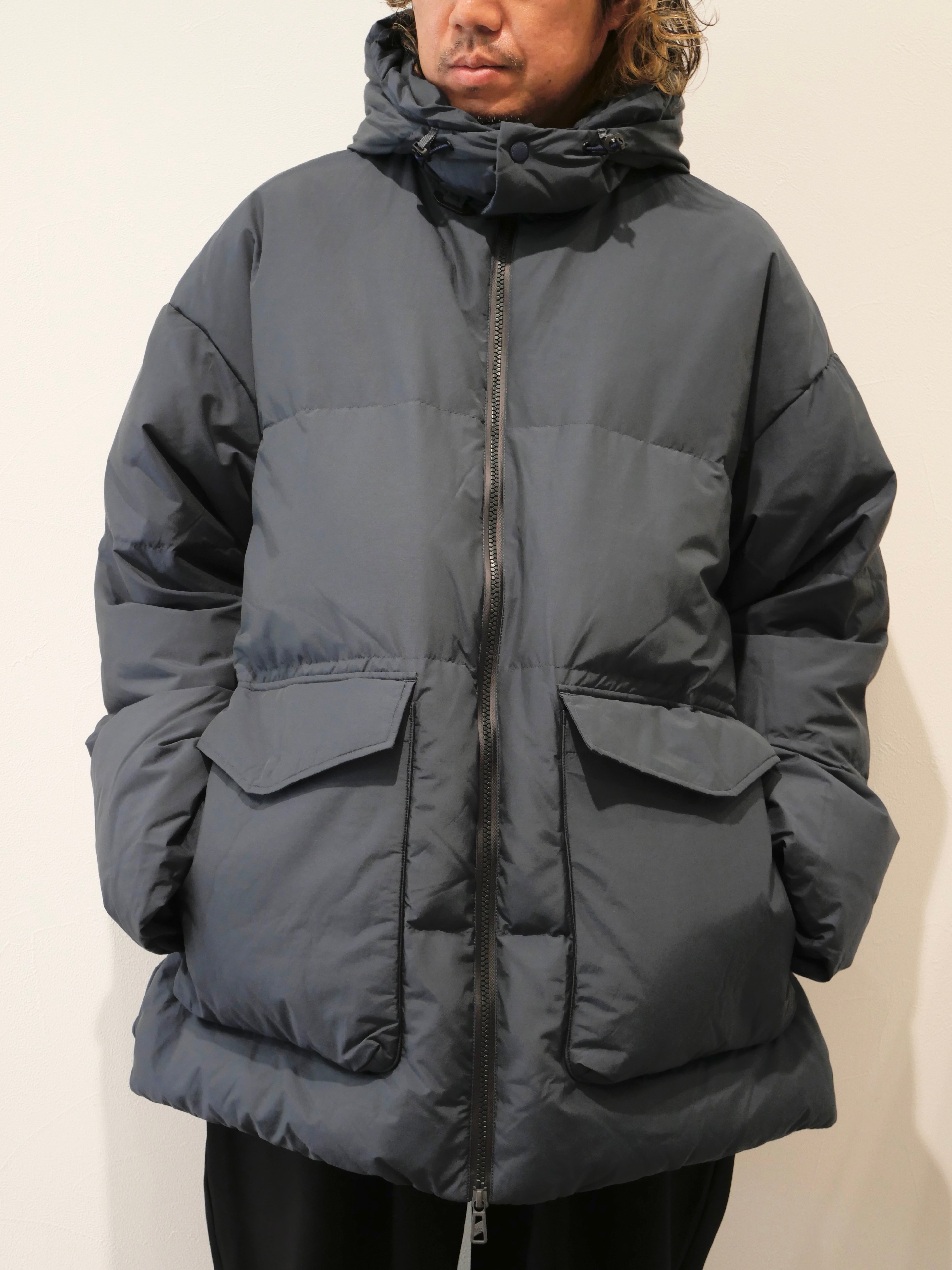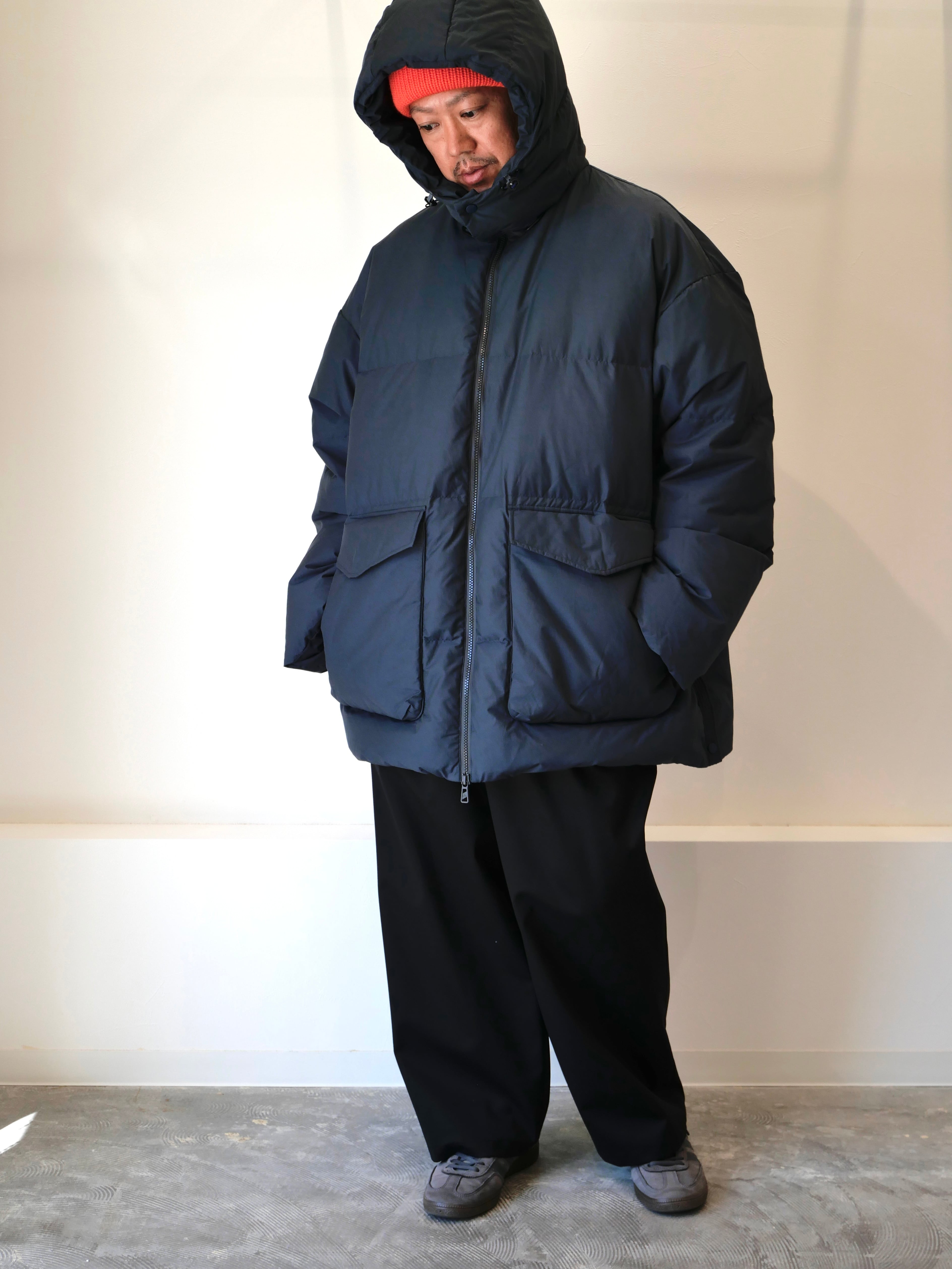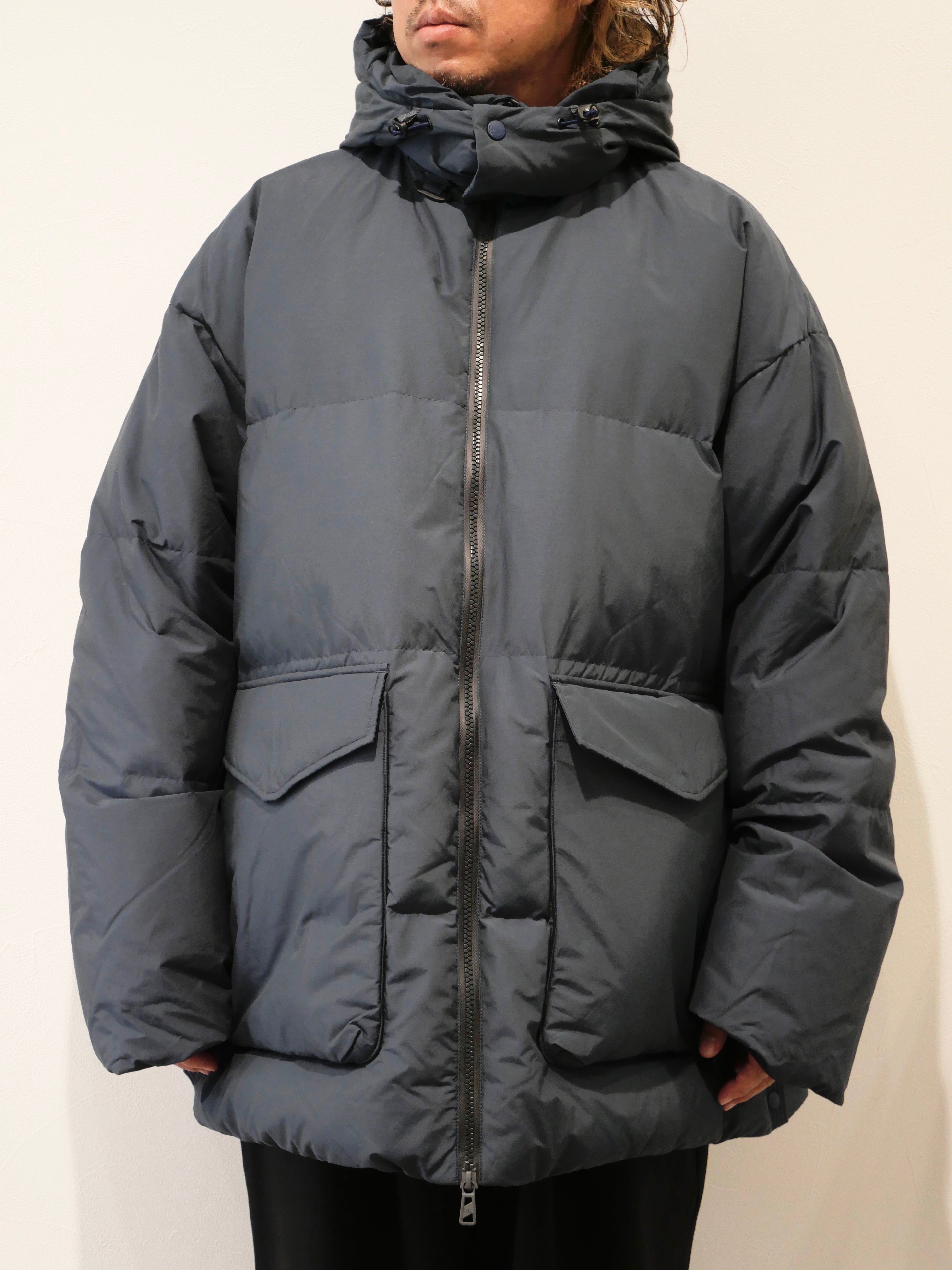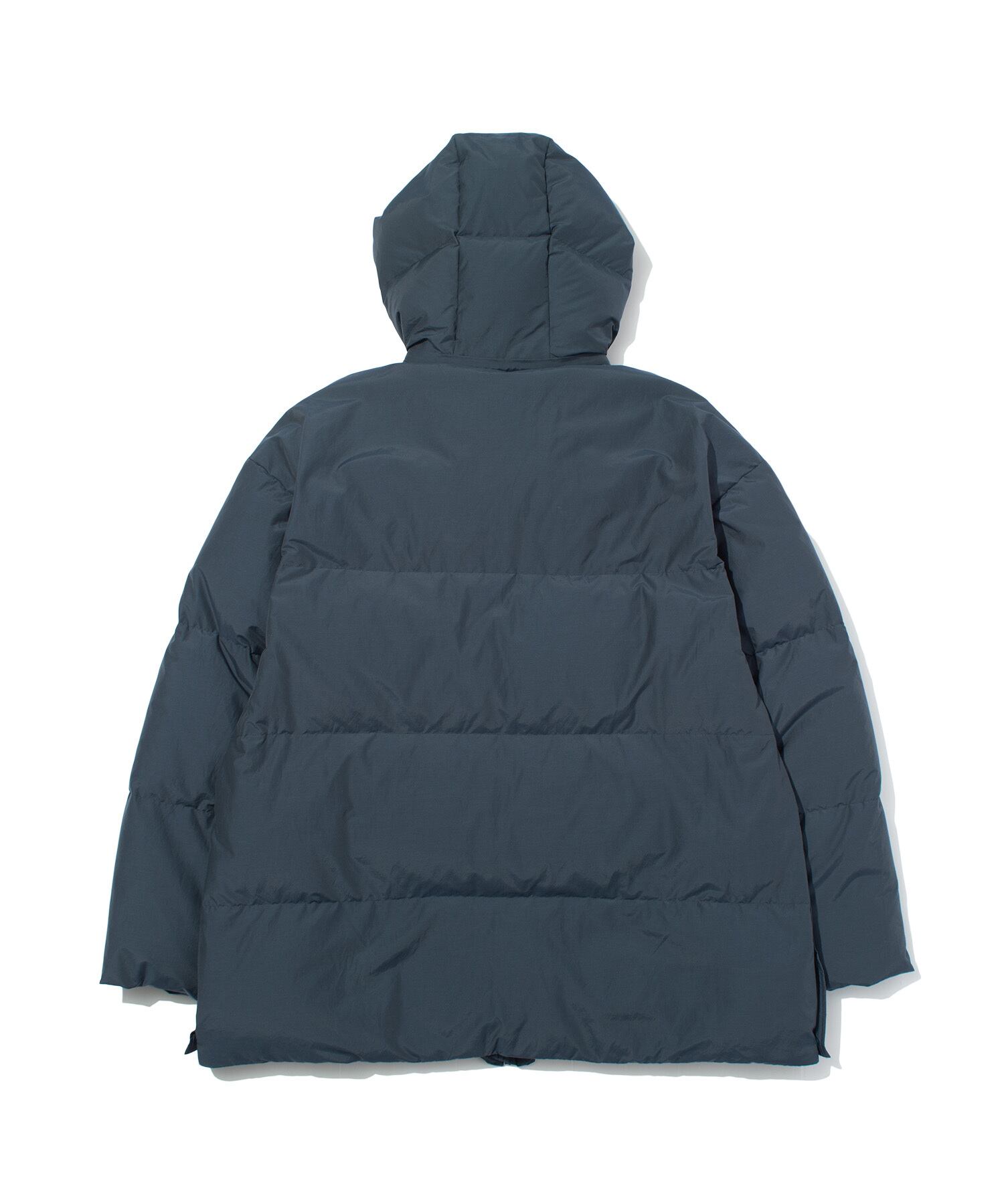 ジャケットや寝袋、布団から羽毛を回収し、丁寧に再洗浄された650フィルパワーのダウン、素材はリサイクルナイロンを使用した、ダウンフードブルゾン。