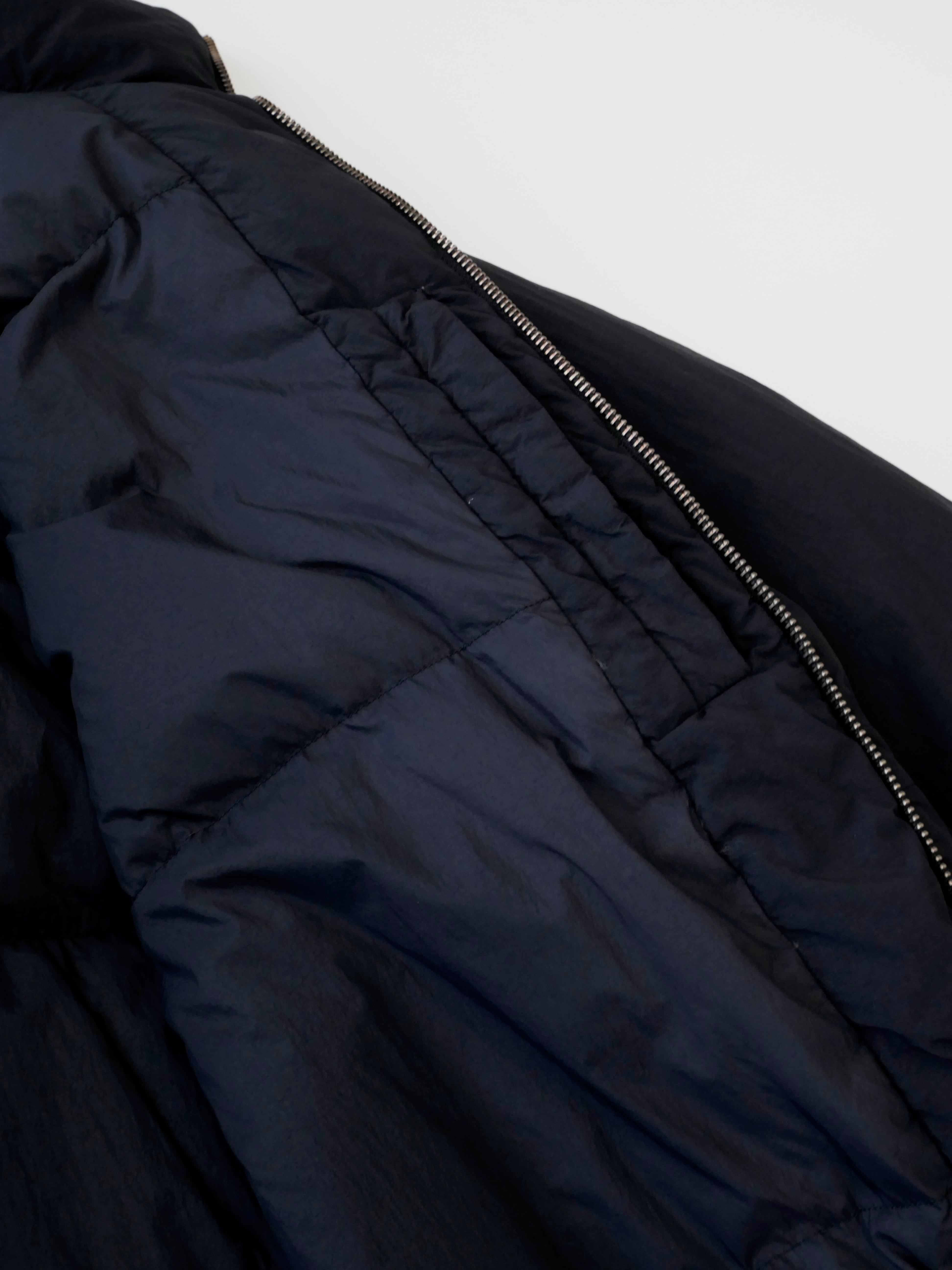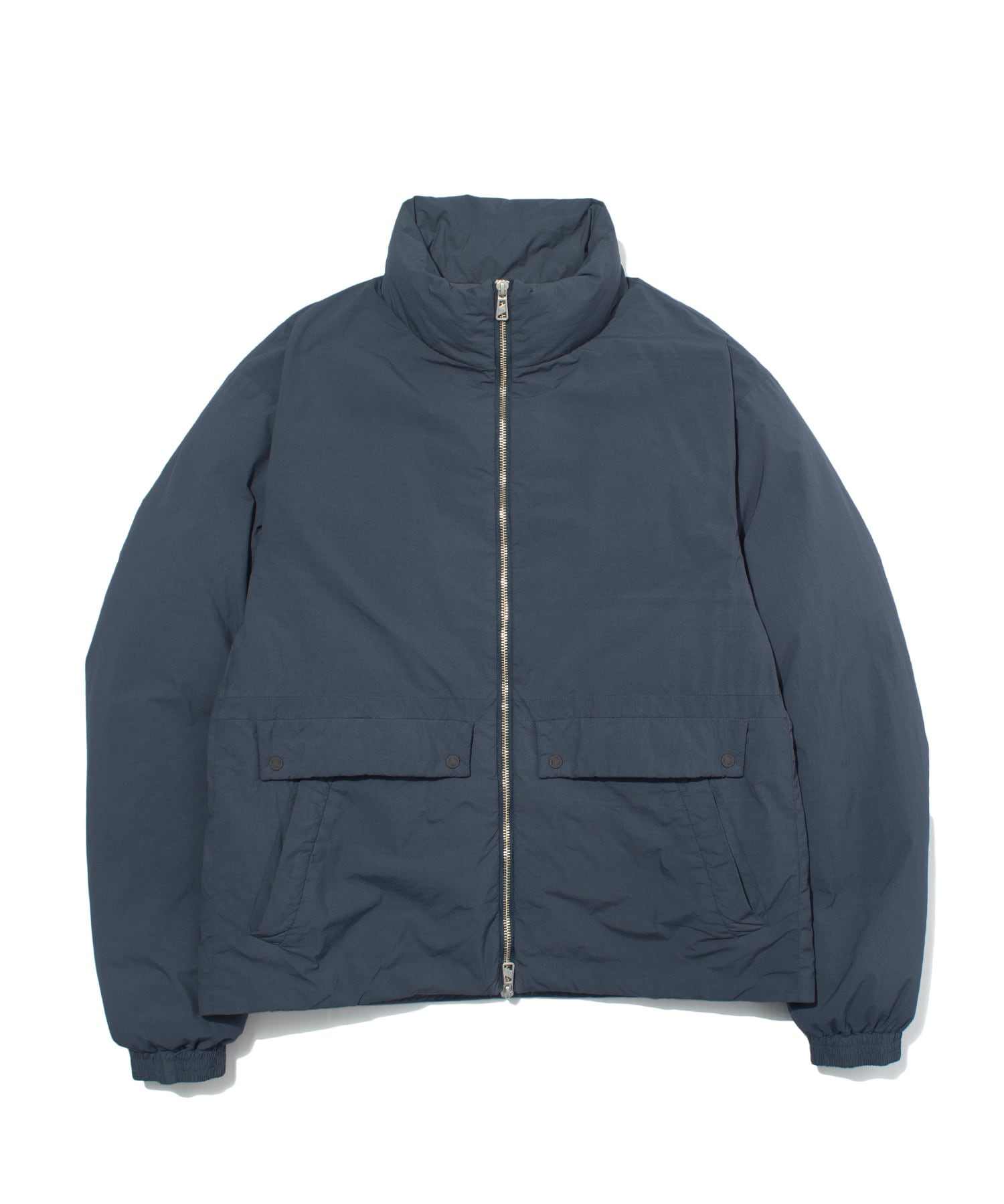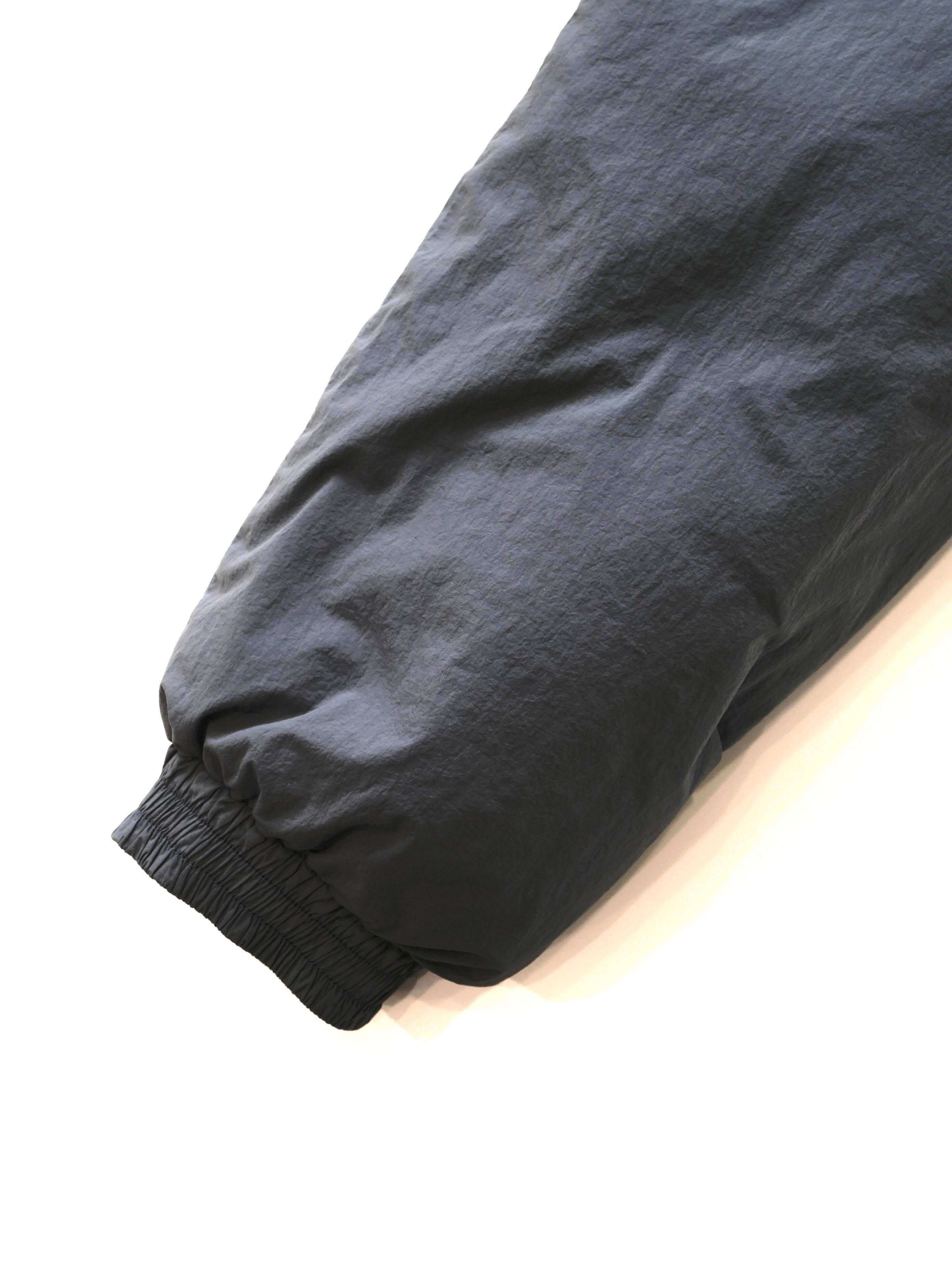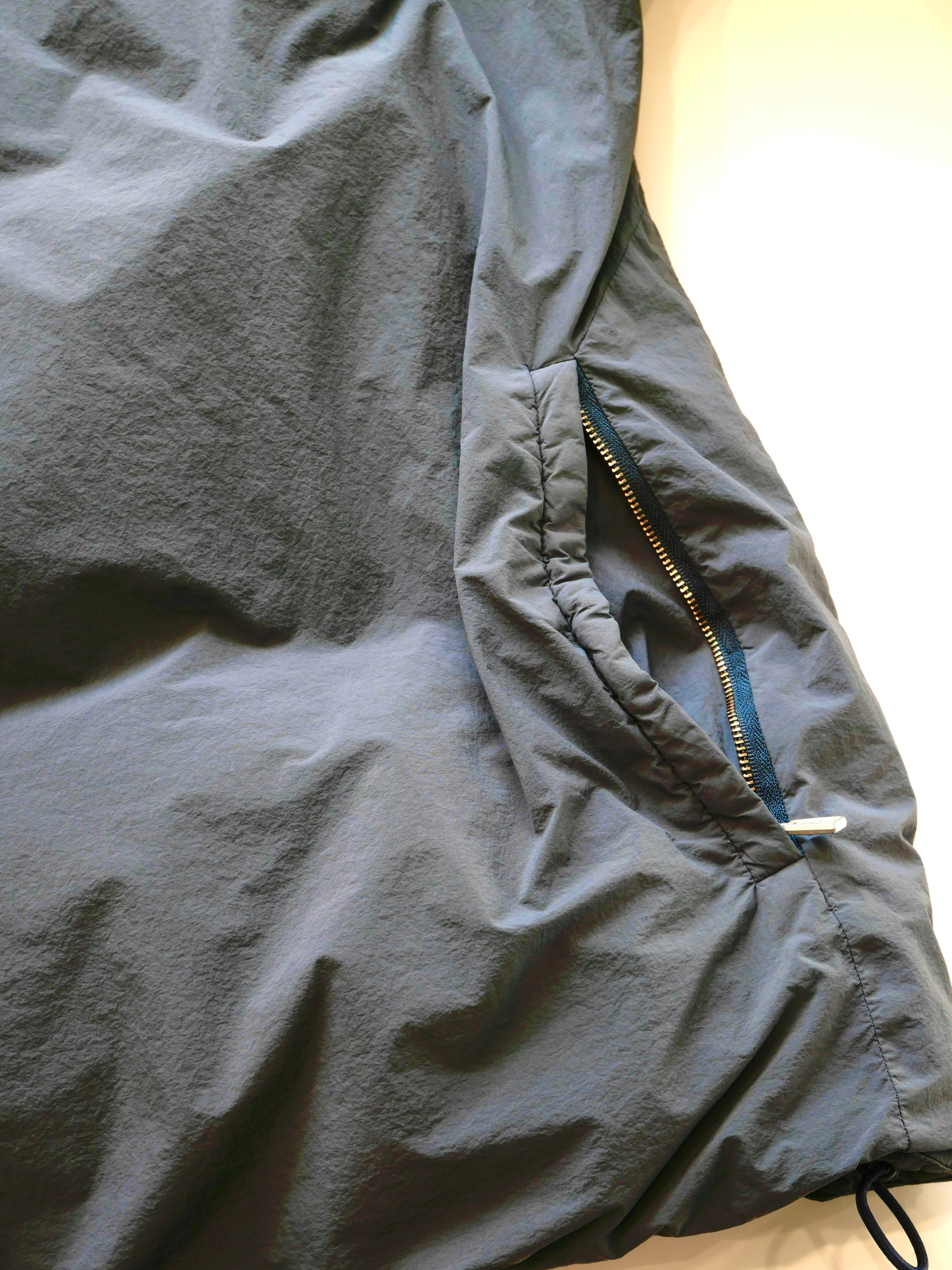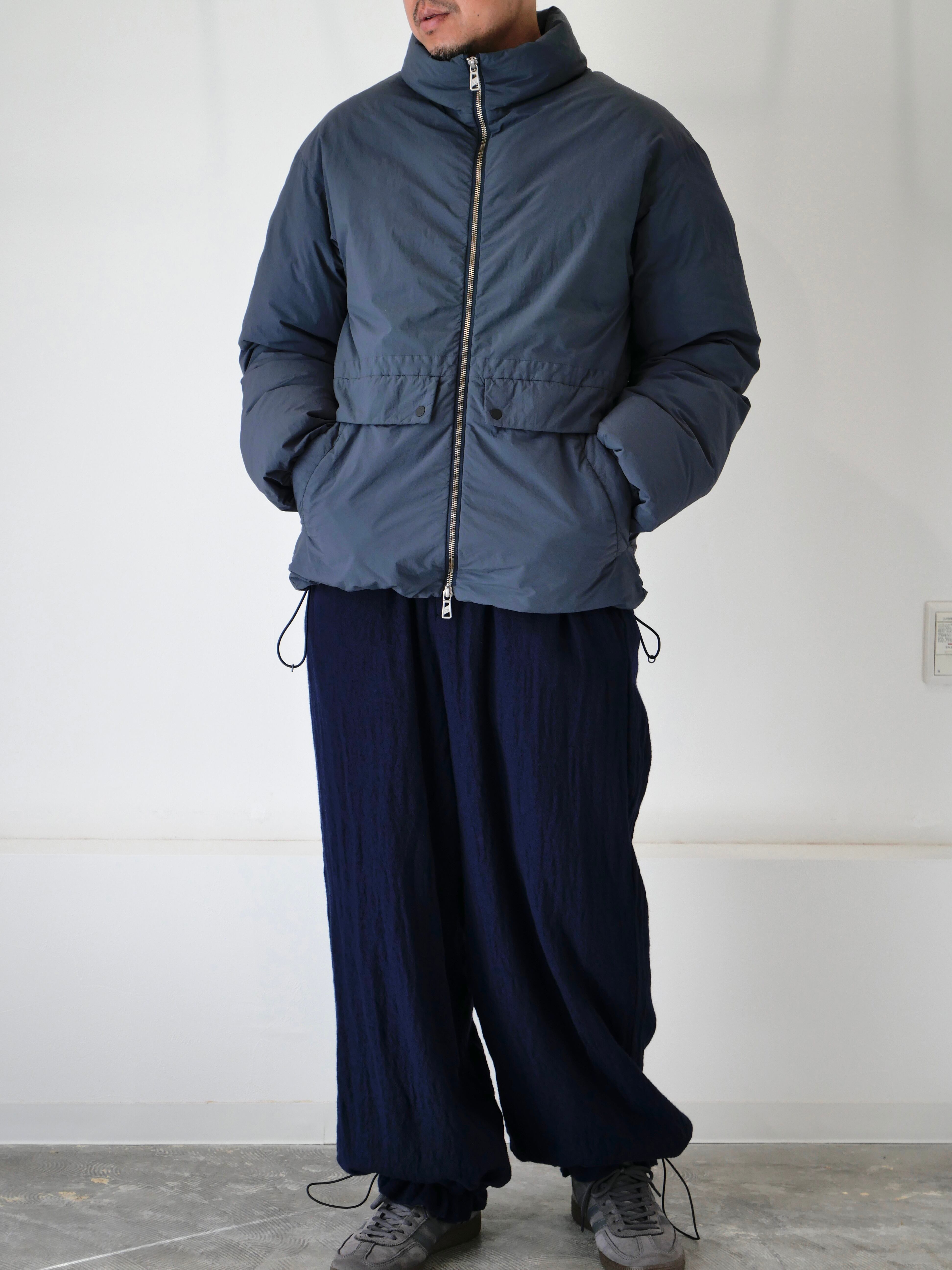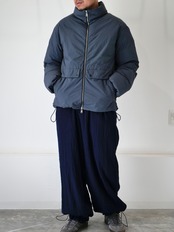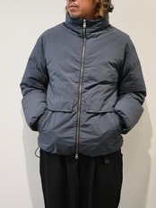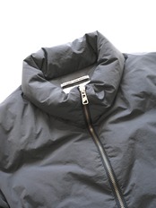 裏キルト仕様のミニマルなデザインで、軽量ながらボリューム感のあるシルエットを実現。フロントにはメタル製のファスナーとボタンを採用し、クラシックな風合いを強調しています。ポケットの袋布には起毛素材を使用し、ハンドウォーマーとしての役割も果たします。袖口のゴム仕様と裾のアジャスターにより、保温性を高めることが可能な機能性ウェアです。