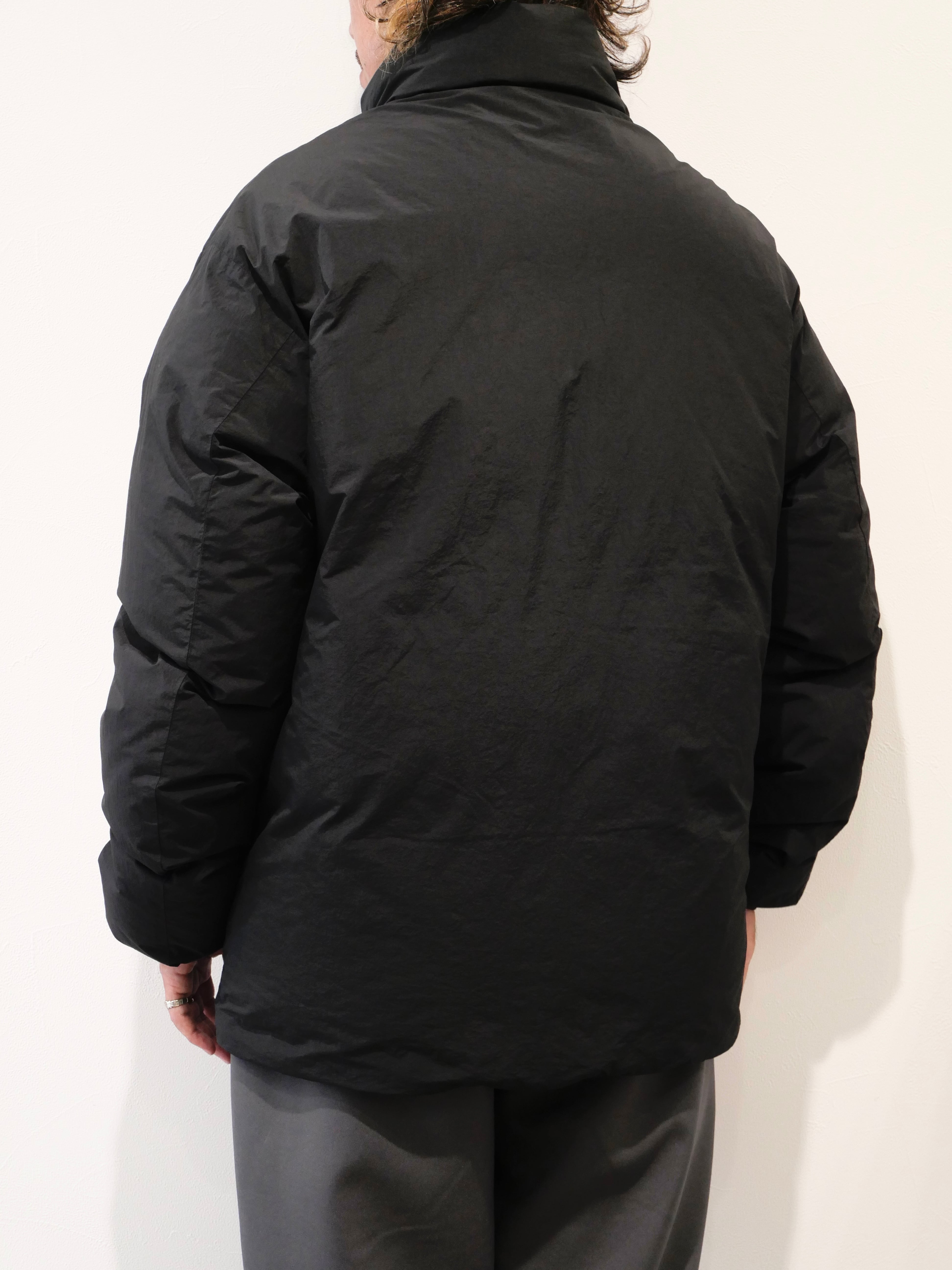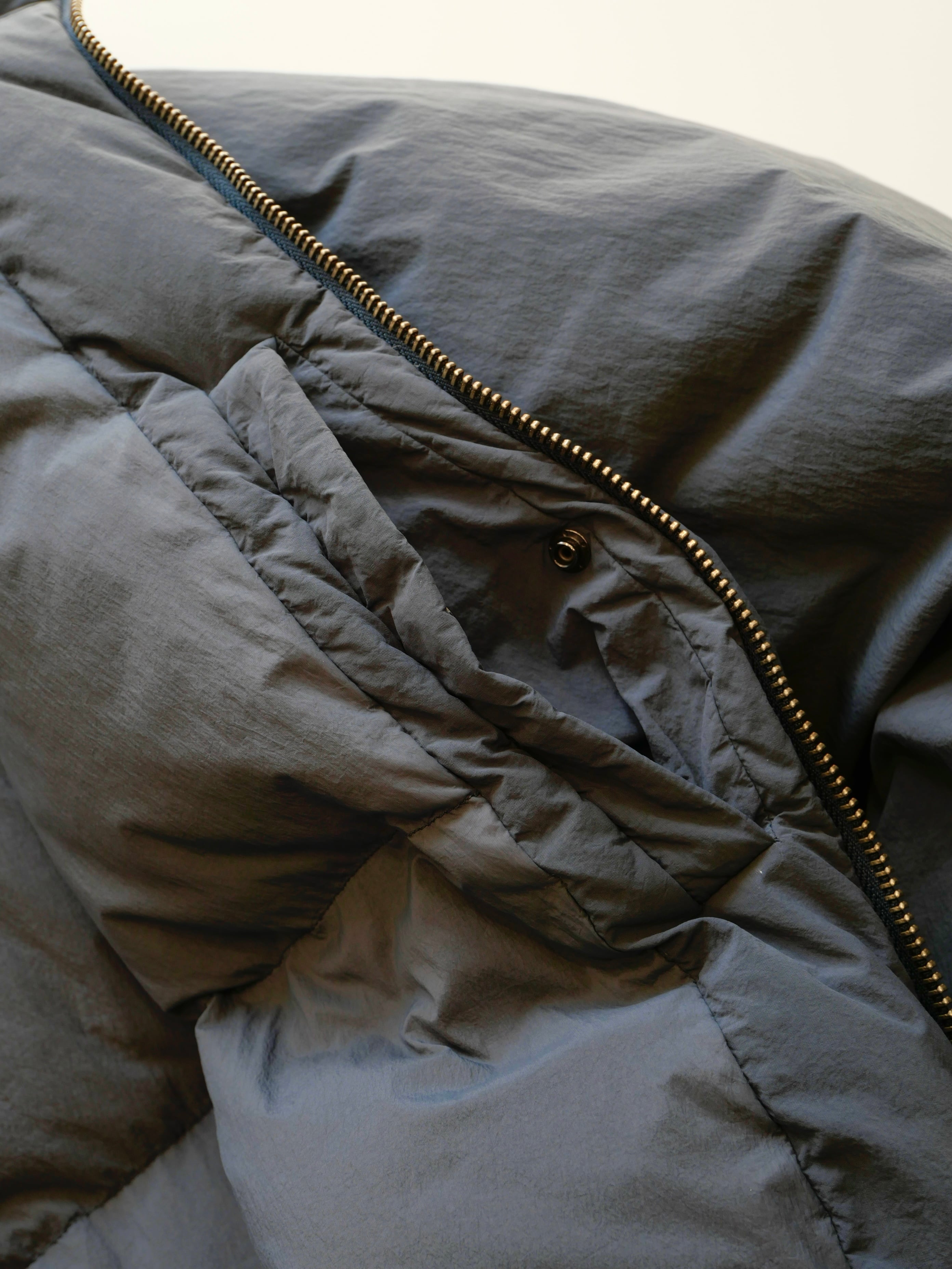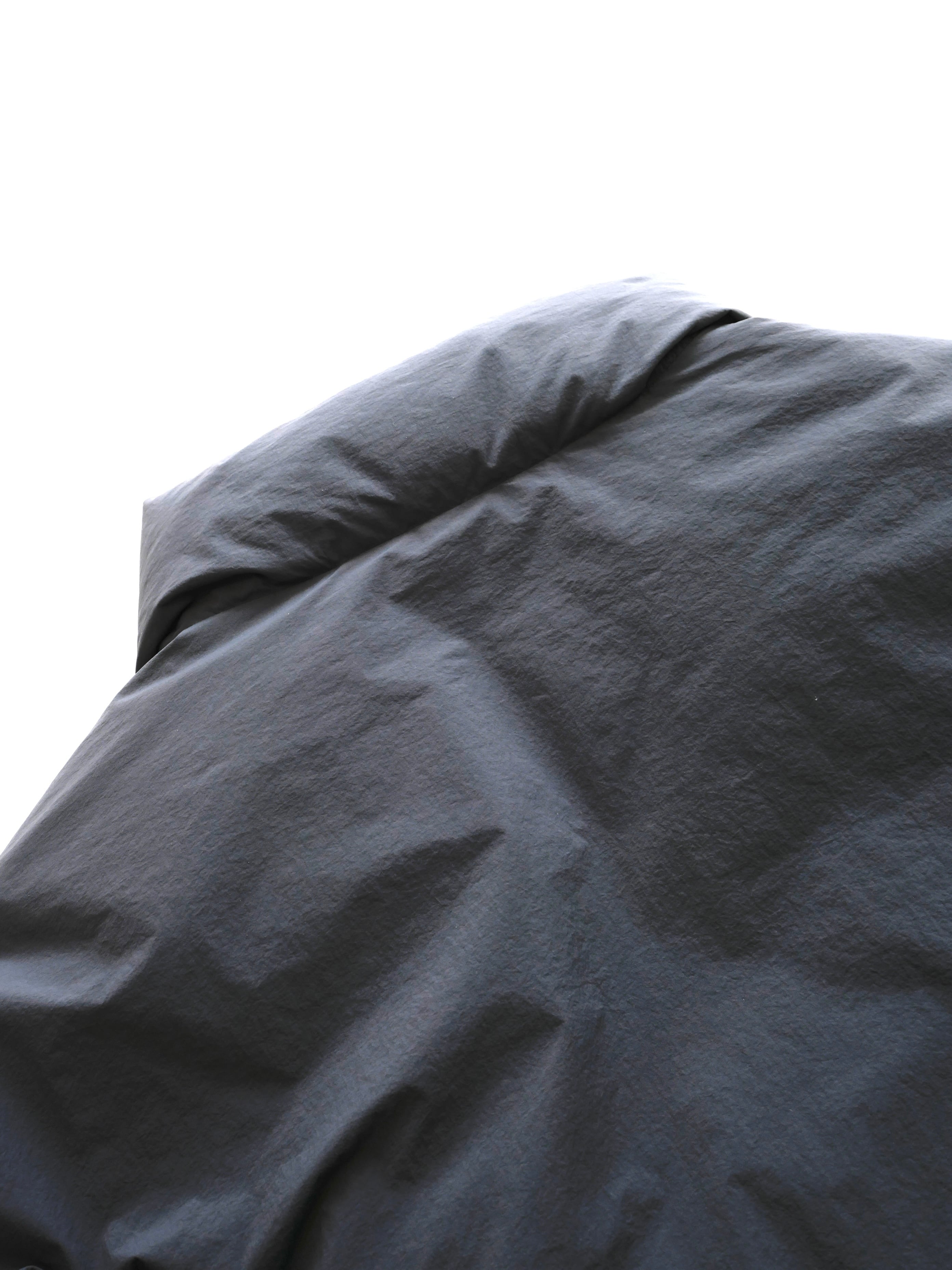 縦横の番手差を生かしたナイロン生地を使用し、製品染めを施したダウンジャケット。ナイロン特有の機能性を保ちながら、製品染めならではの深みと独特の色合いを表現。染色時に生まれる微妙な色ムラが、ヴィンテージ感あふれる仕上がりを実現します。