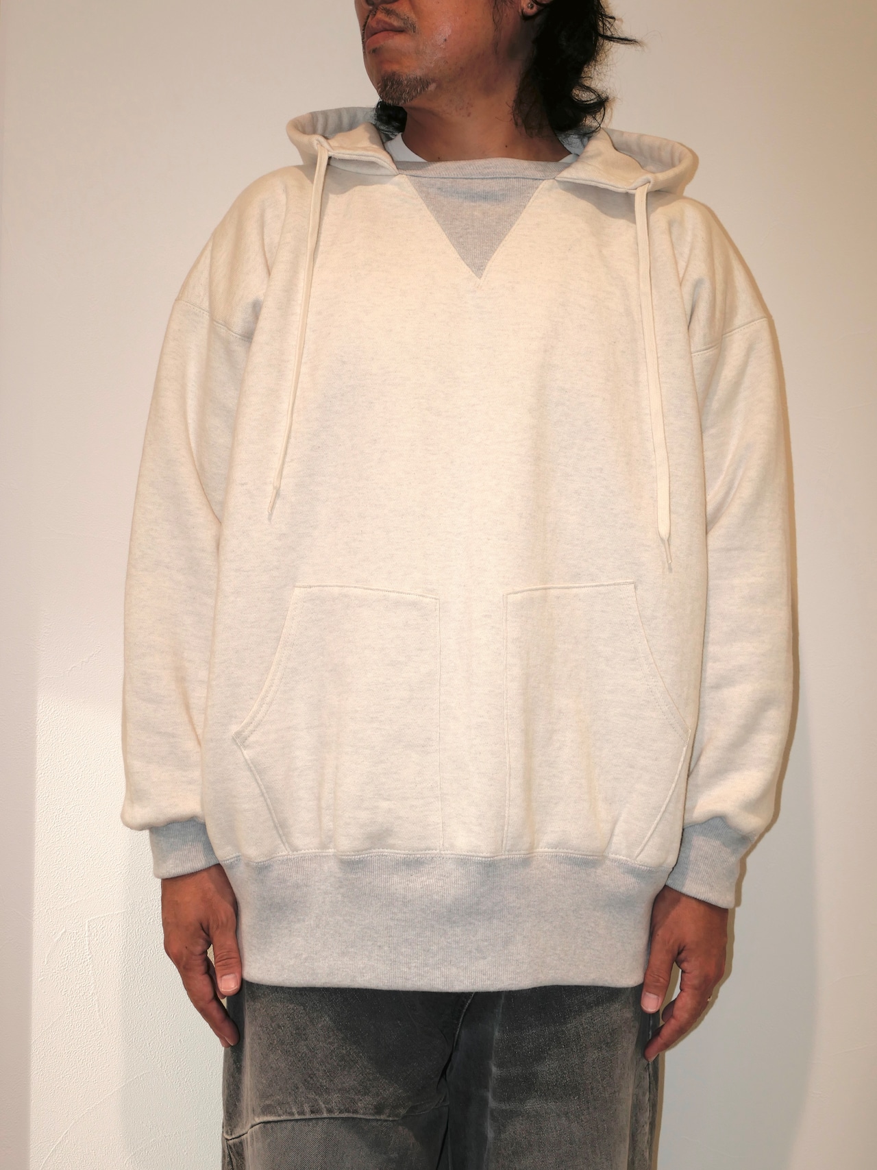 裏起毛素材を二重構造にしてかさを上げ、寒い季節にも対応する保温性を持たせたダブルシックネスプル オーバーアフターフーデッドスウェットシャツです。