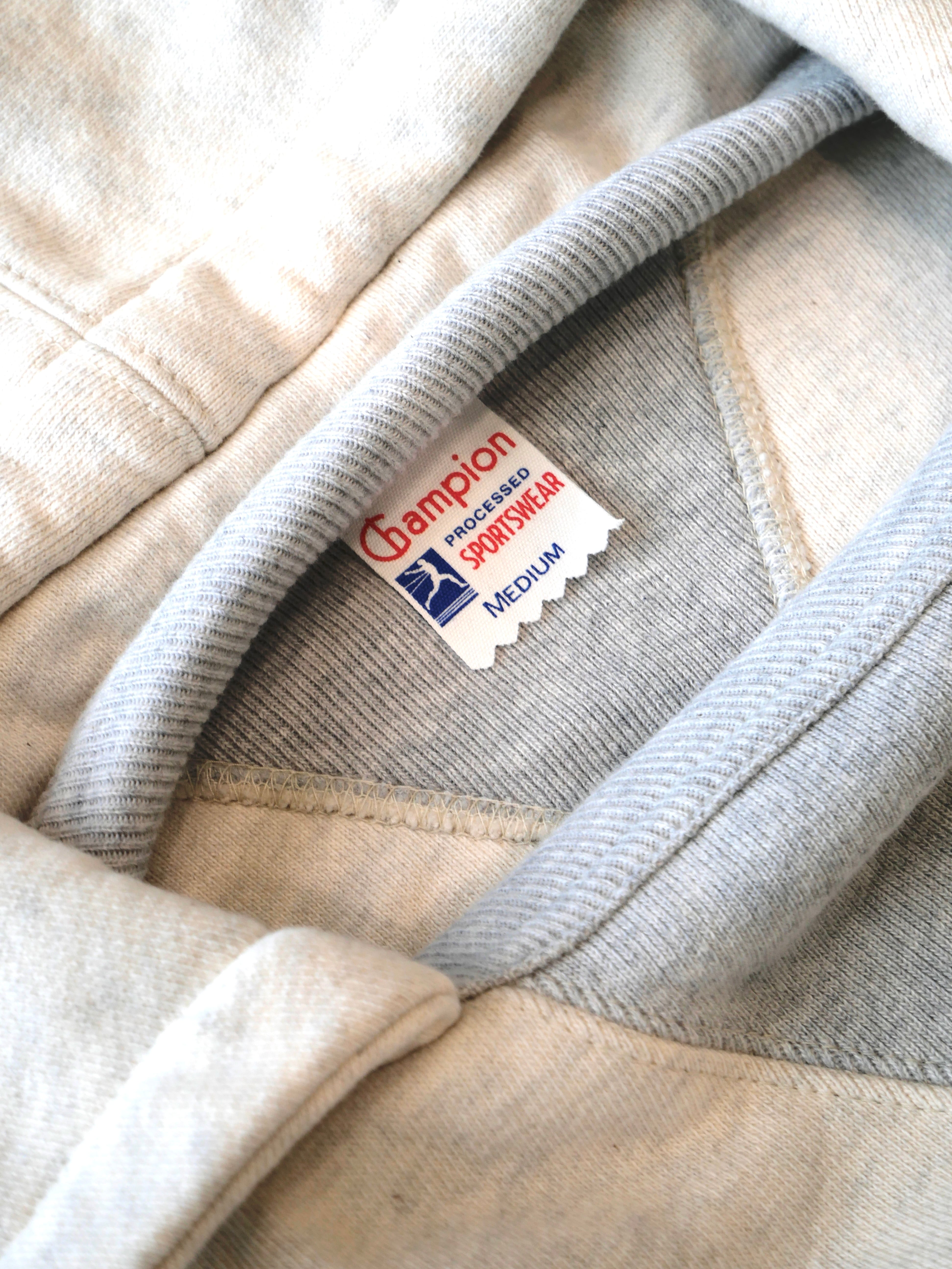 当時の生地を忠実に再現したコットン100%の生地を使用。脇接ぎのない丸胴仕様や筒状の袖リブ、襟のリブにフードを挟み込んだ通称「後付けパーカー」、前後の襟に入れた「GUSSET(ガゼット)」など、当時の仕様を再現しています。旧式のシンカー編み機で編み立てた独特のボリューム感と風合いが特徴です。