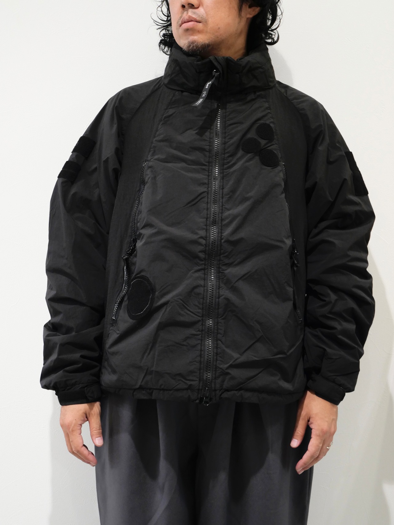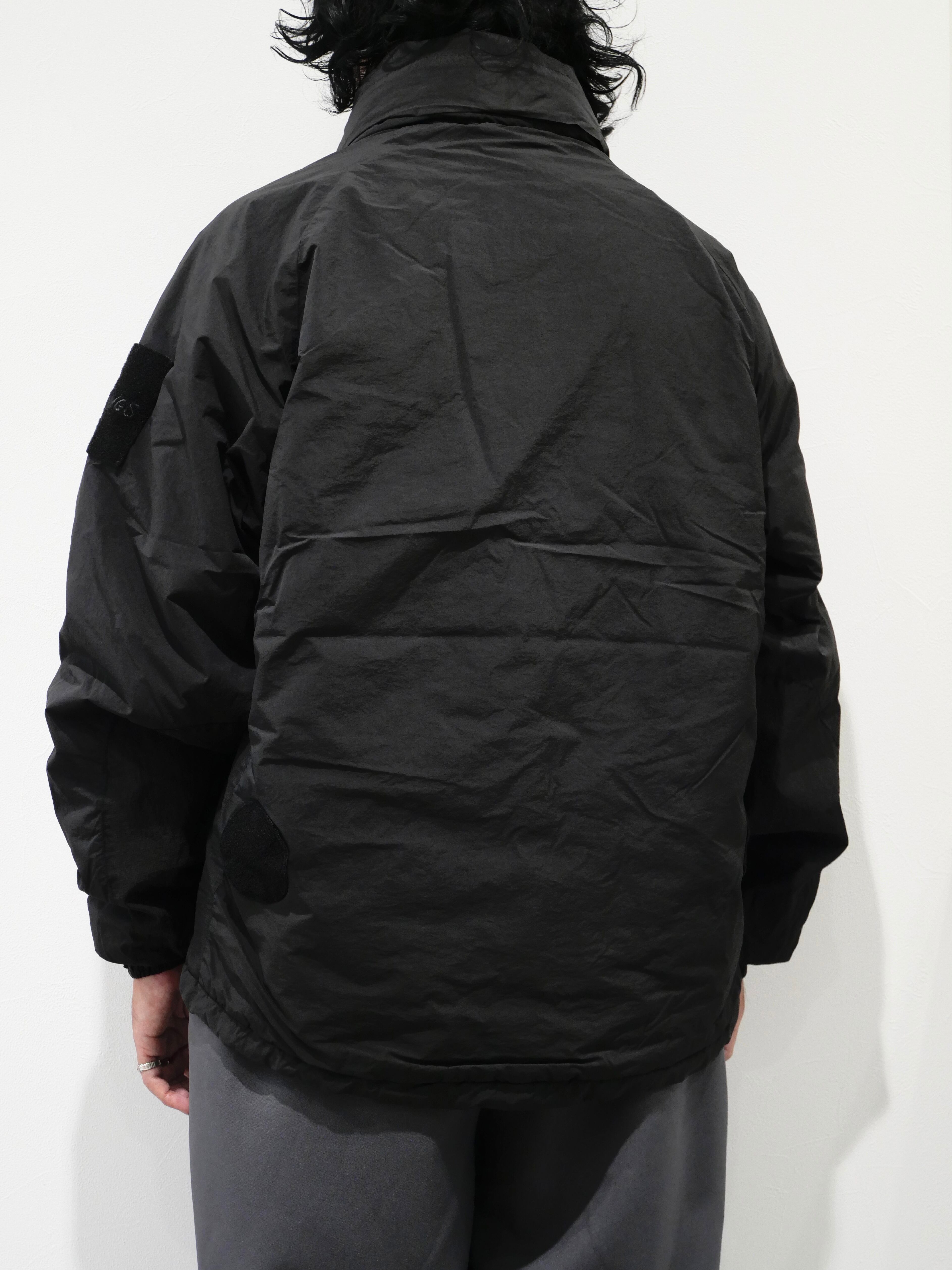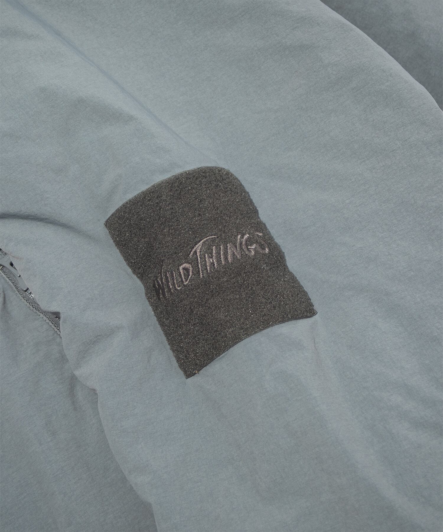 ガーメントダイ(製品染め)を施したナイロン素材を使用し、深みのある独特な色合いに仕上げました。中綿にはプリマロフトを使用。長いシーズン着用できるよう、ベースのHAPPY JACKETより中綿の分量を調整。袖部分や胸元に施されたパッチも特徴的なデザイン。