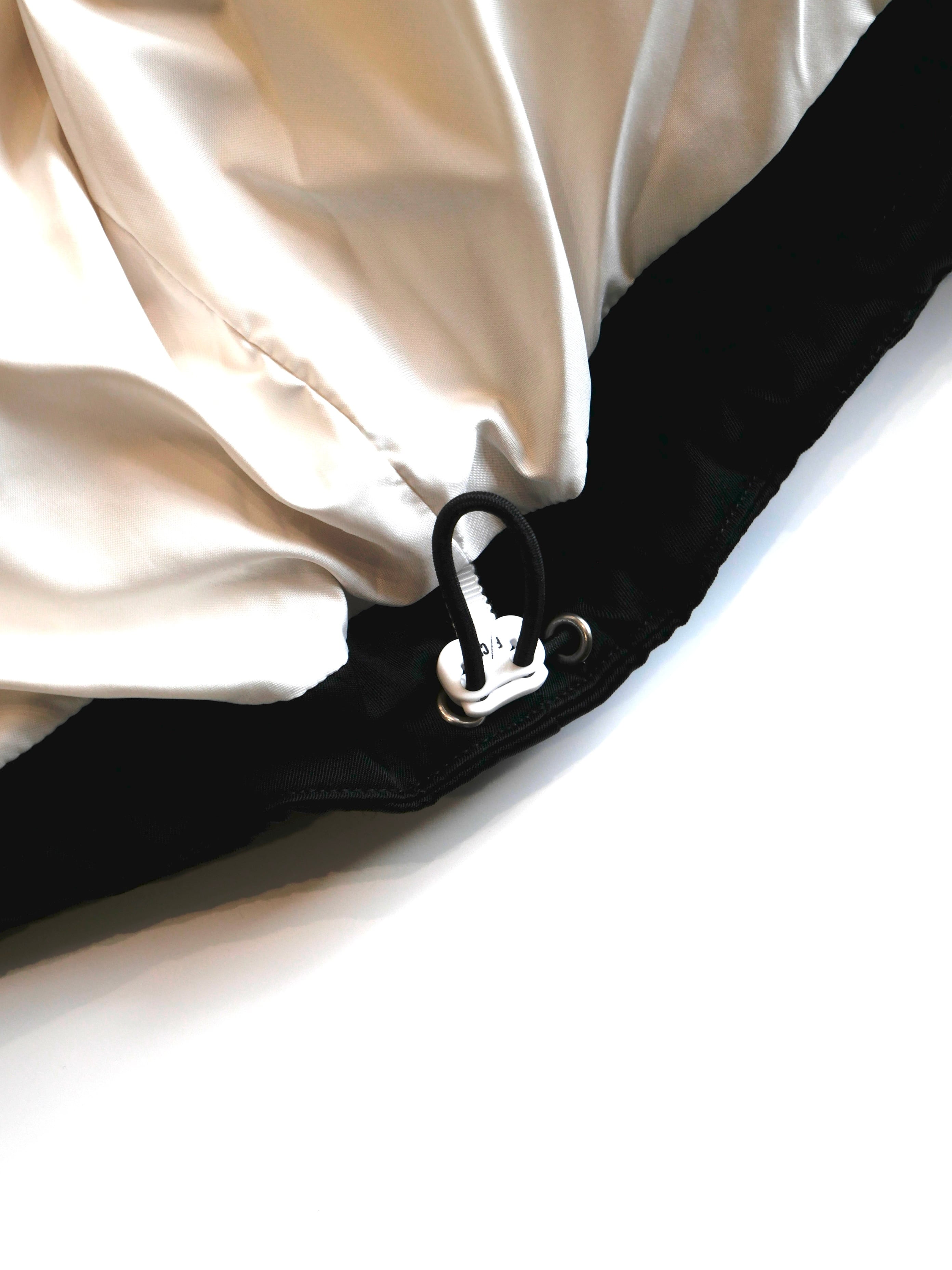 立体的なボリューム、丸みを帯びたシルエットはそのままに、ファスナーで着脱可能なフードを新たに採用しました。裾のスピンドルでシルエットの調節が可能。