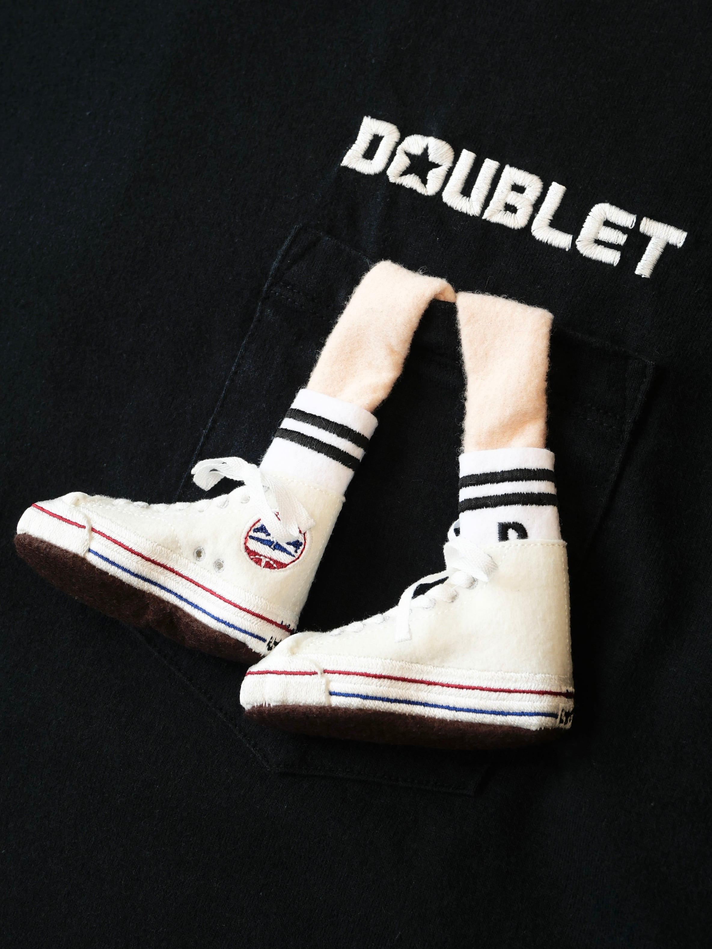 繊細な手芸によってリアルに再現された"JACK PARCELL ALL STAR "を履いている足が、胸ポケットから飛び出す独特なデザイン。また胸元にはワンポイントの今回のコラボ仕様のdoubletロゴ刺繍が施されています。