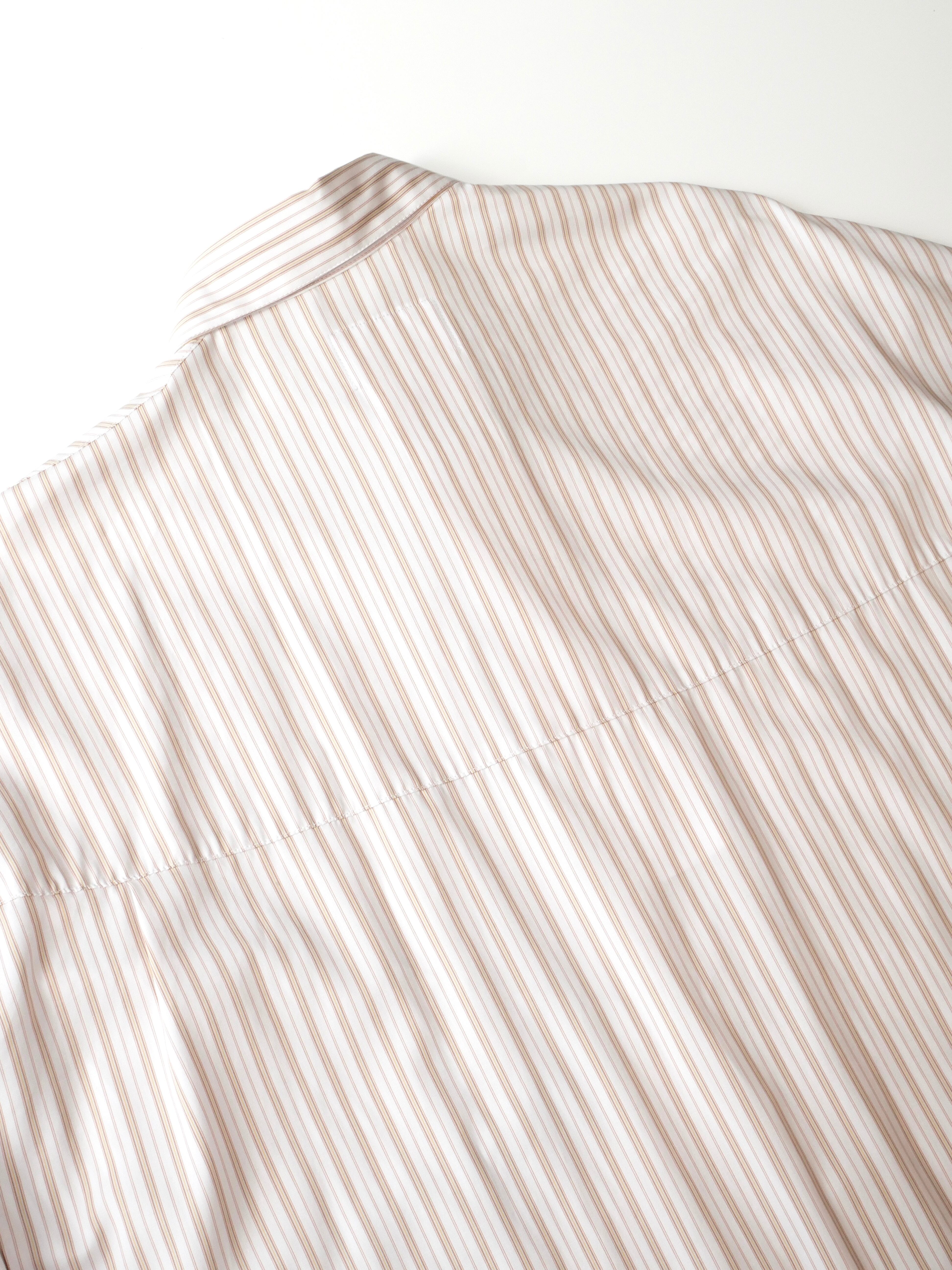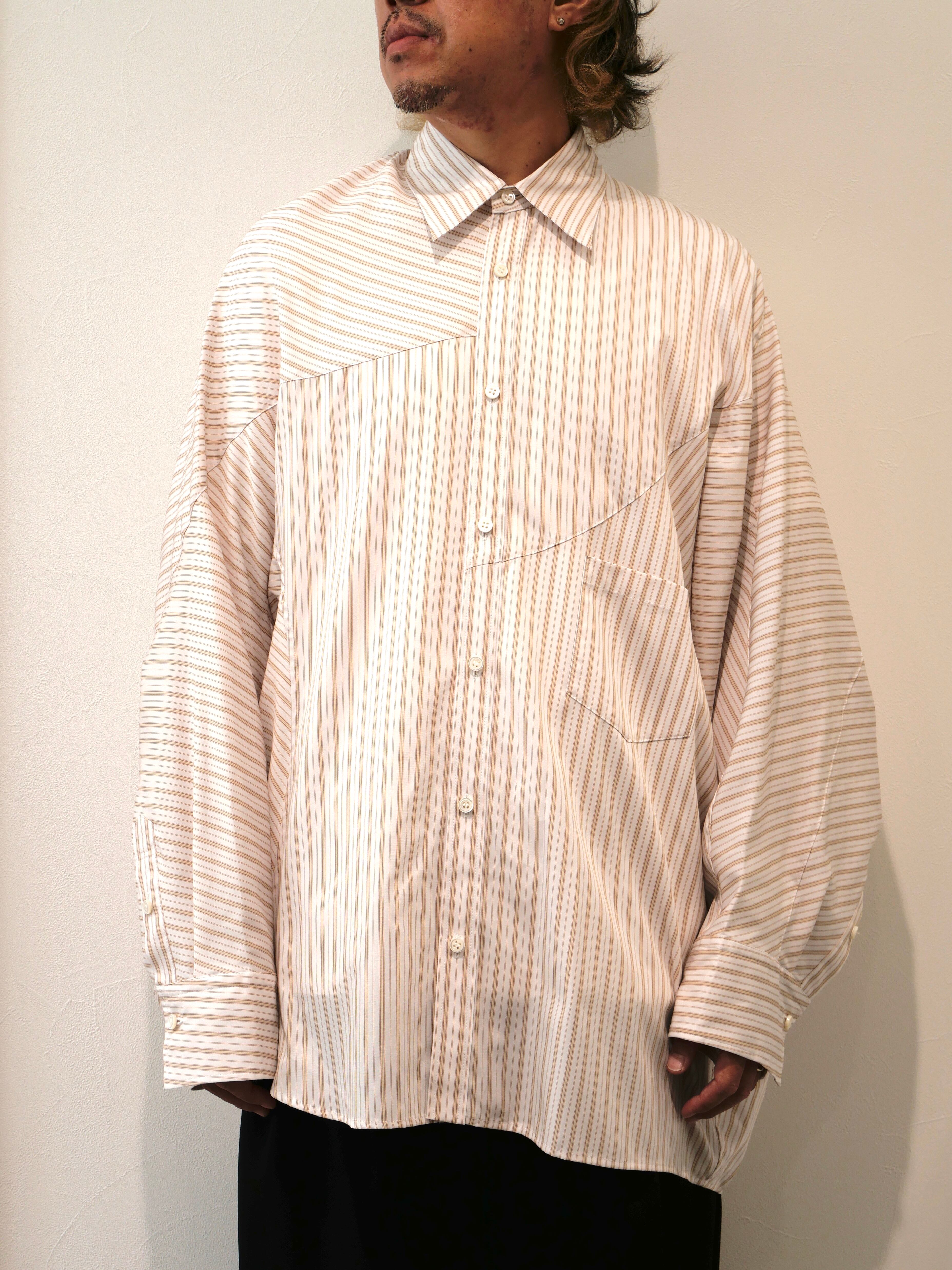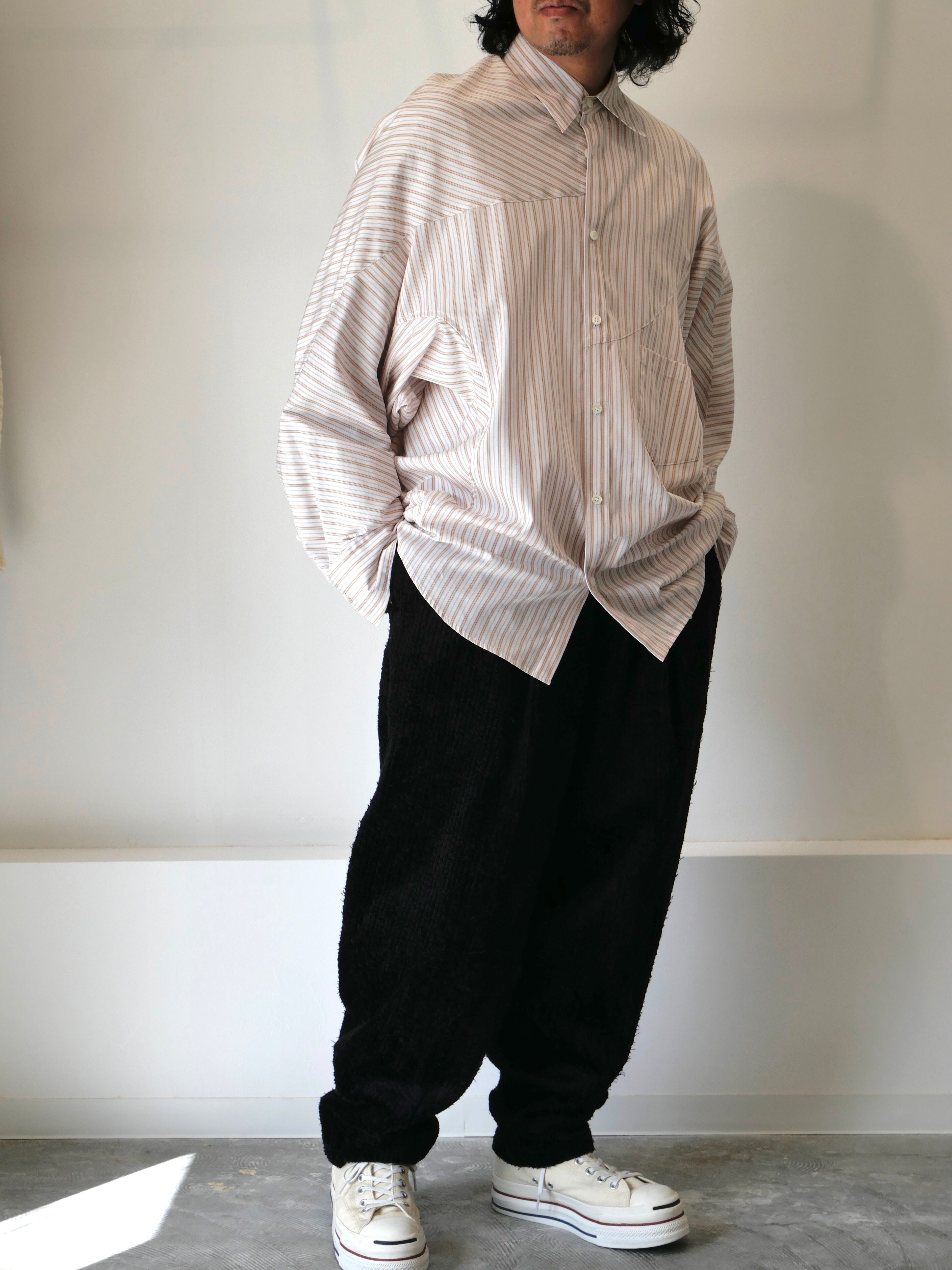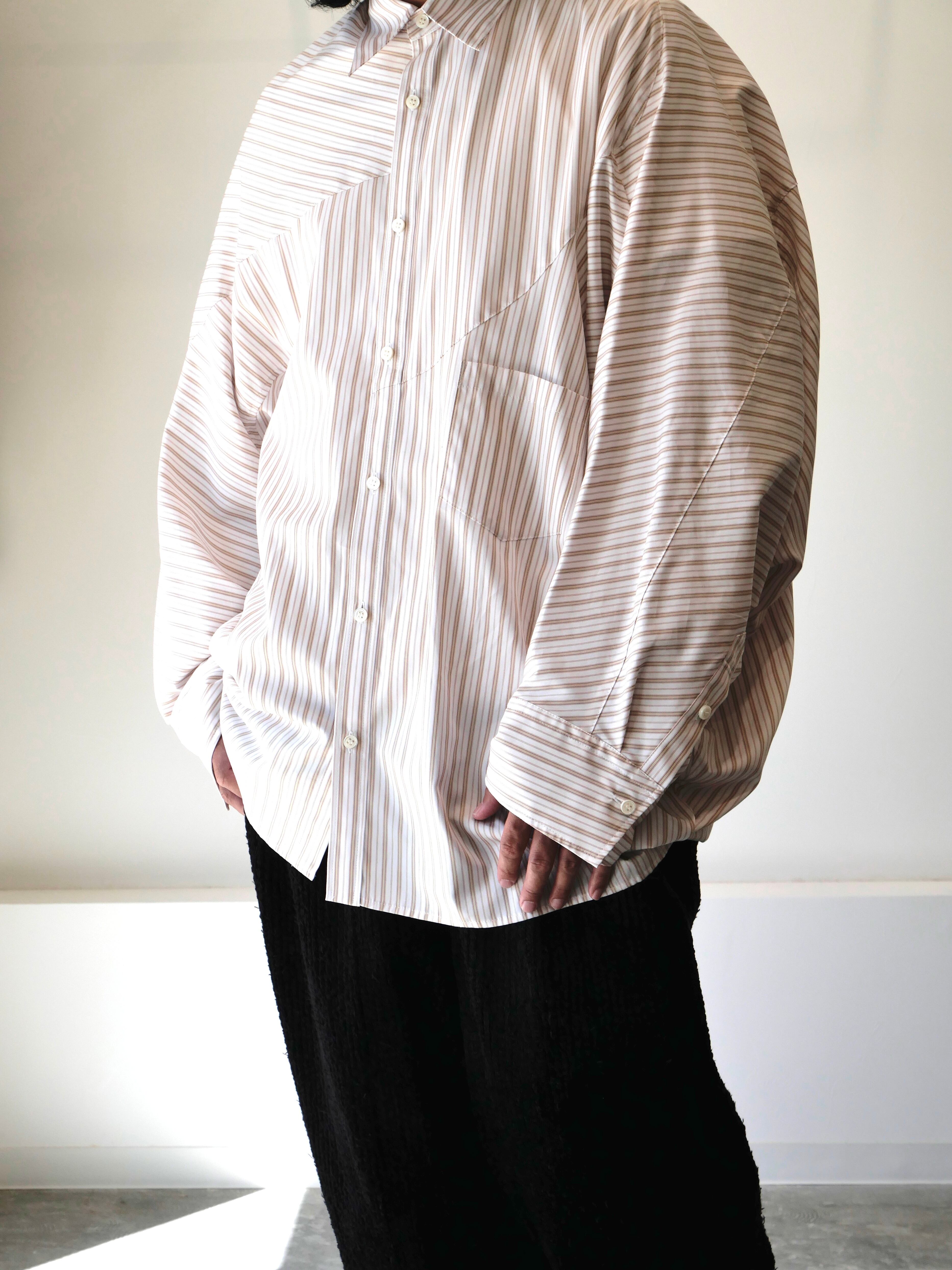 Synflux社の先端的なテクノロジーを駆使し、3Dモデリングしたシャツを、3パーツの平面パーツのみで構成し既存のシャツの脇線や肩線などの位置では切り替えし線を入れないアルゴリズムにより生成されたパターンにより独特なカッティングとなったこのシャツは、シャツの形は保ちながらも歪み、いびつな部分も見受けられます。