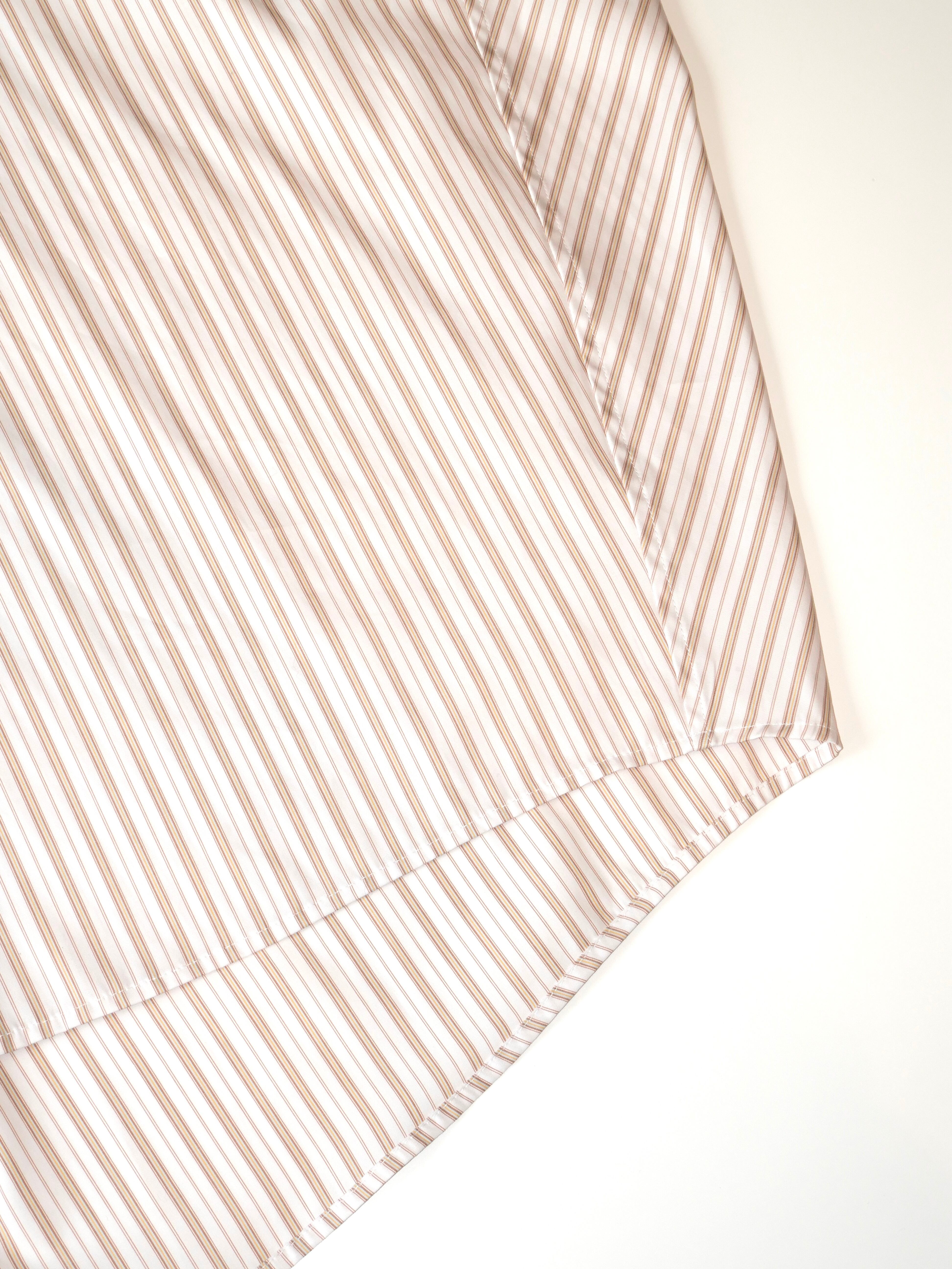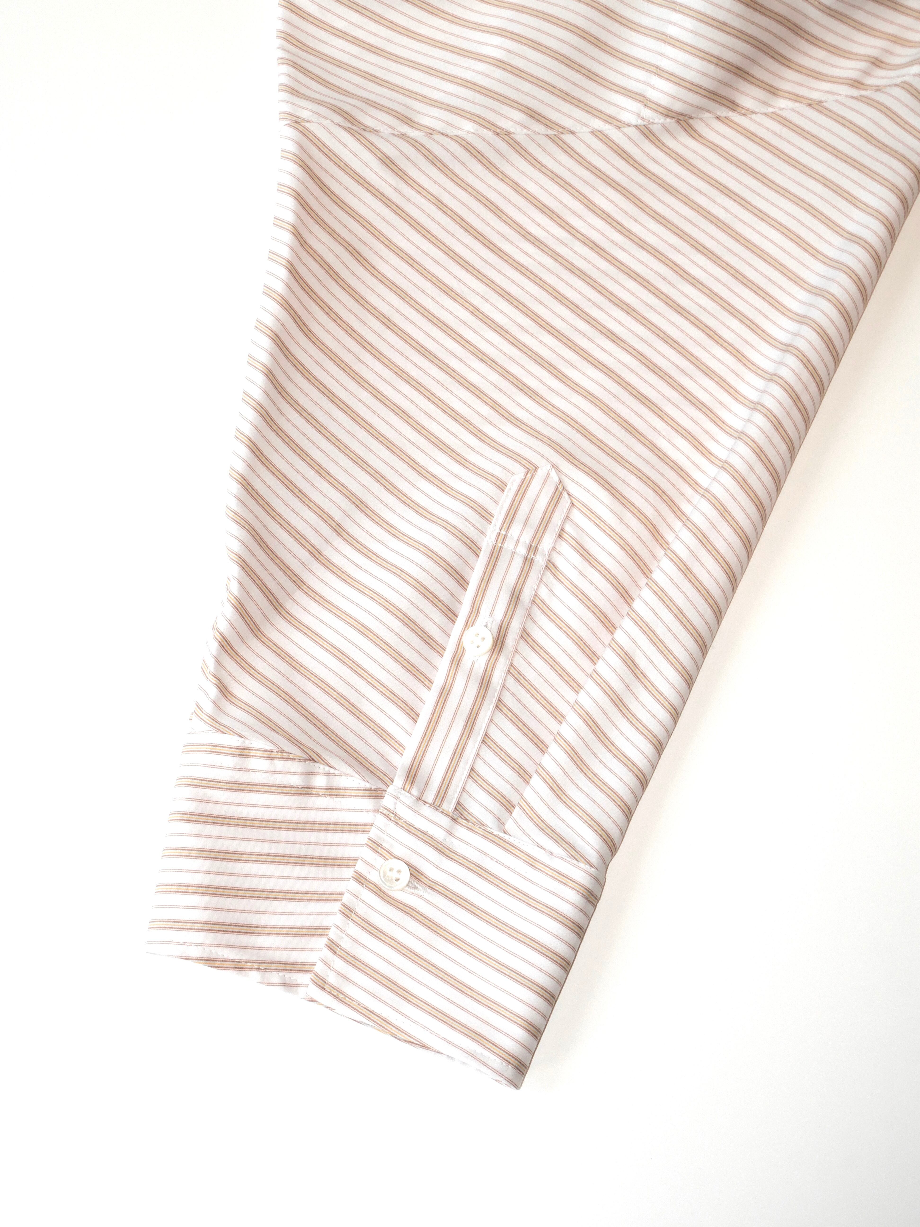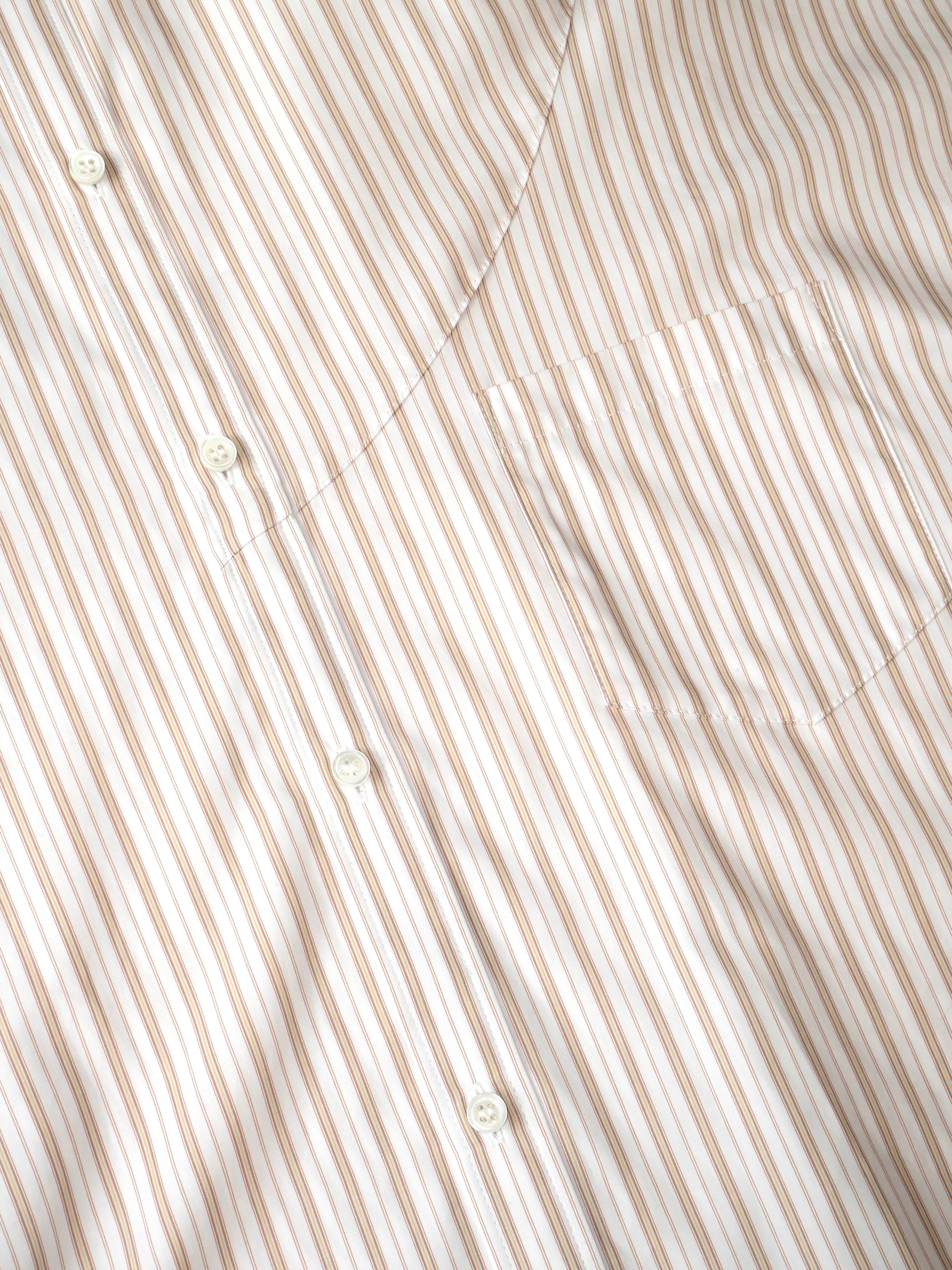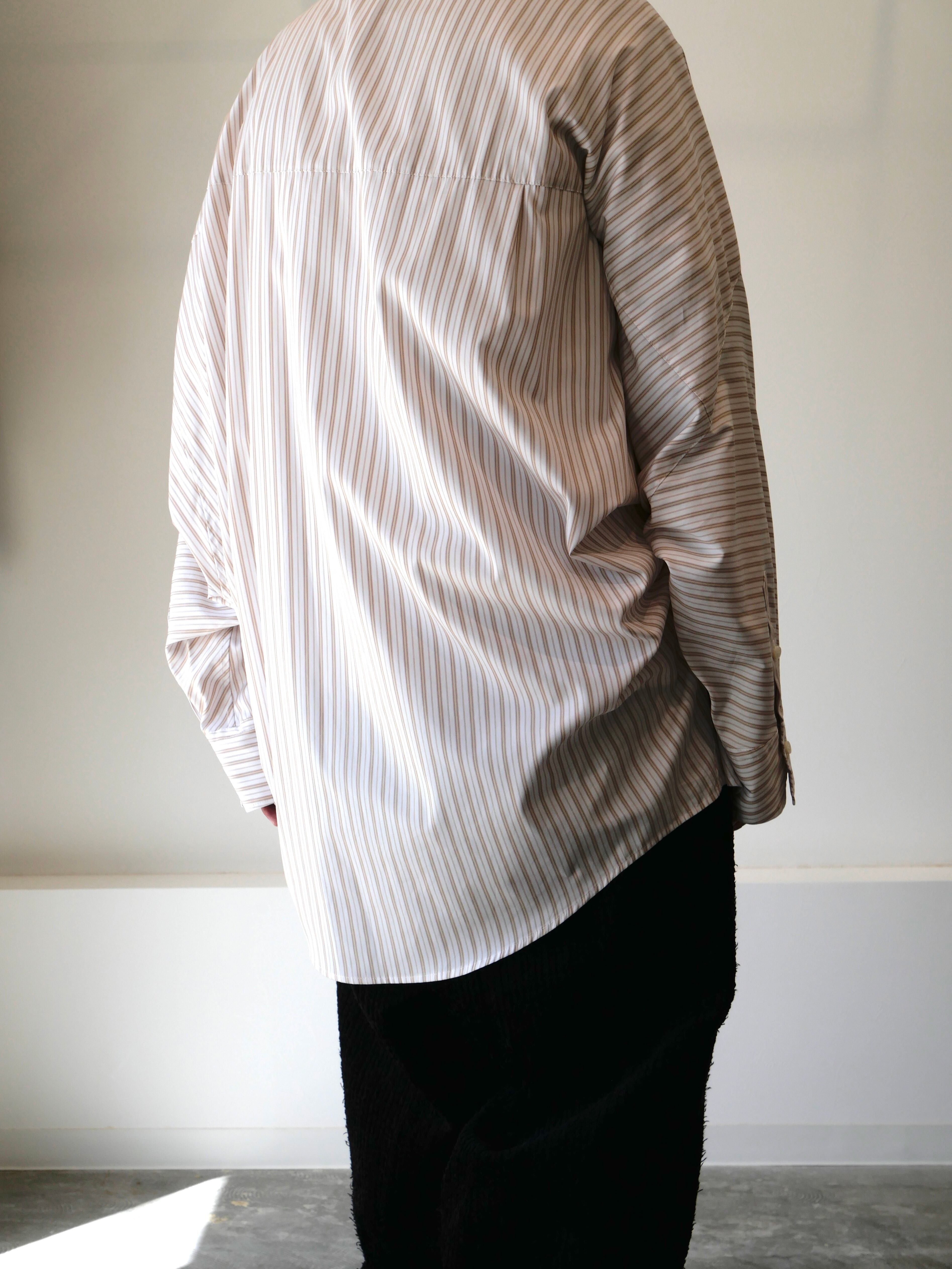 Synflux社の先端的なテクノロジーを駆使し、3Dモデリングしたシャツを、3パーツの平面パーツのみで構成し既存のシャツの脇線や肩線などの位置では切り替えし線を入れないアルゴリズムにより生成されたパターンにより独特なカッティングとなったこのシャツは、シャツの形は保ちながらも歪み、いびつな部分も見受けられます。