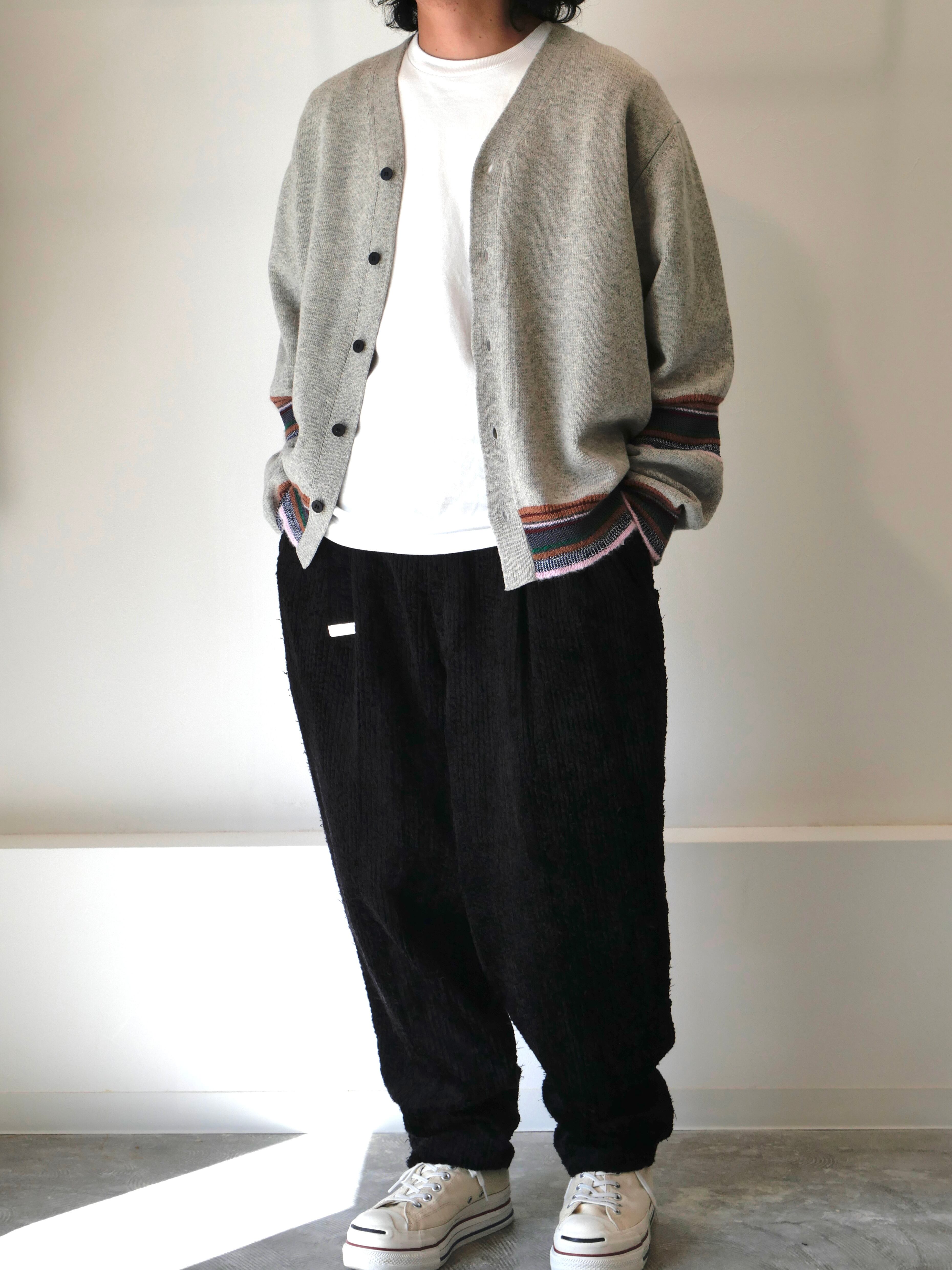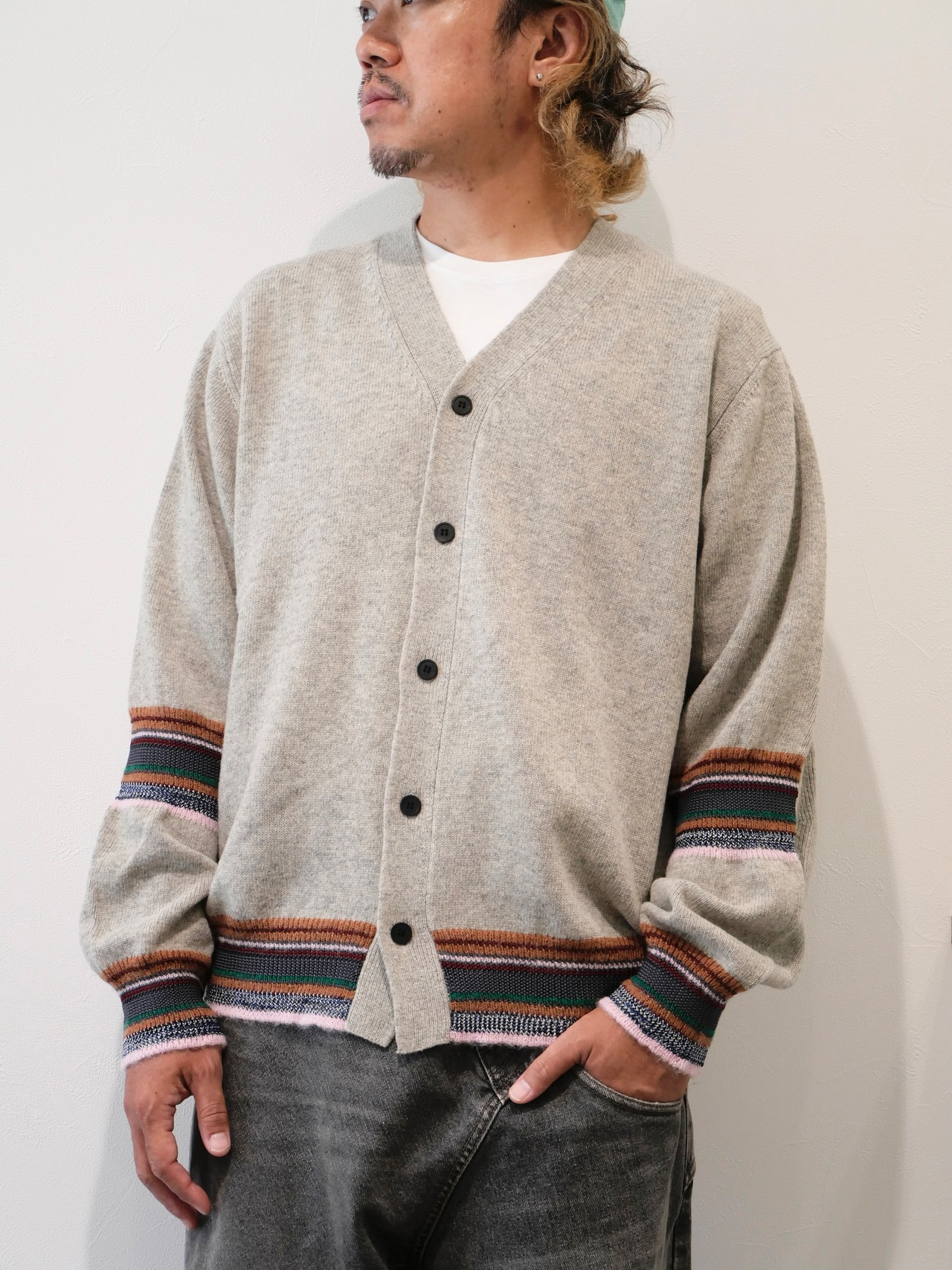 配色デザインの毛カーディガン。