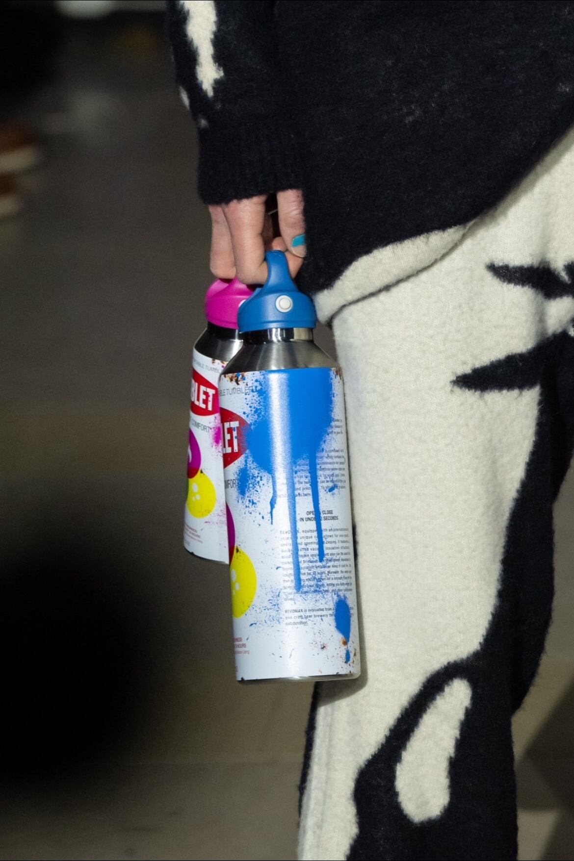 アメリカ発の真空断熱ボトルブランド〈REVOMAX〉とのコラボレーションによって生まれた、スプレー缶のようなデザインのウォーターボトルです。グラフィティカルチャーに見られるストリートの空気感を感じさせるデザインとカラーリングが特徴です。片手で開閉できるユニークなキャップ構造と、高い保温・保冷性能を備えており、炭酸飲料も使用できます。