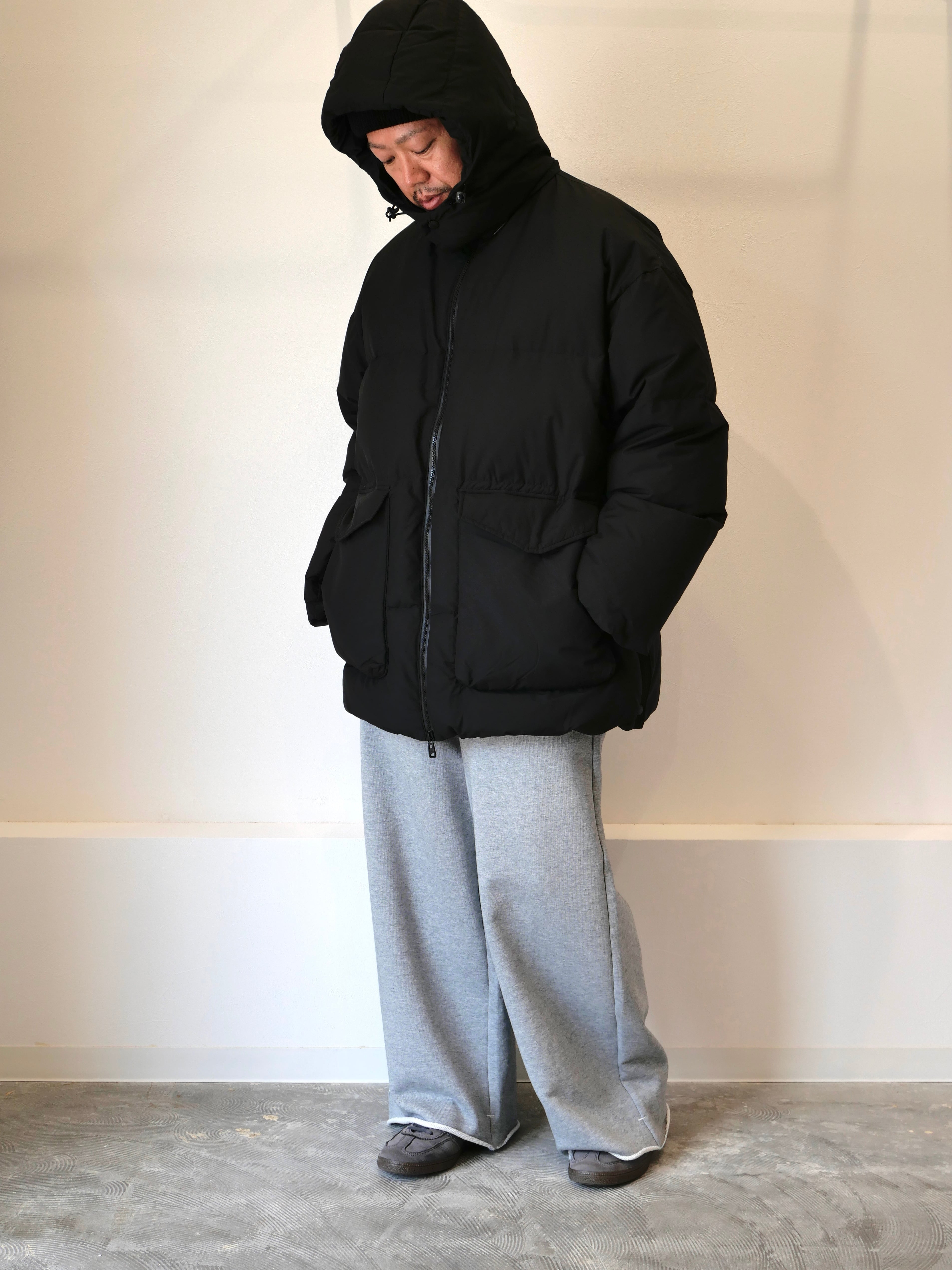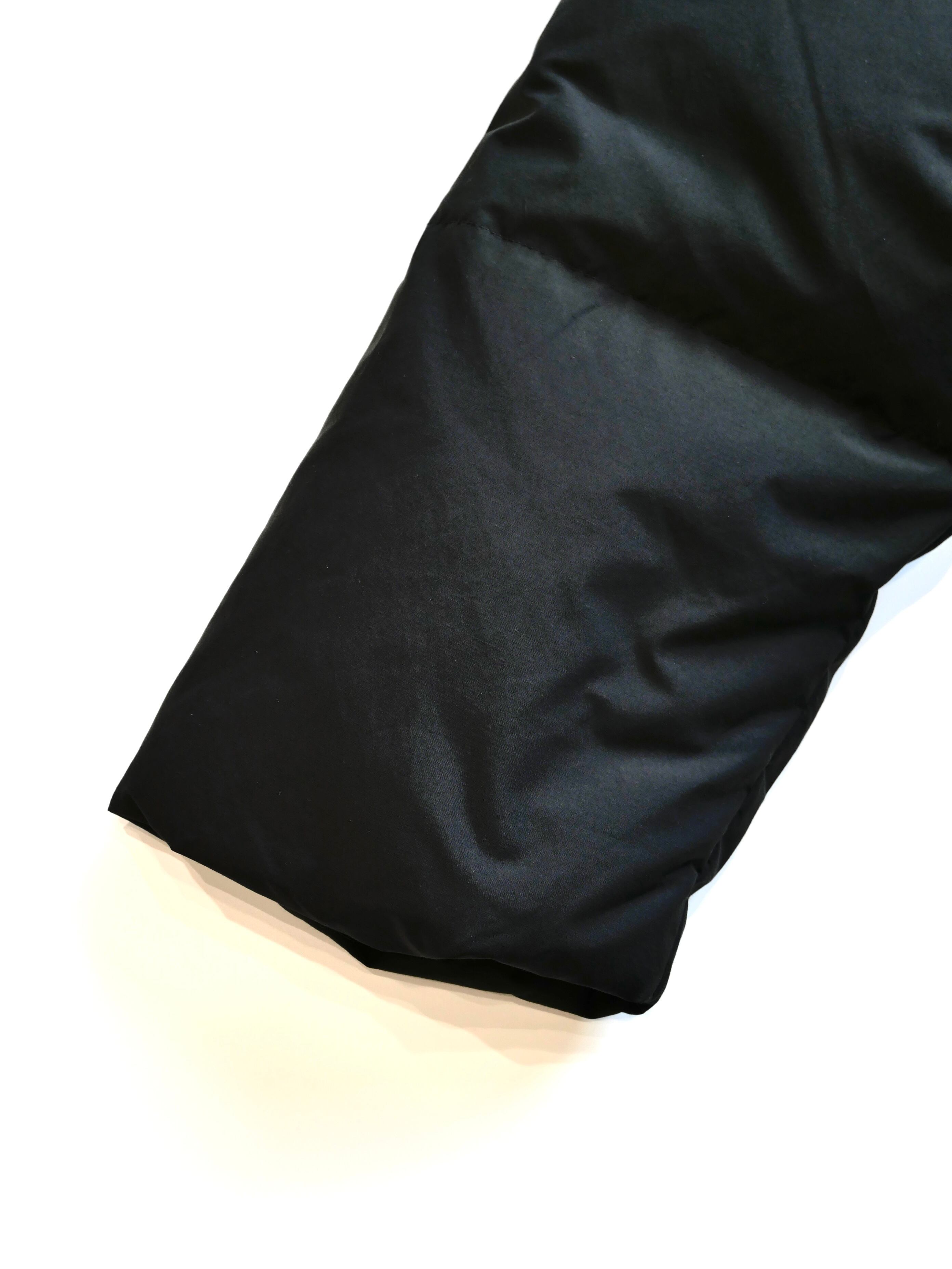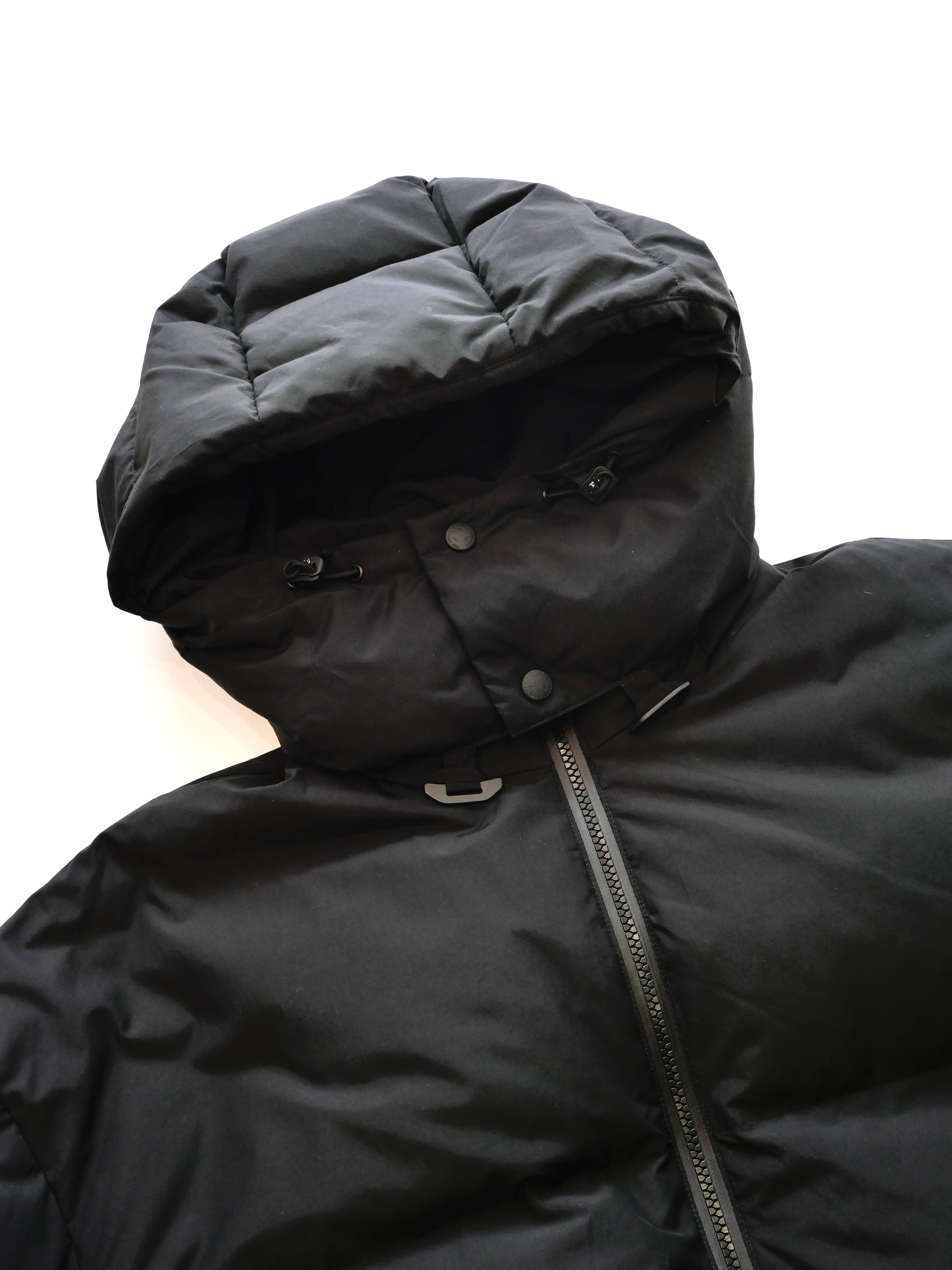 ジャケットや寝袋、布団から羽毛を回収し、丁寧に再洗浄された650フィルパワーのダウン、素材はリサイクルナイロンを使用した、ダウンフードブルゾン。