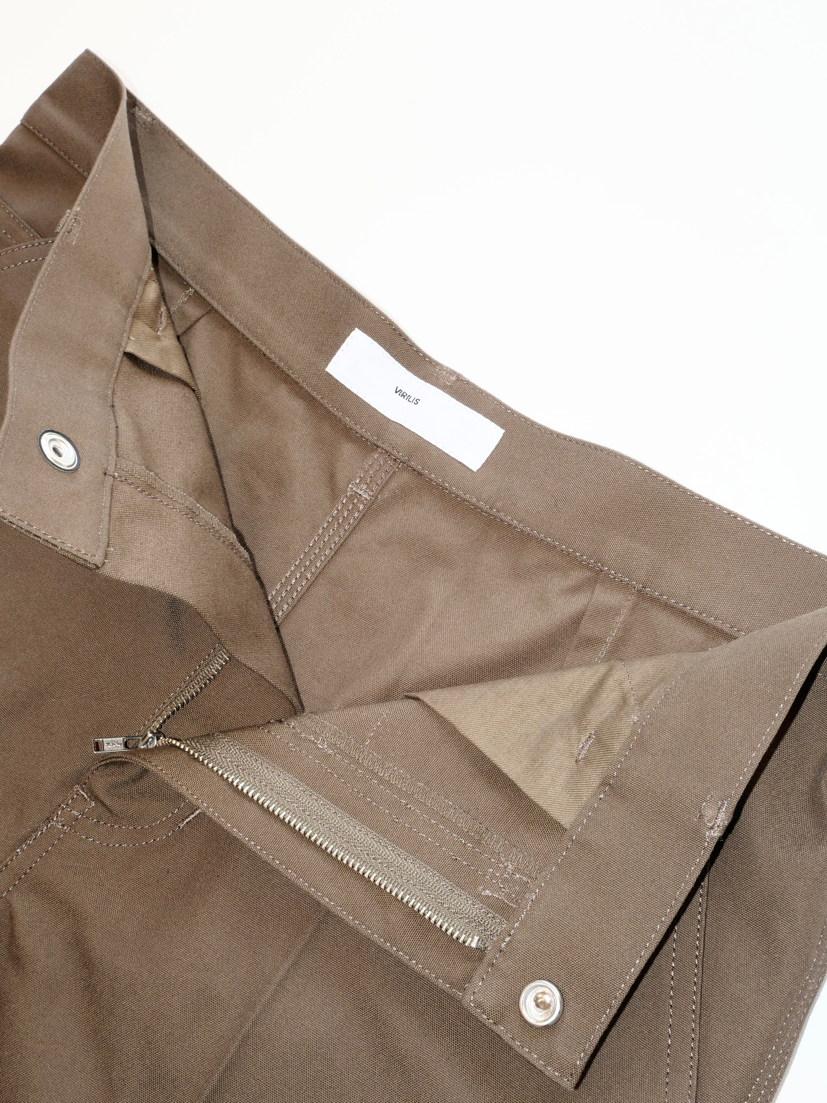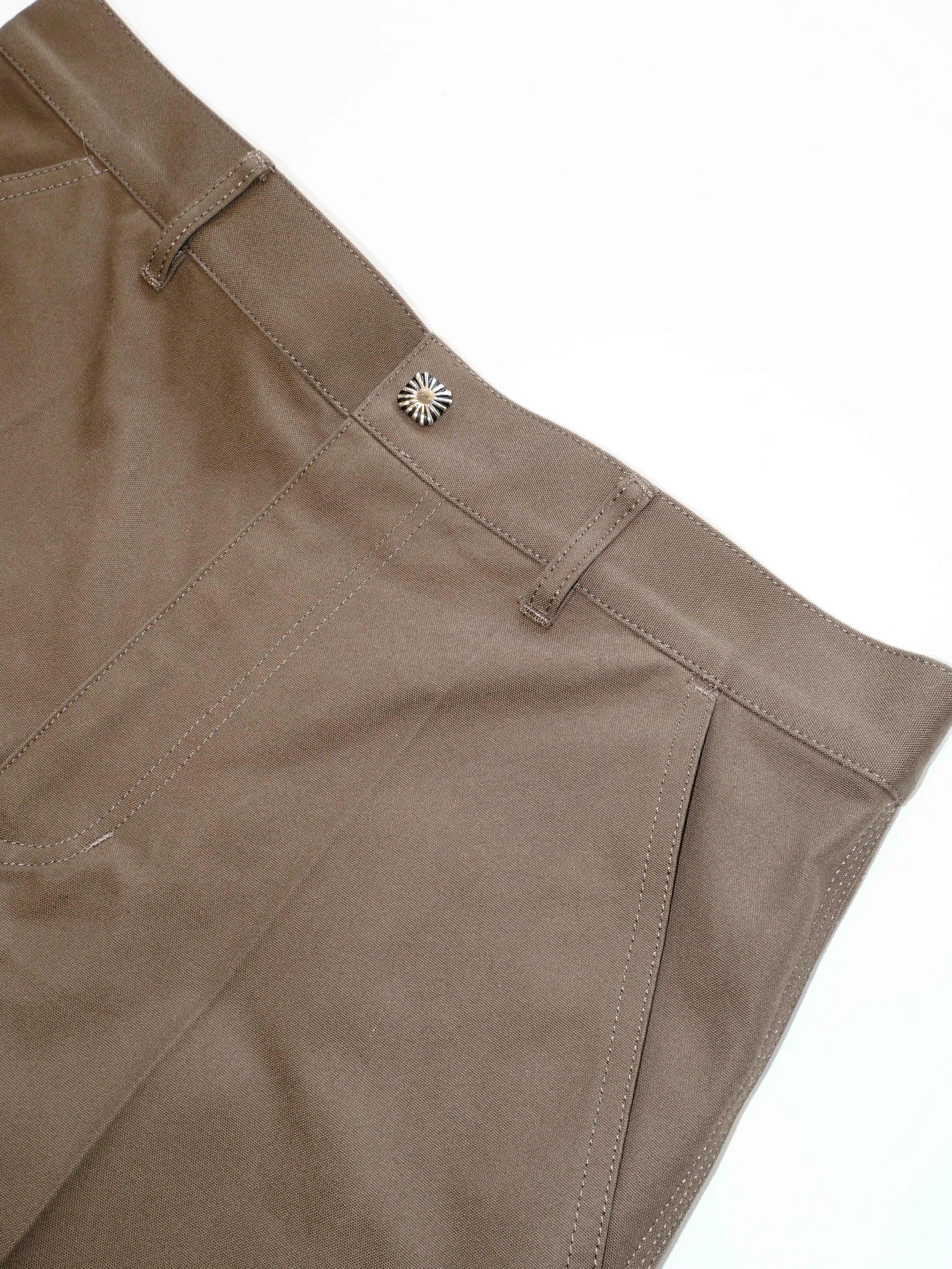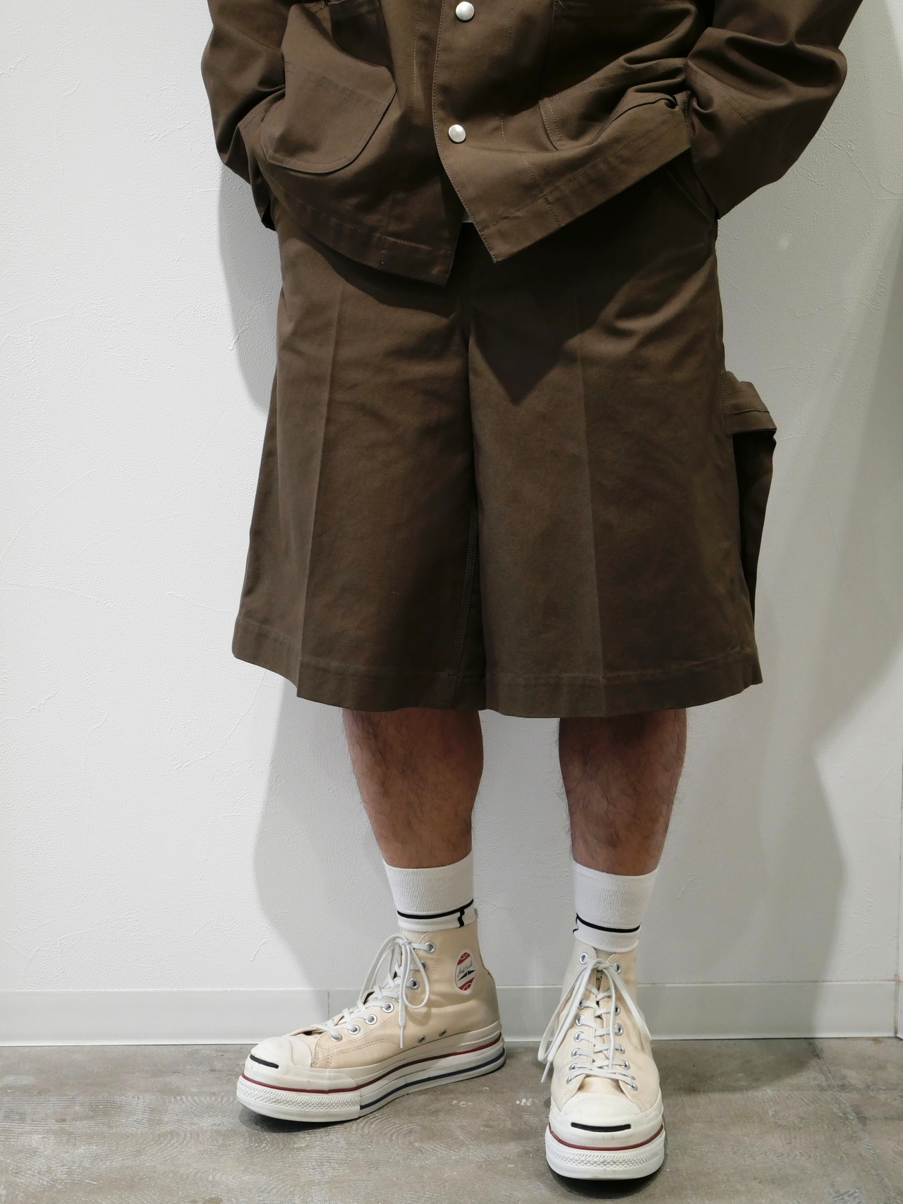 センタープレスや裾にかけて広がりを見せるパターン、フロントボタンのメタルパーツなどトーガらしいアレンジで上品なワークショーツにアップデートされた一着です。