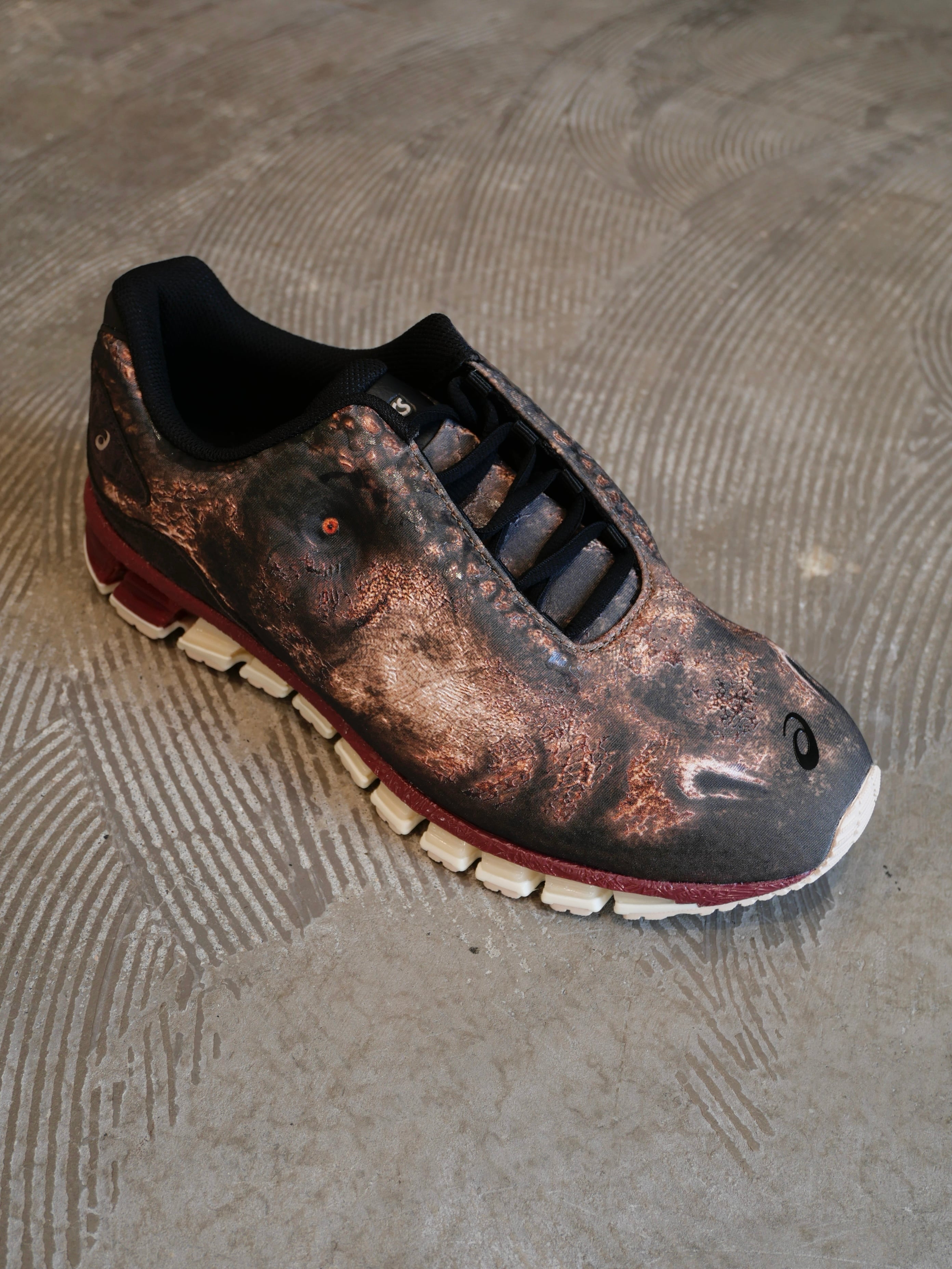 今回のコラボレーションのテーマは「ジュラ紀の世界観」です。アッパー全体には恐竜の頭部を描いた大胆なグラフィックプリントを配置。3Dプリント加工によって恐竜の肌のような凹凸感を表現し、さらにウレタン素材の立体的な配置で、まるで恐竜頭部の輪郭が浮かび上がるような設計が特長です。これはアシックスが追求してきた精緻な成形技術と機能美によって生まれたディテールとなっており、遊び心のあるデザインの奥に確かなスポーツテクノロジーが反映されています。