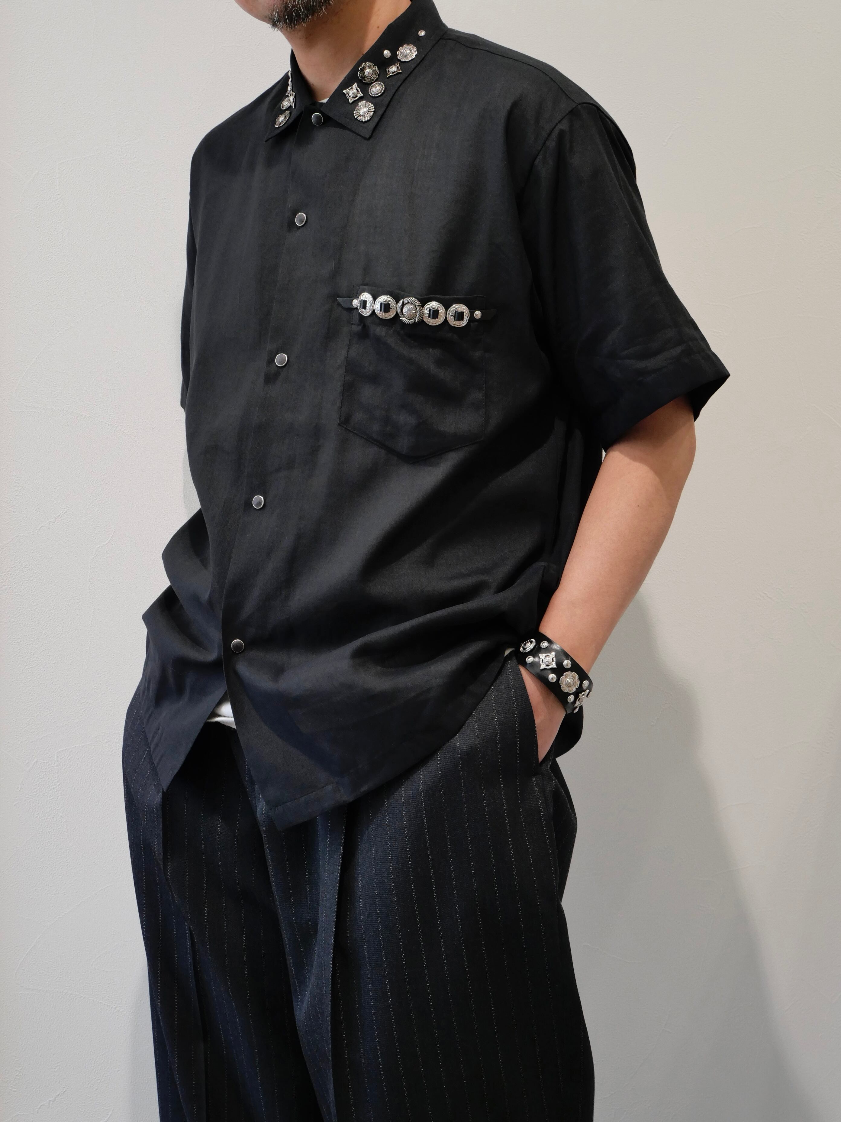 襟部分とポケット部分に定番のスタッズやコンチョが施された開襟シャツです。