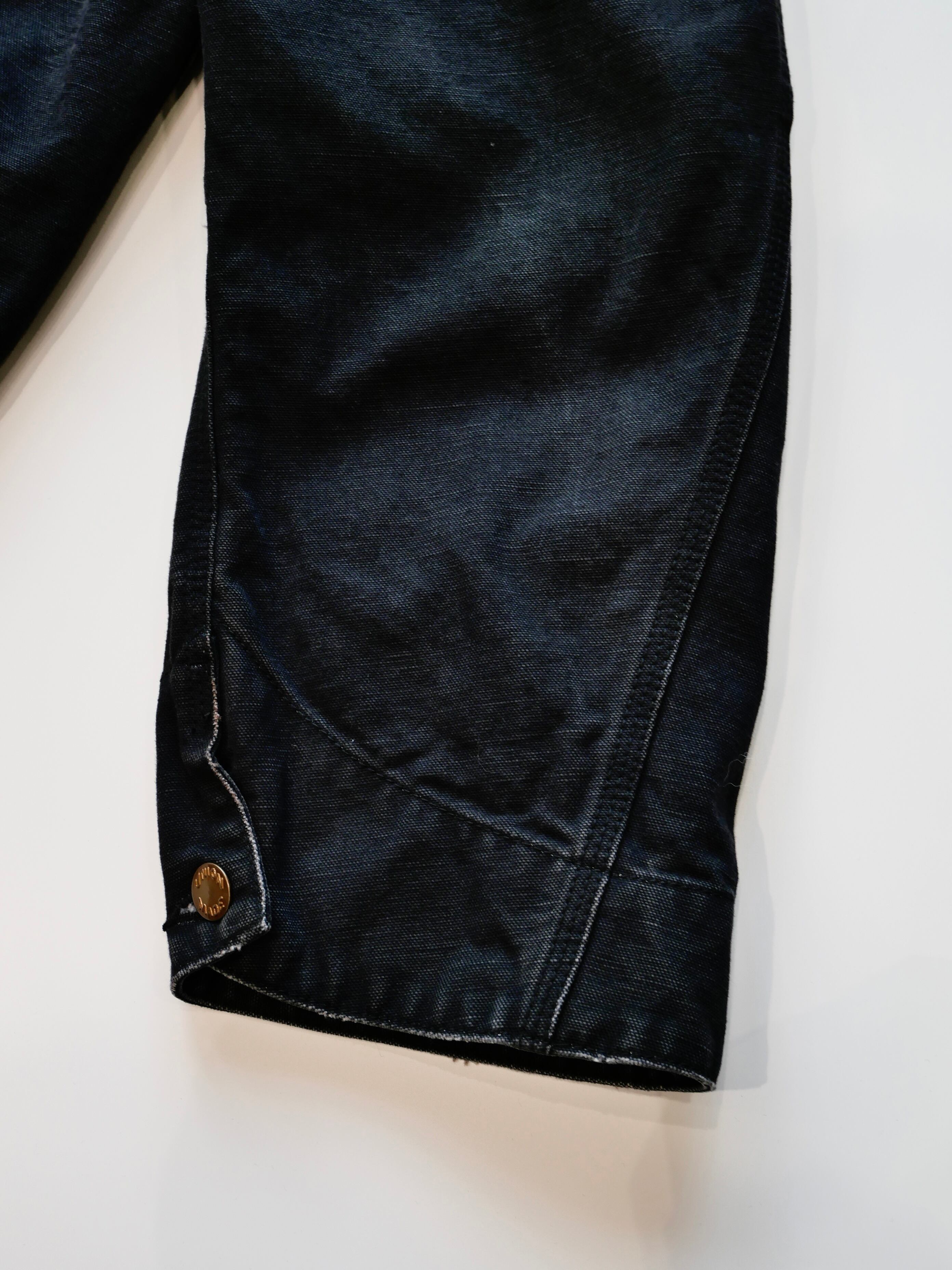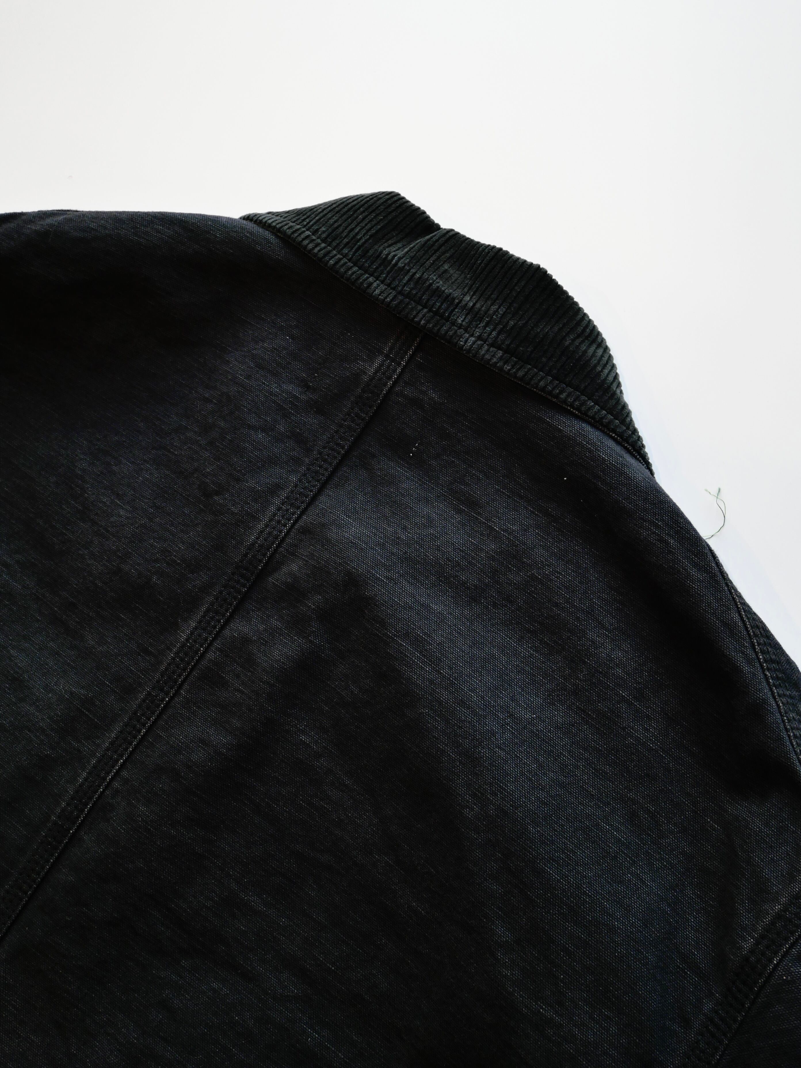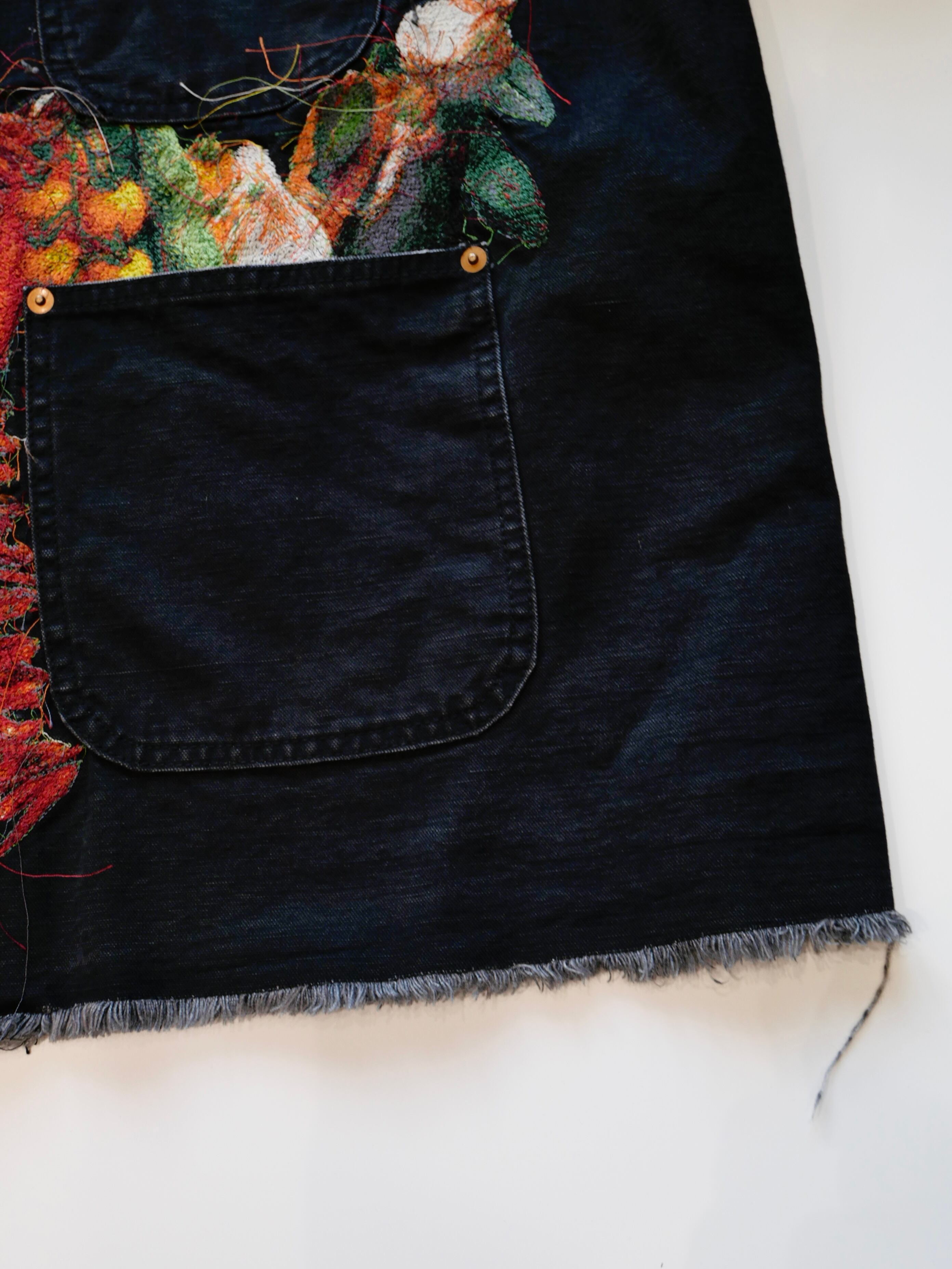 製品染めと洗いをかけたダック生地に、玉ねぎ、人参、ピーマン、にんにく、赤唐辛子、茄子などの野菜をリアルな刺繍で施したワークジャケット。ヴィンテージの作業着のような無骨なシルエットと、あふれ出しそうな野菜たちの鮮やかさが対比を生んでいます。