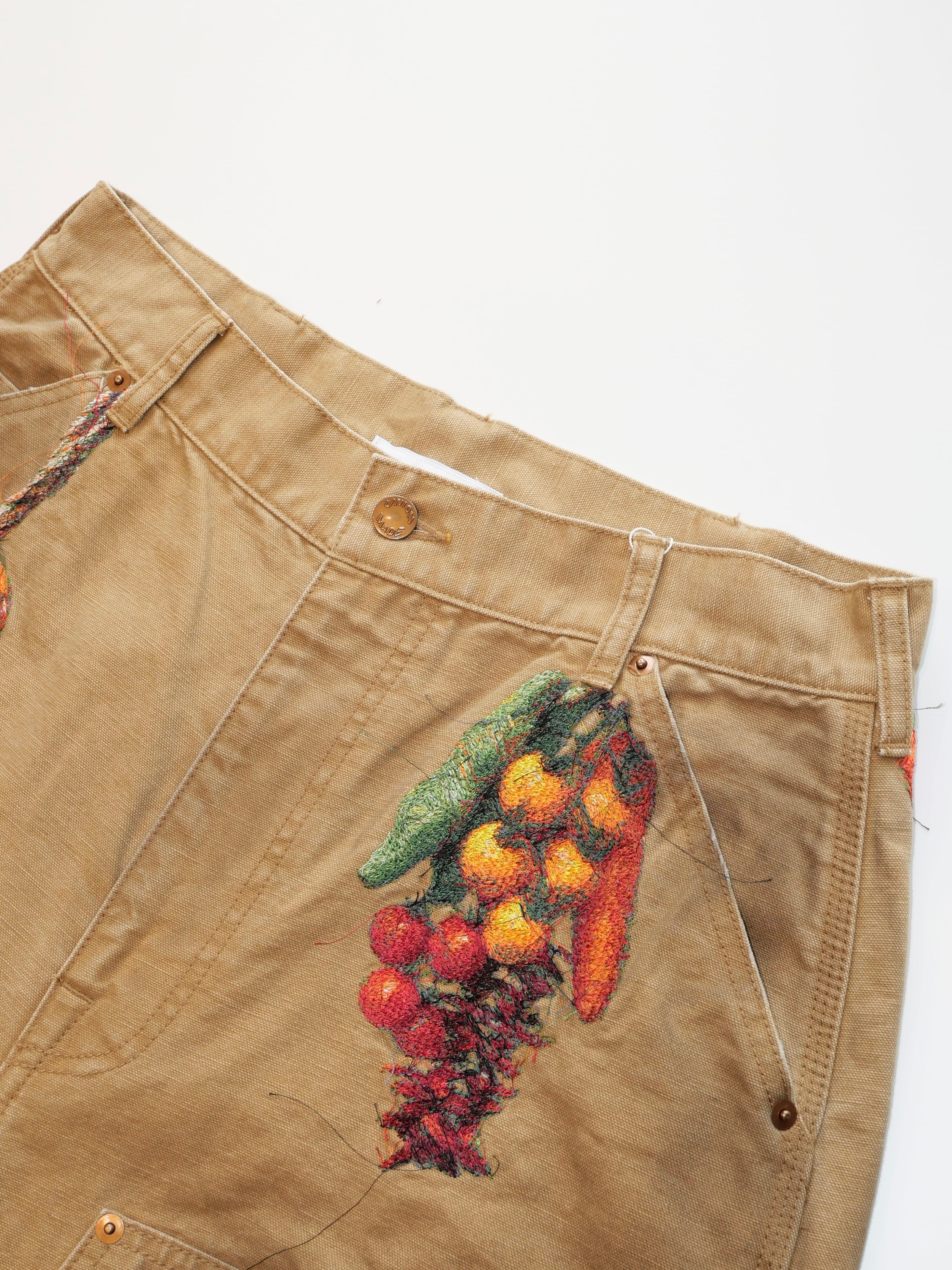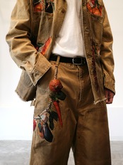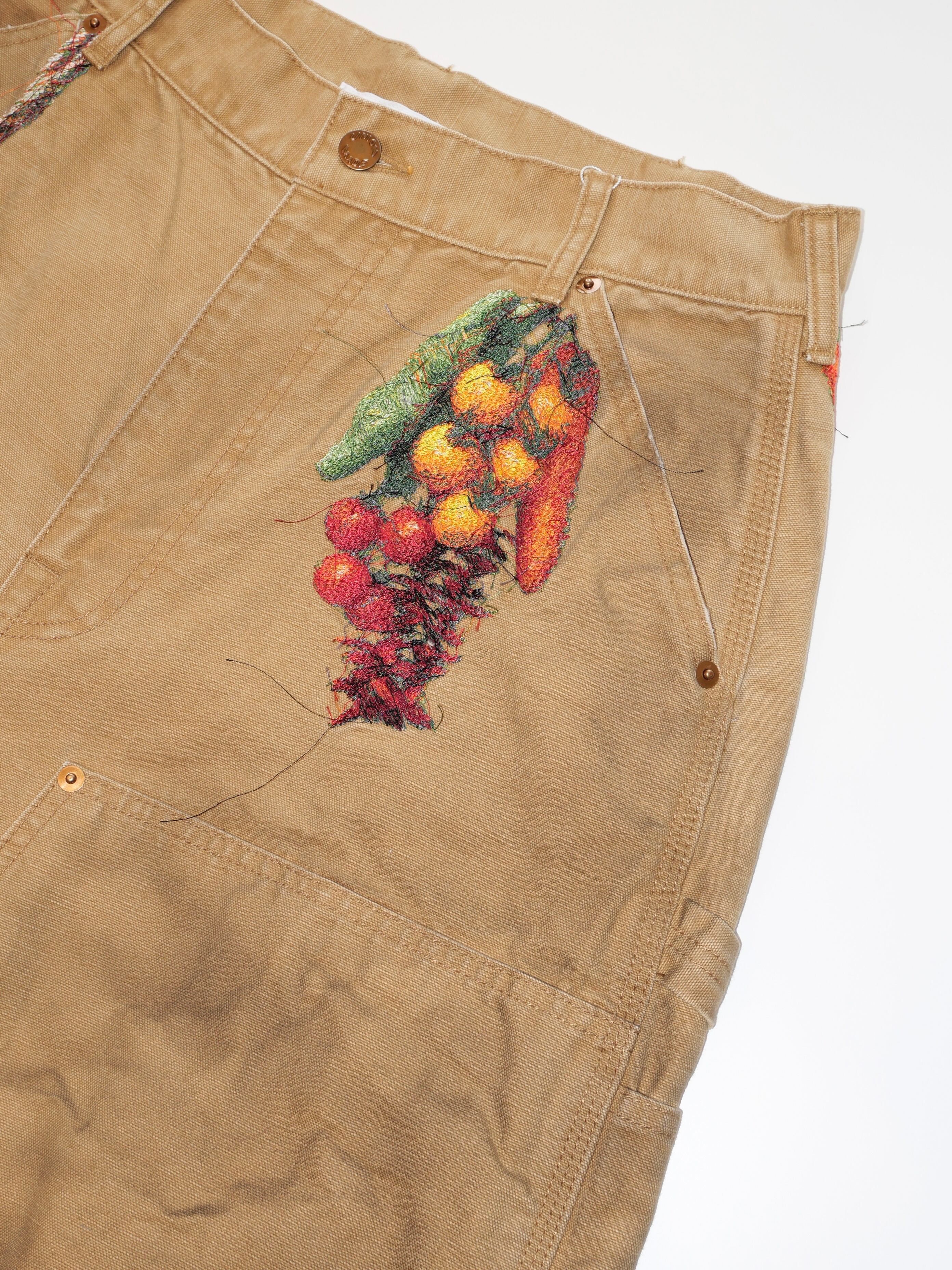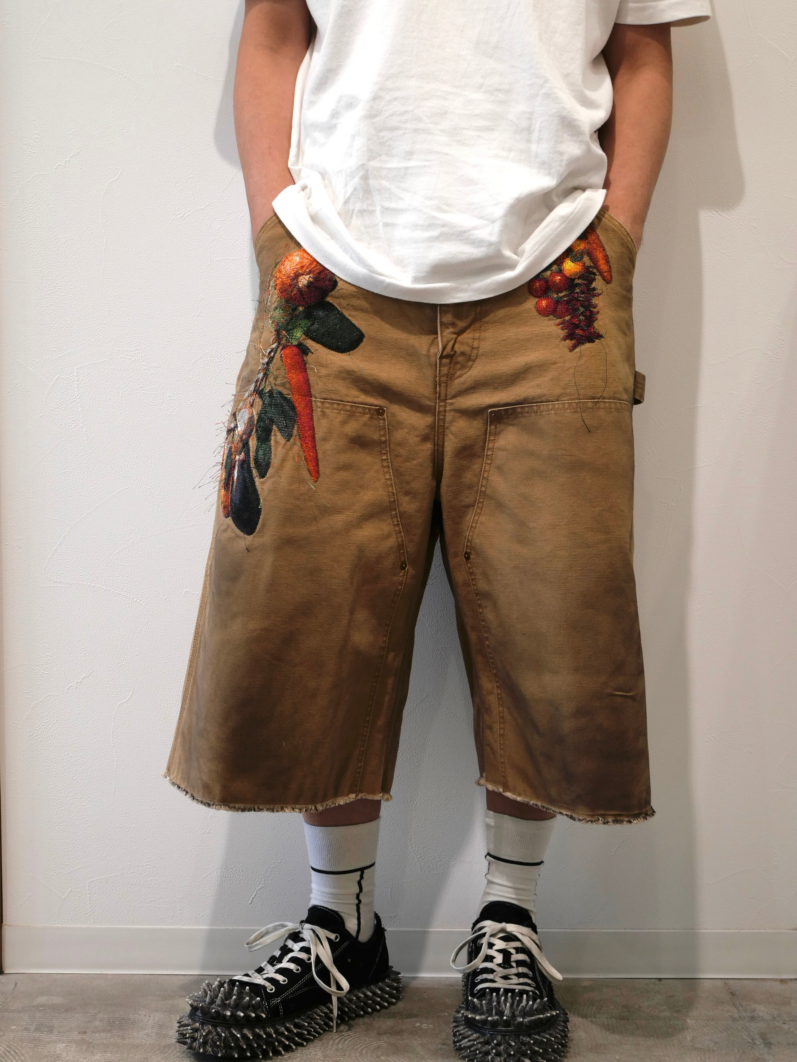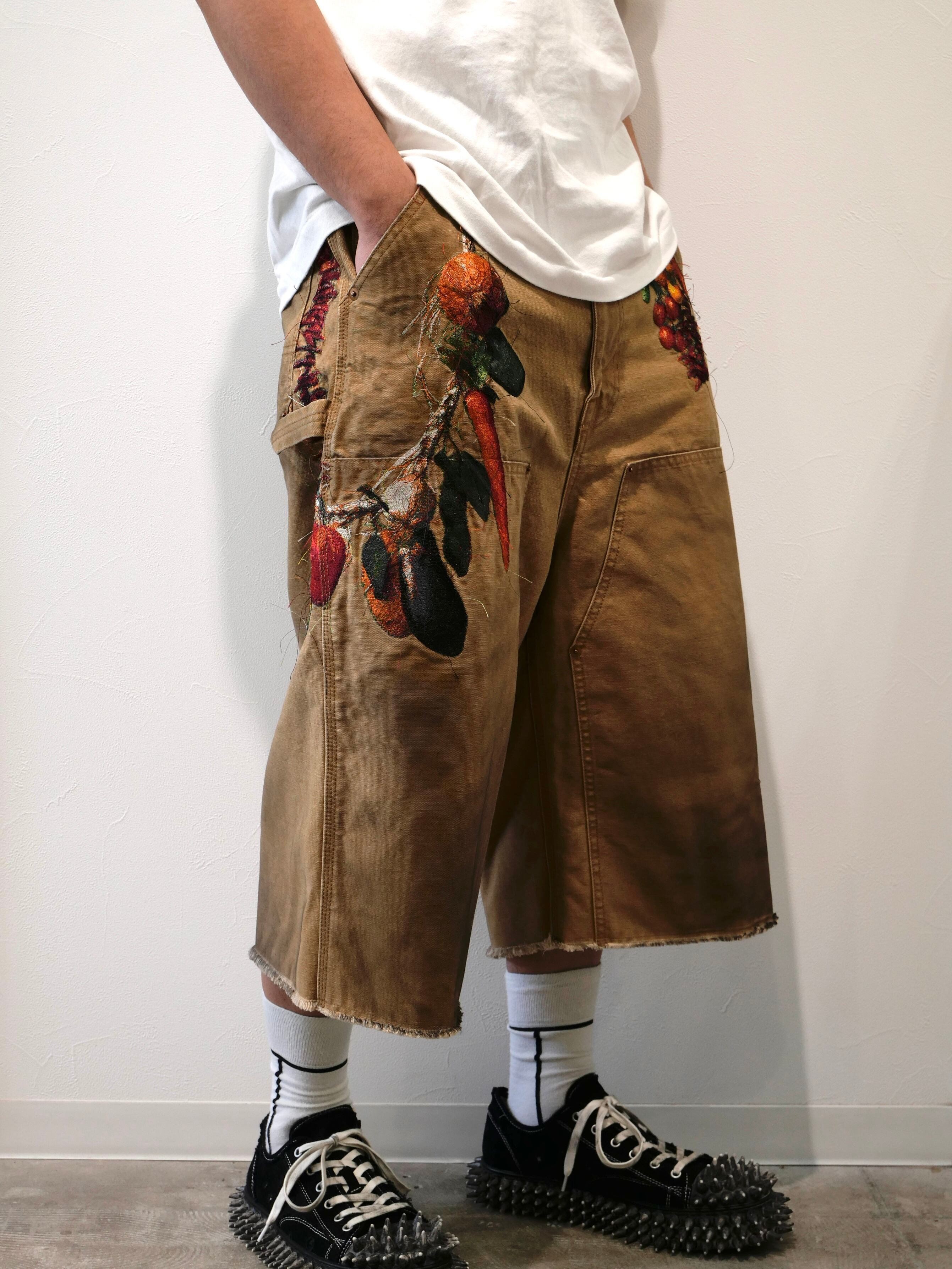 製品染めを施したダック生地のカットオフパンツに、玉ねぎ、人参、ピーマン、にんにく、赤唐辛子、茄子などの野菜刺繍を配置。ポケットからはみ出すだけでなく、ベルトループから吊るされたようにも見える仕掛けで、収穫カゴをそのまま腰にぶら下げたような一本です。