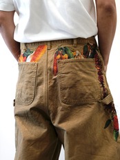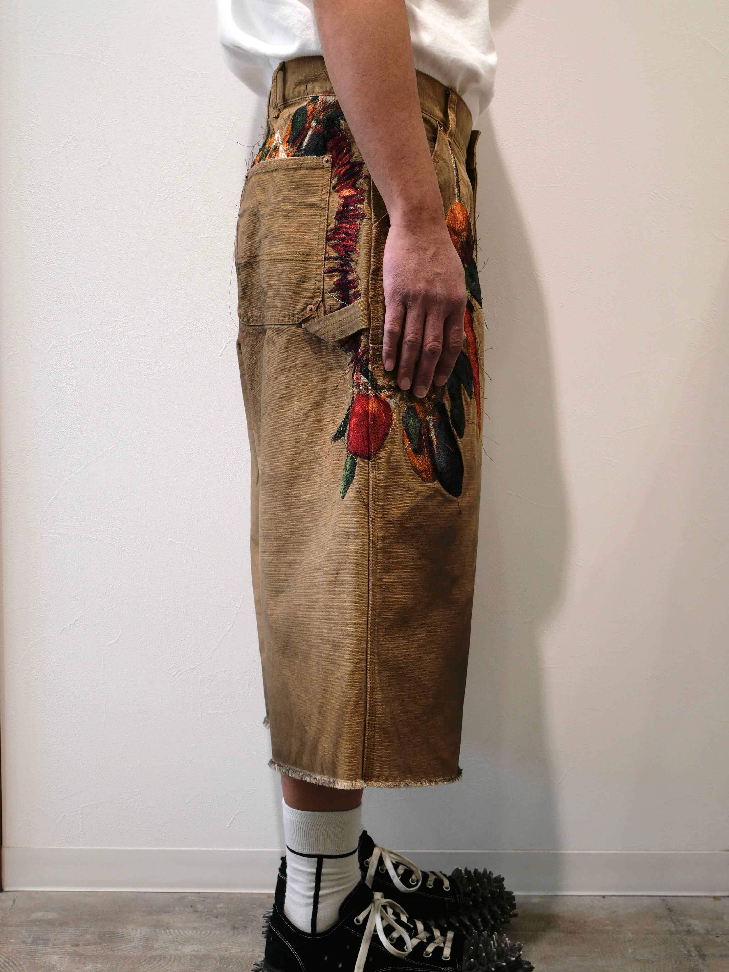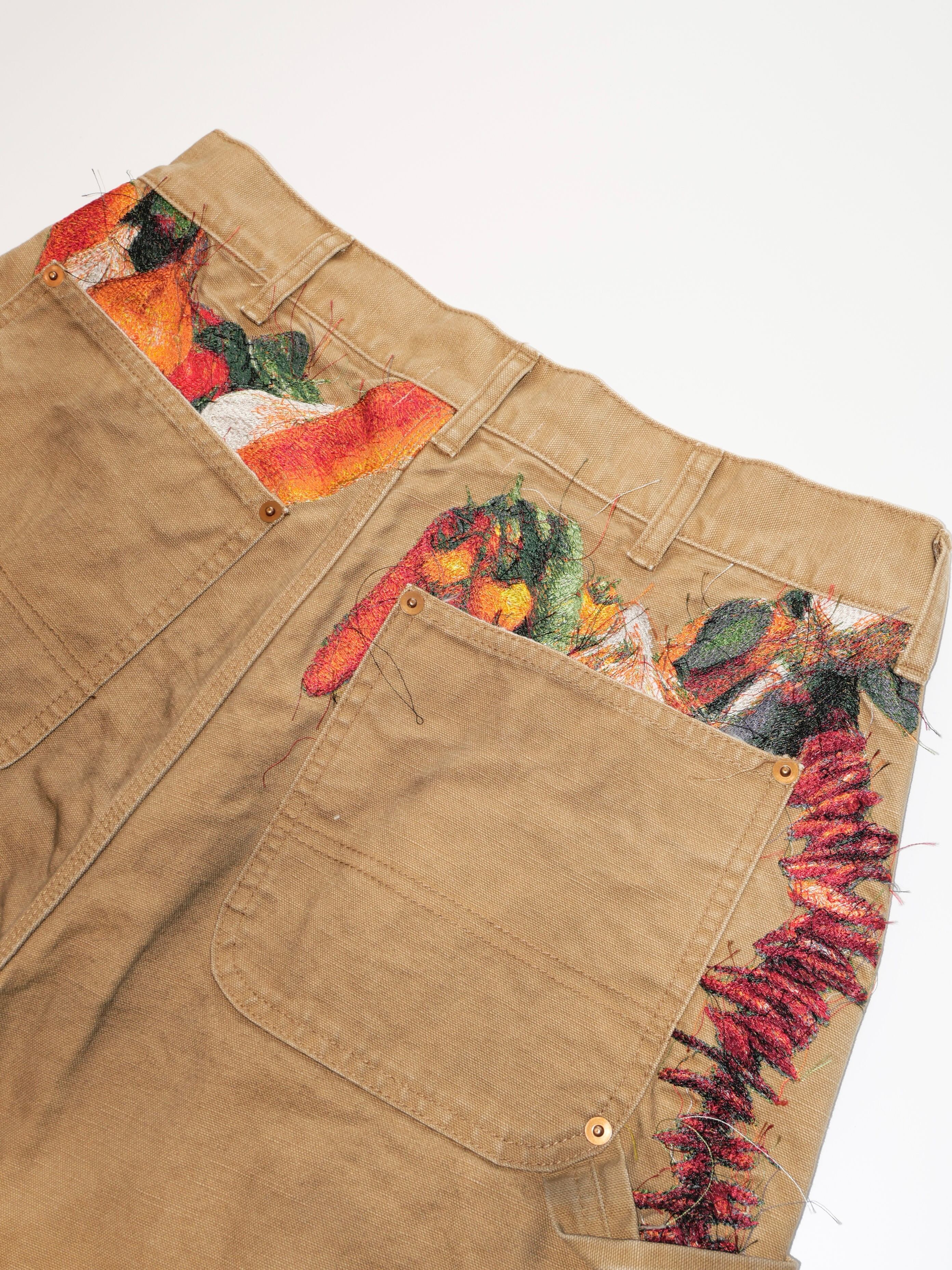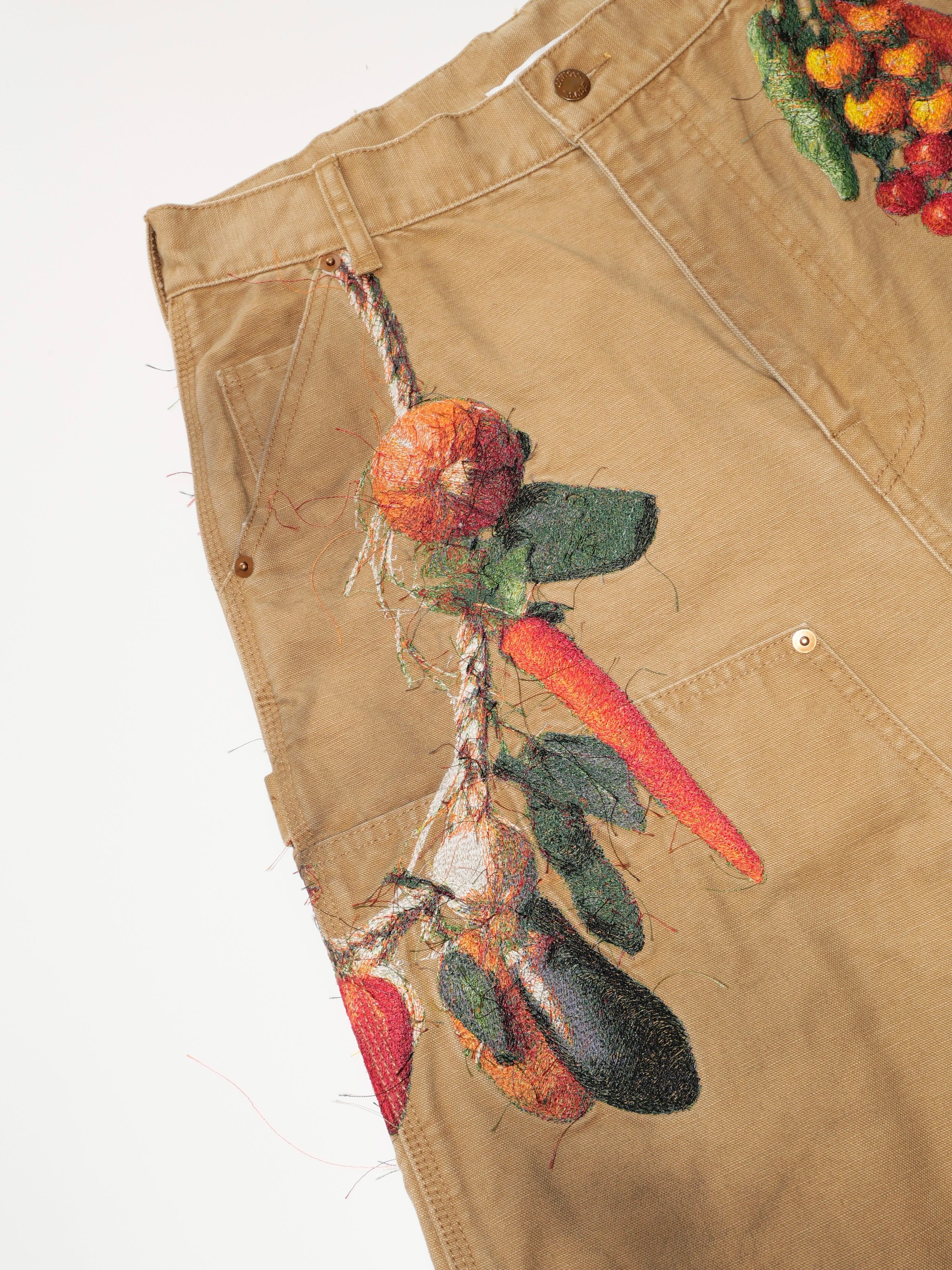 製品染めを施したダック生地のカットオフパンツに、玉ねぎ、人参、ピーマン、にんにく、赤唐辛子、茄子などの野菜刺繍を配置。ポケットからはみ出すだけでなく、ベルトループから吊るされたようにも見える仕掛けで、収穫カゴをそのまま腰にぶら下げたような一本です。