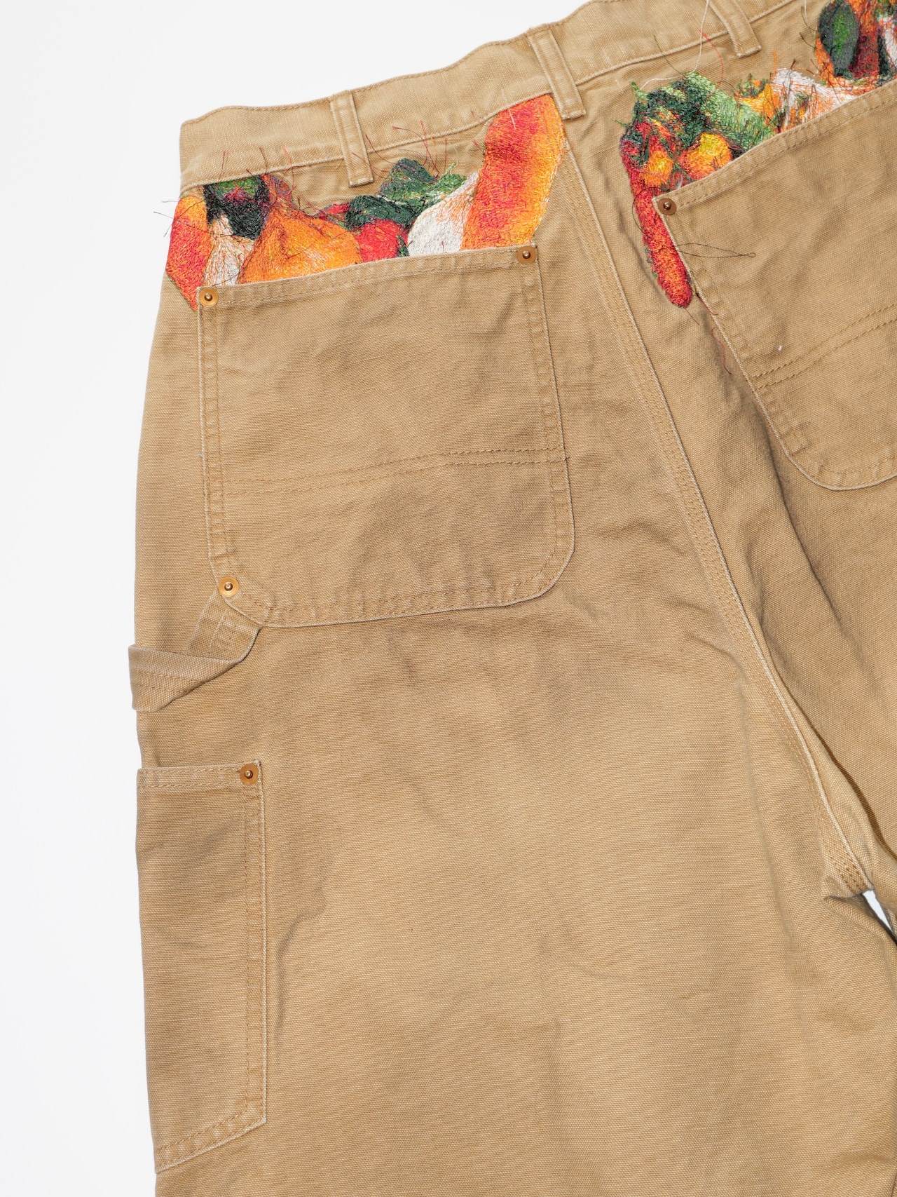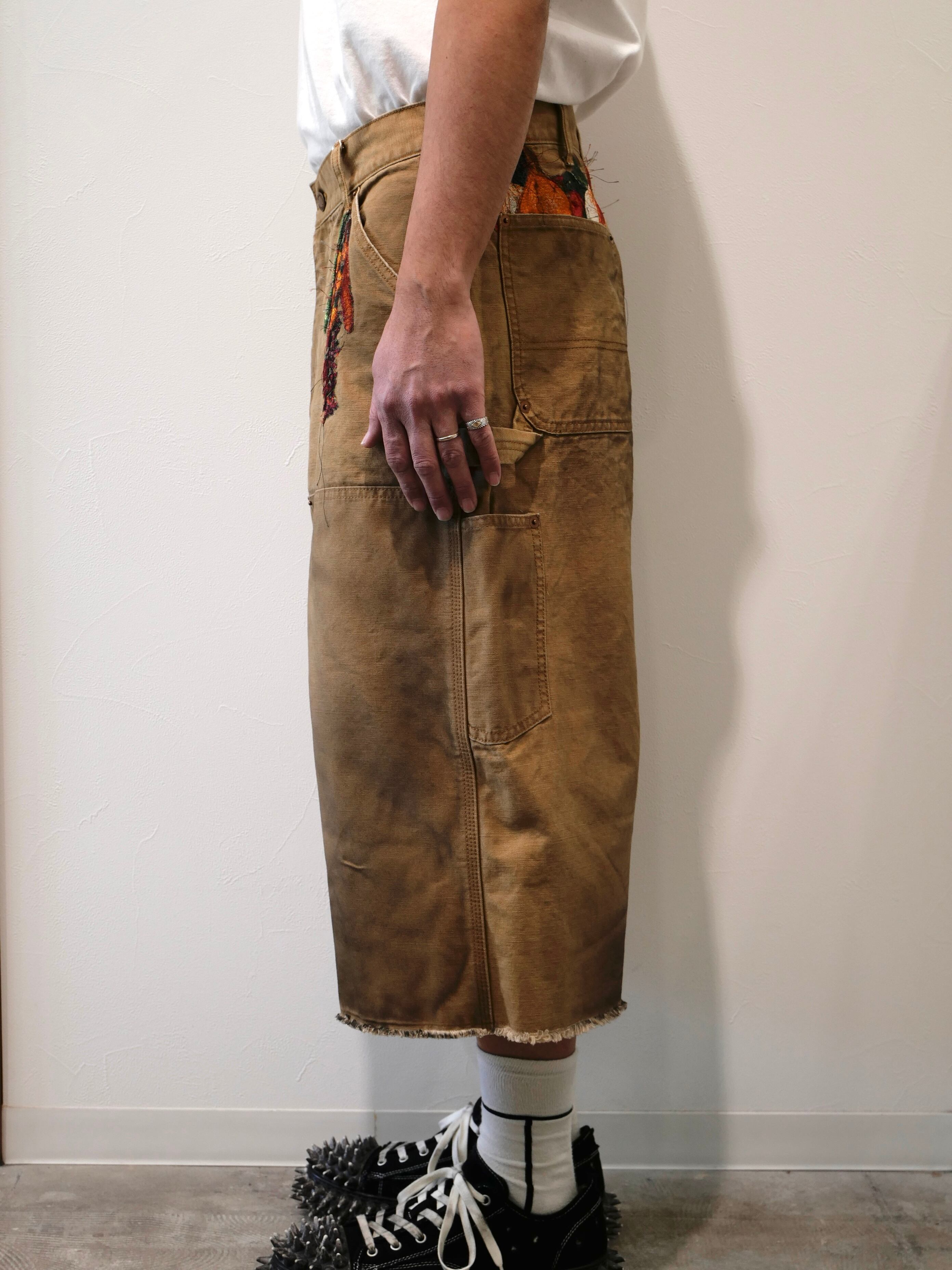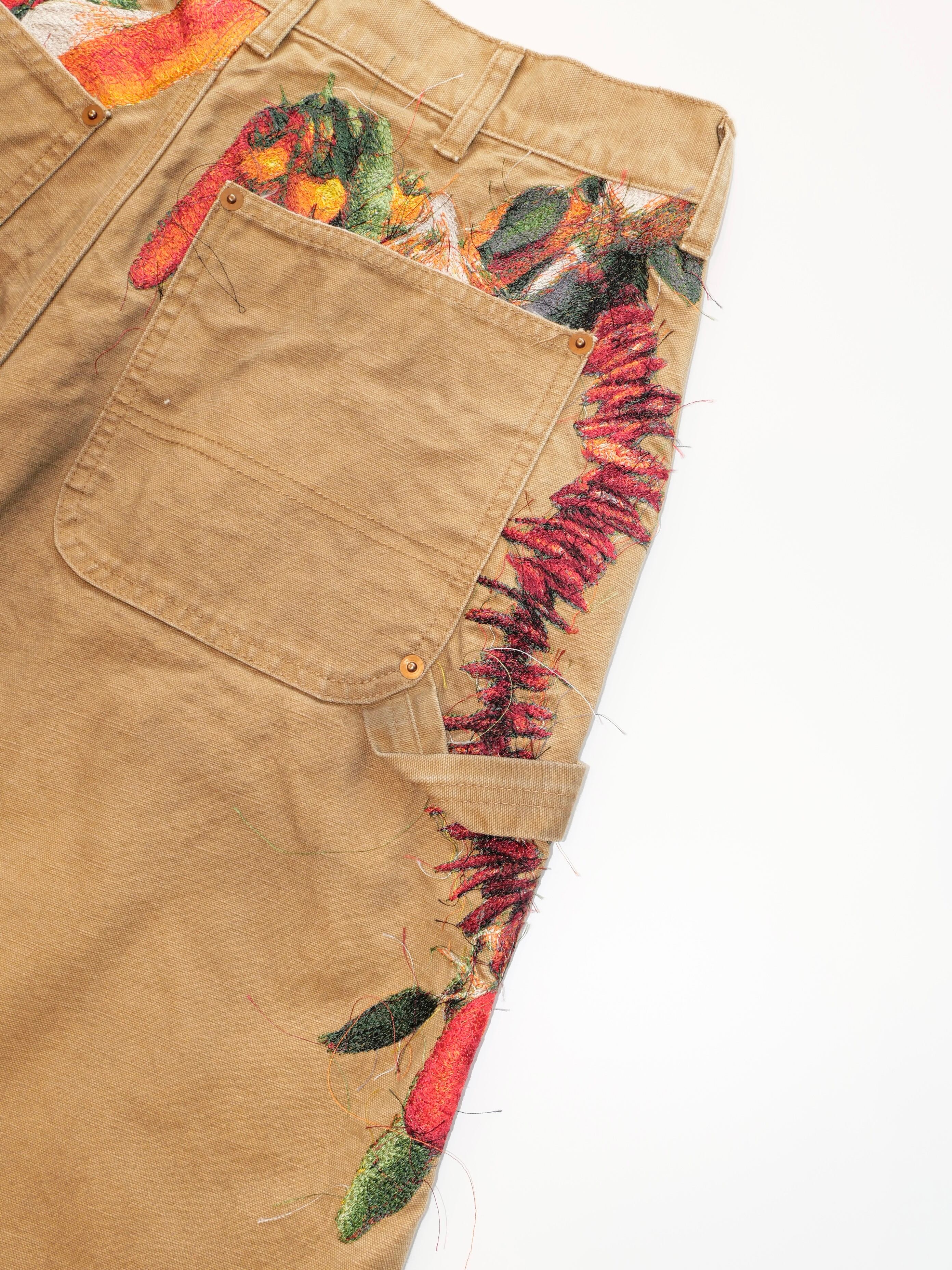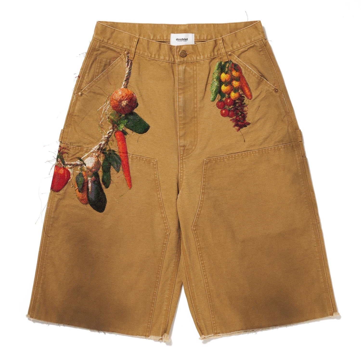 製品染めを施したダック生地のカットオフパンツに、玉ねぎ、人参、ピーマン、にんにく、赤唐辛子、茄子などの野菜刺繍を配置。ポケットからはみ出すだけでなく、ベルトループから吊るされたようにも見える仕掛けで、収穫カゴをそのまま腰にぶら下げたような一本です。