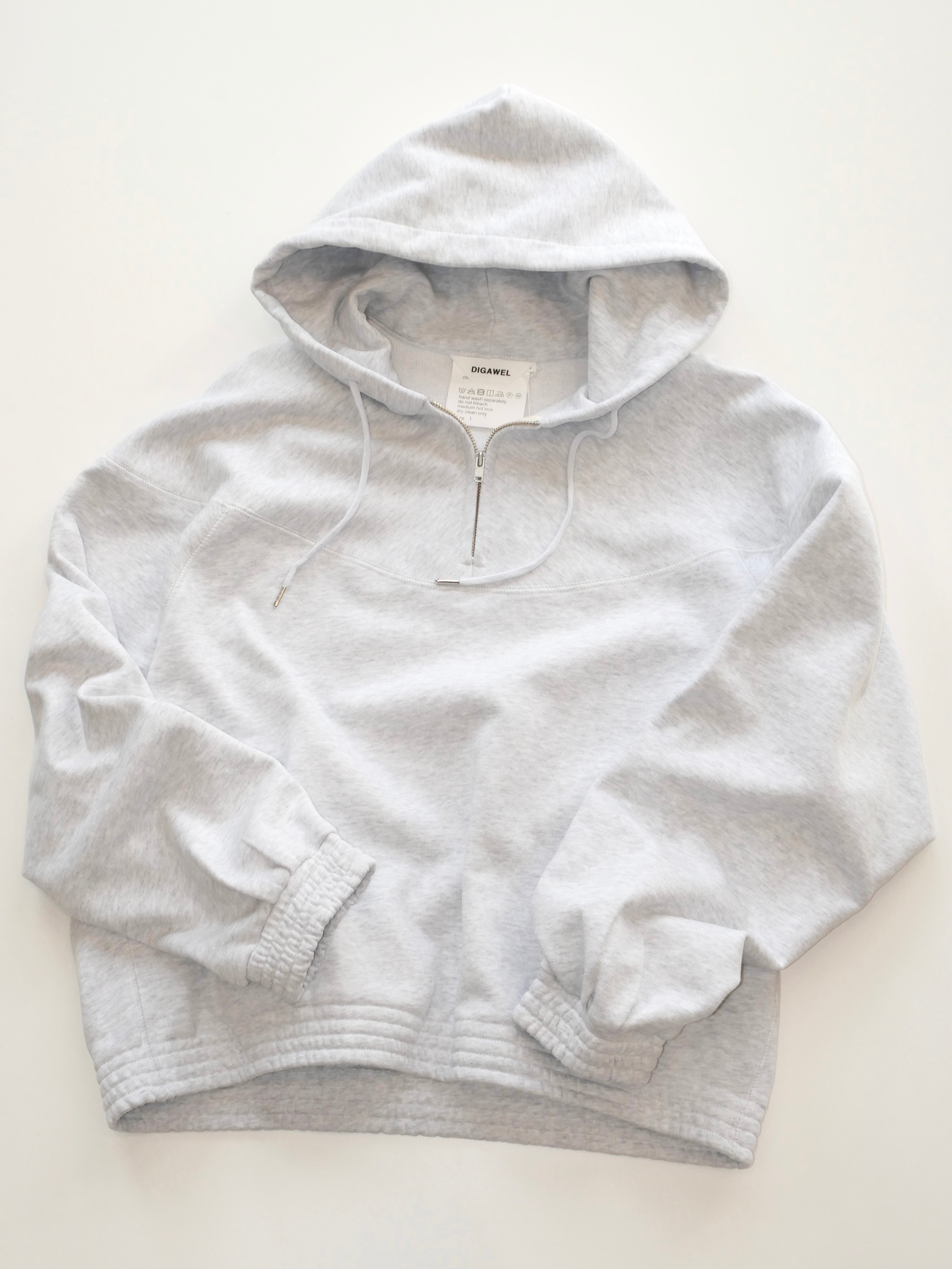 ハーフジップの裏毛スウェットフーディ。