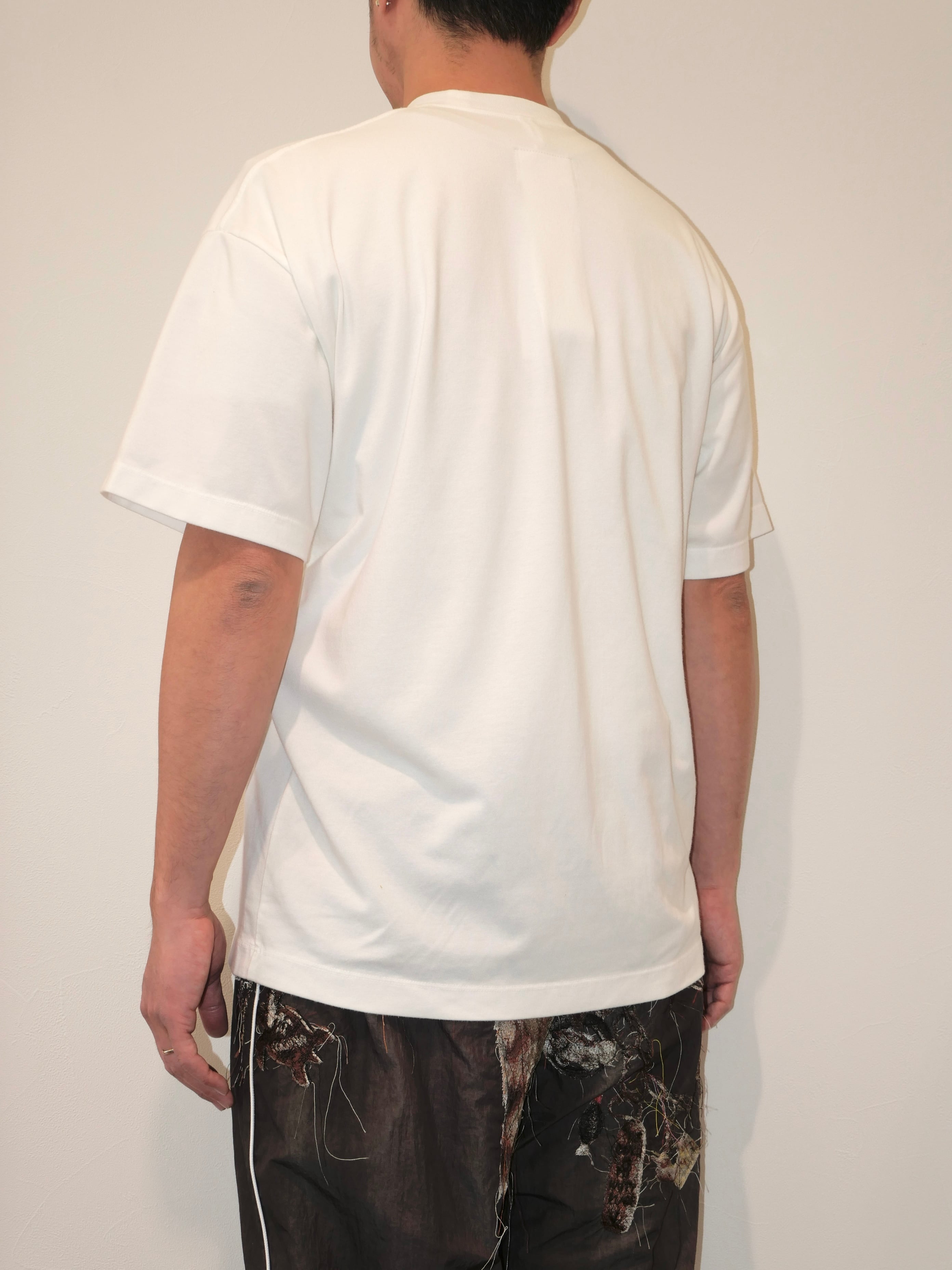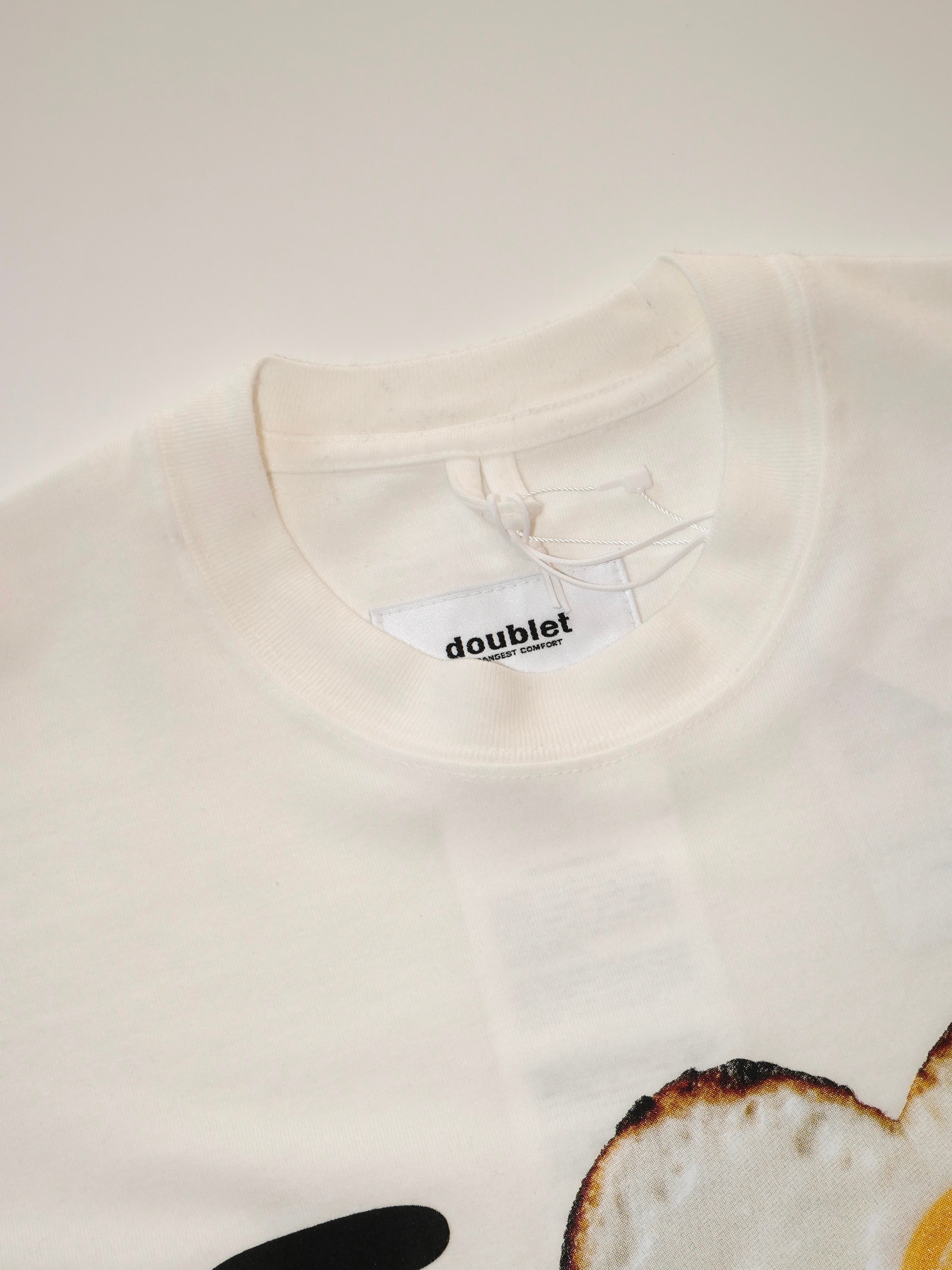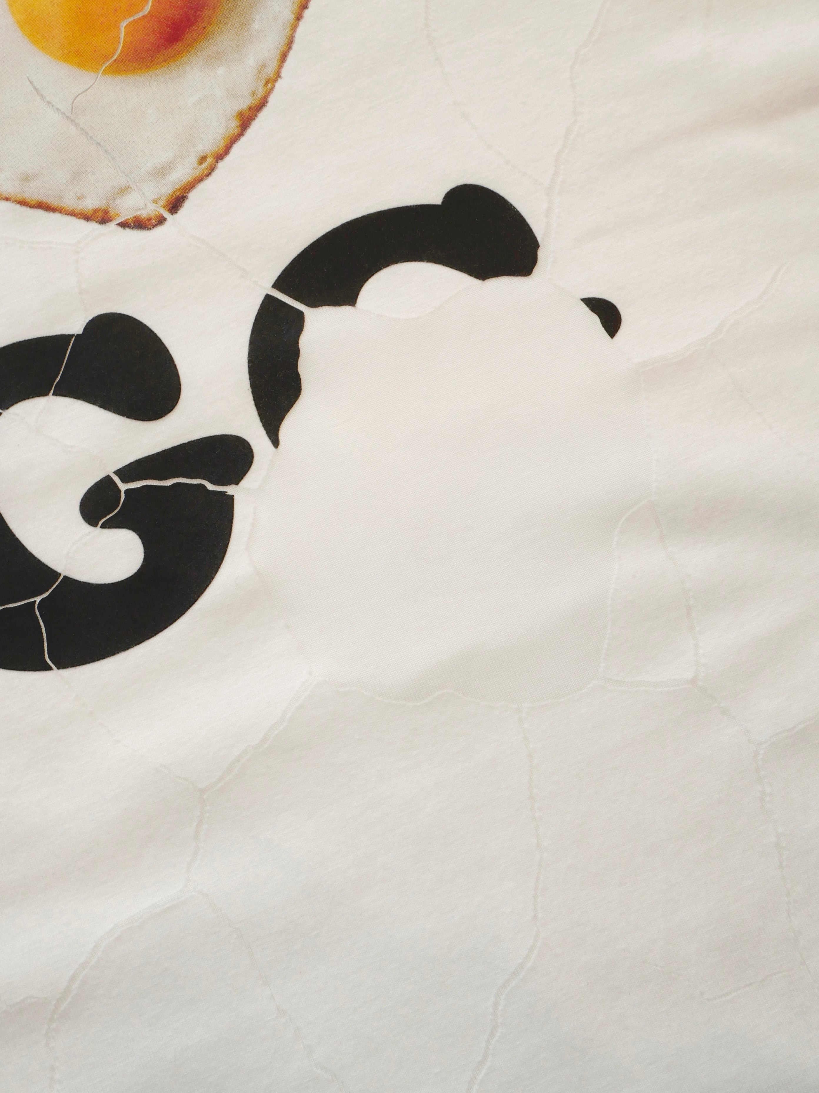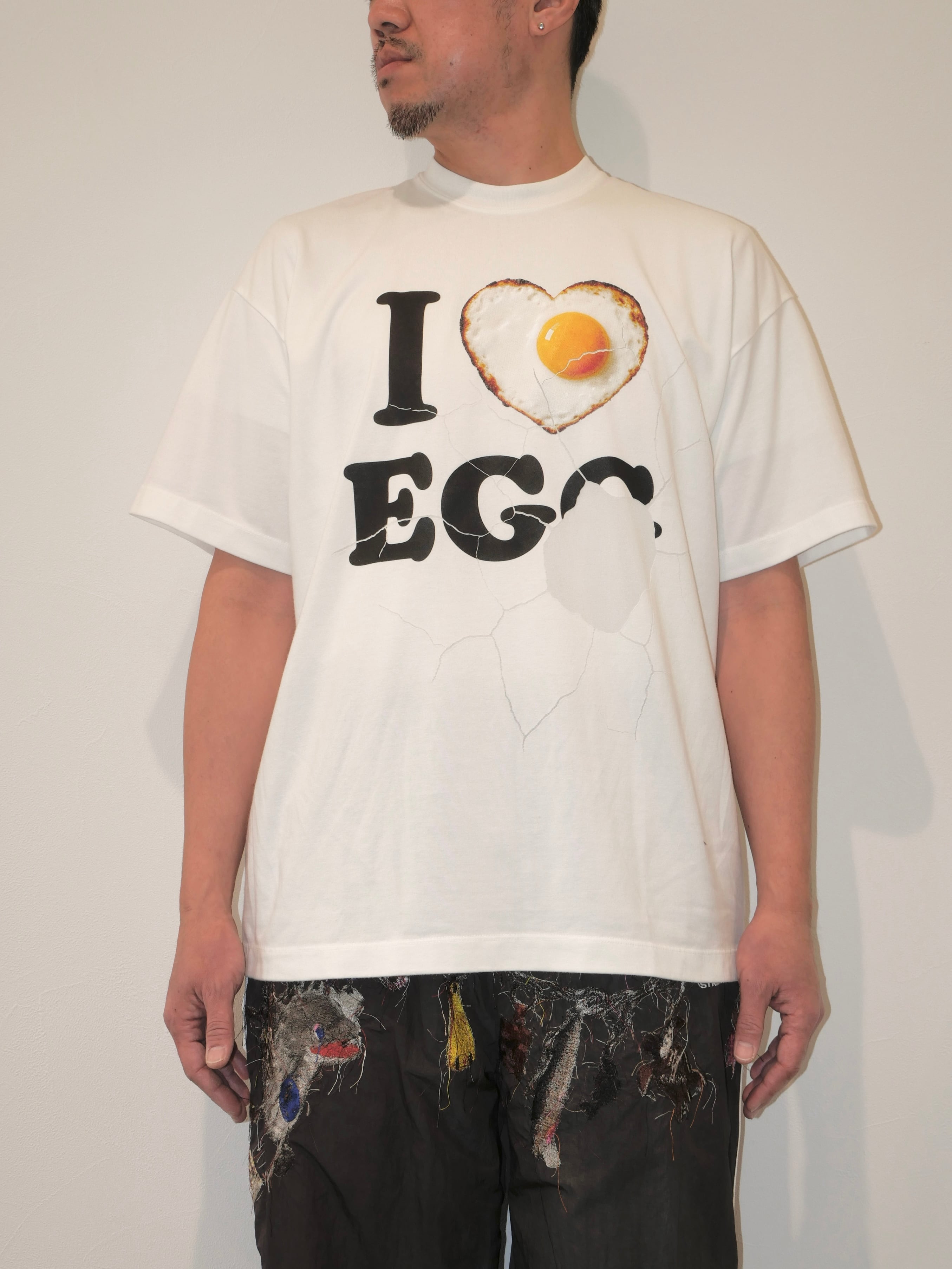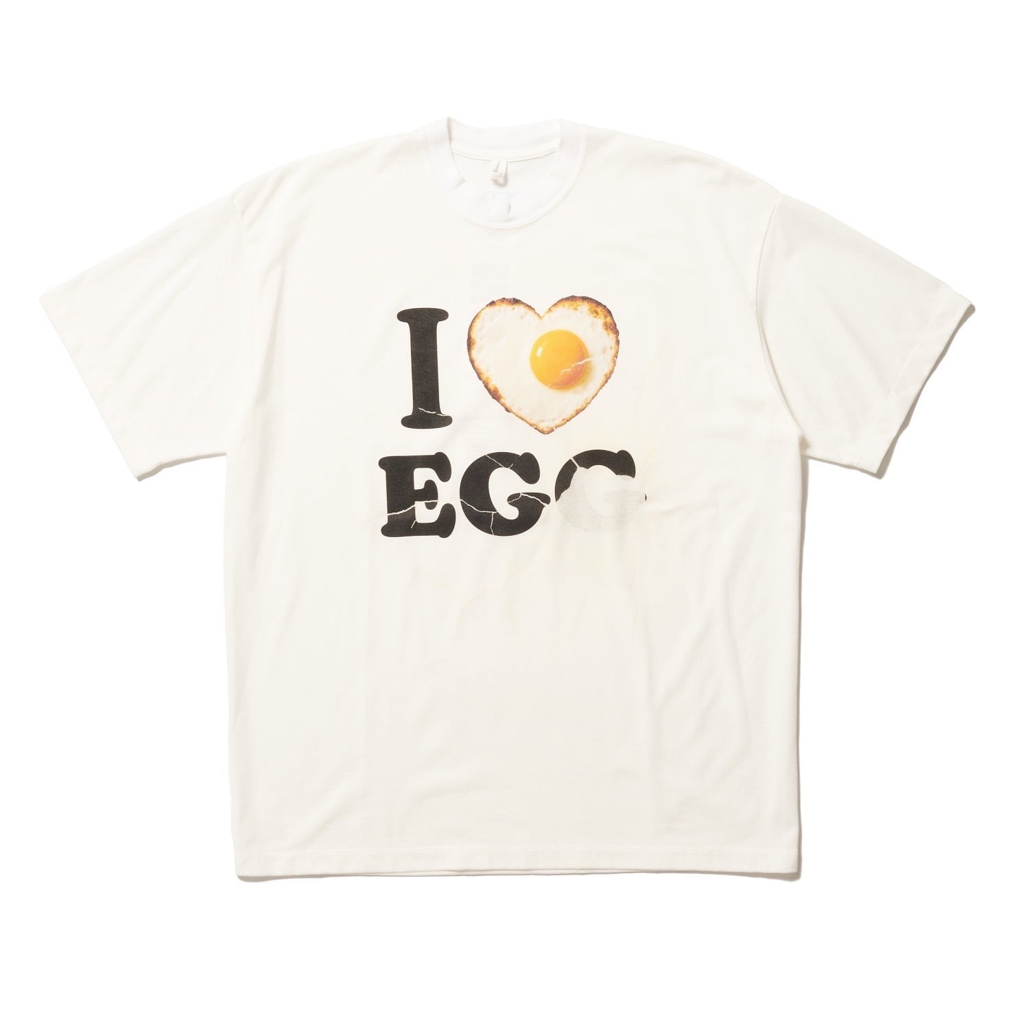 A RELAXED-FIT TEE KNIT FROM “OVOVEIL,” AN UPCYCLED YARN MADE FROM EGGSHELL MEMBRANES. A SPECIAL TREATMENT CREATES REALISTIC CRACK PATTERNS BY PARTIALLY DISSOLVING THE FABRIC. THE FRONT FEATURES A SUNNY-SIDE-UP EGG PRINT WITH A HEART-SHAPED YOLK.