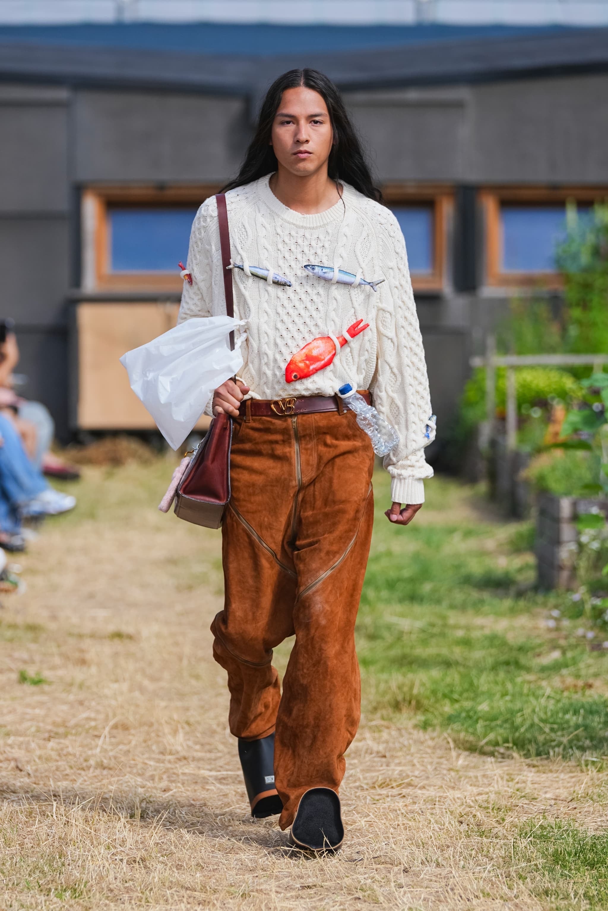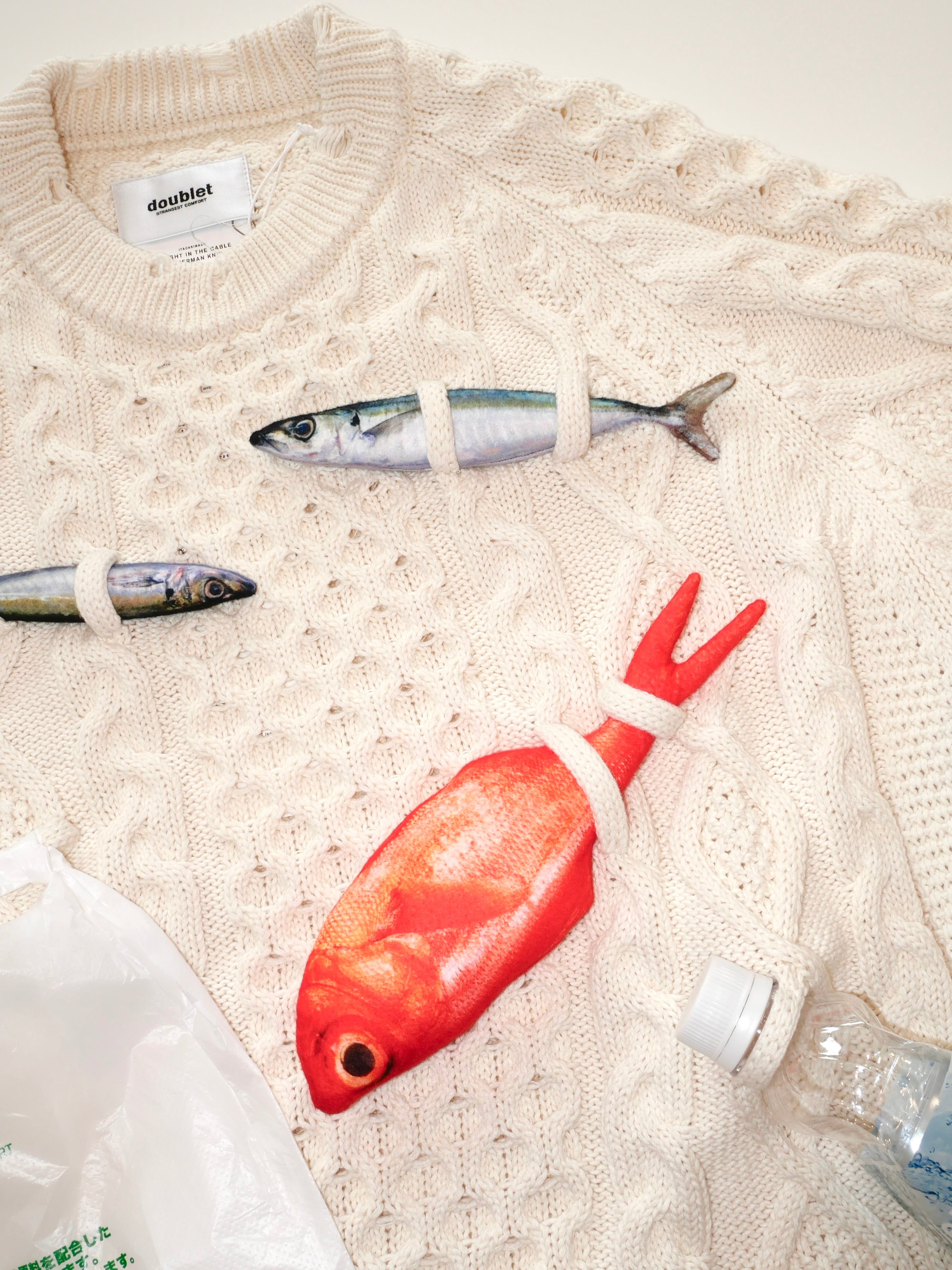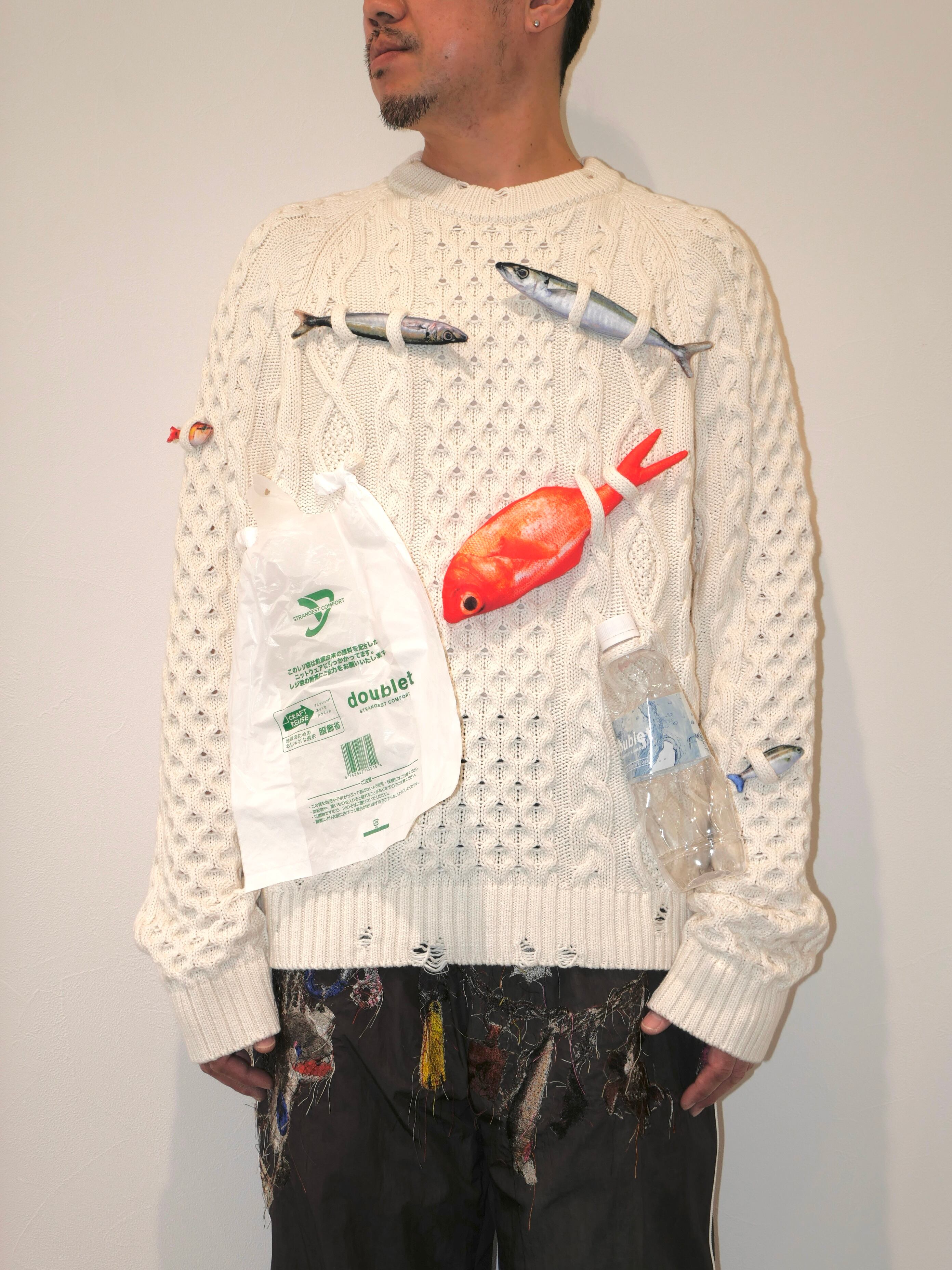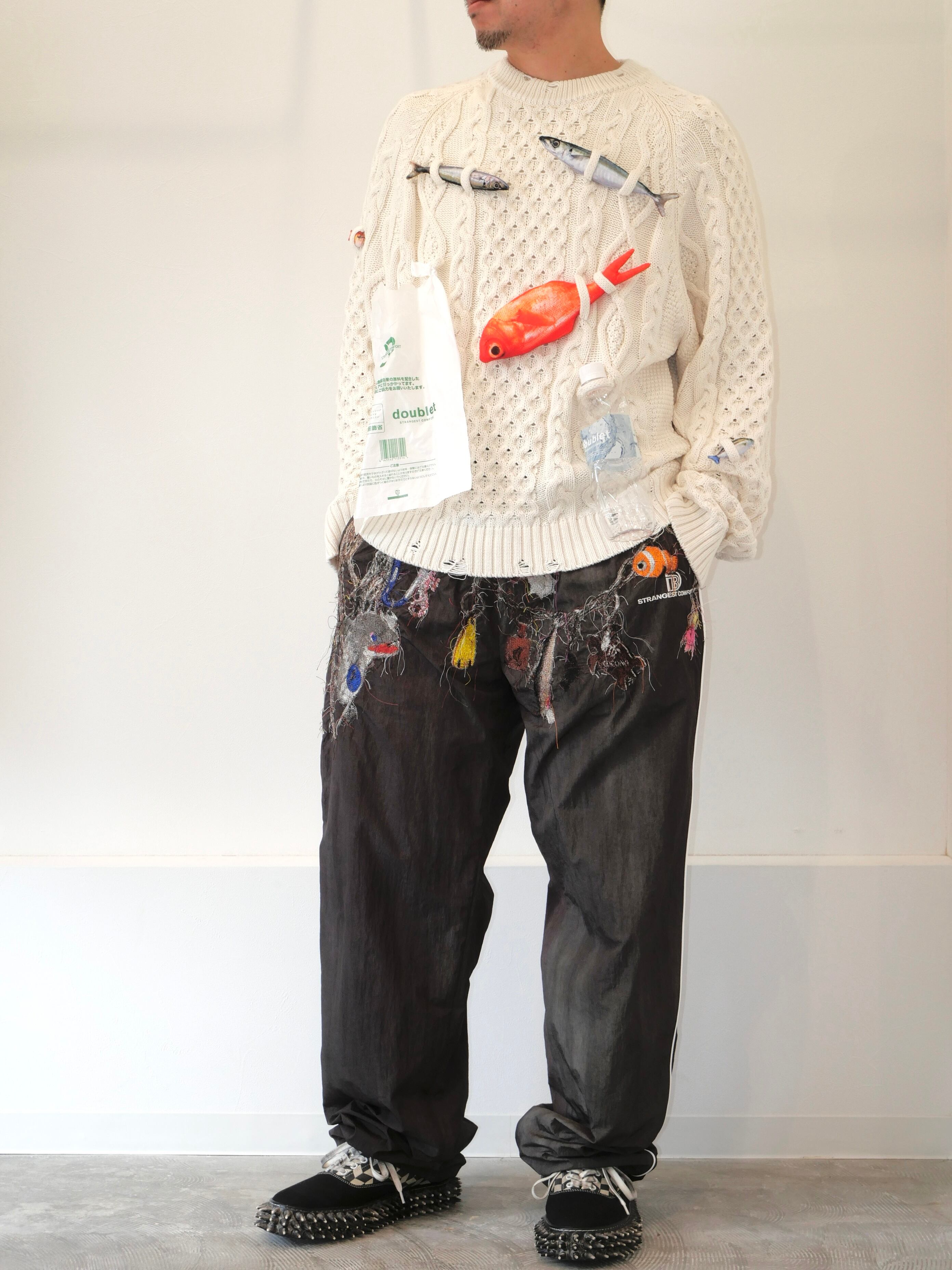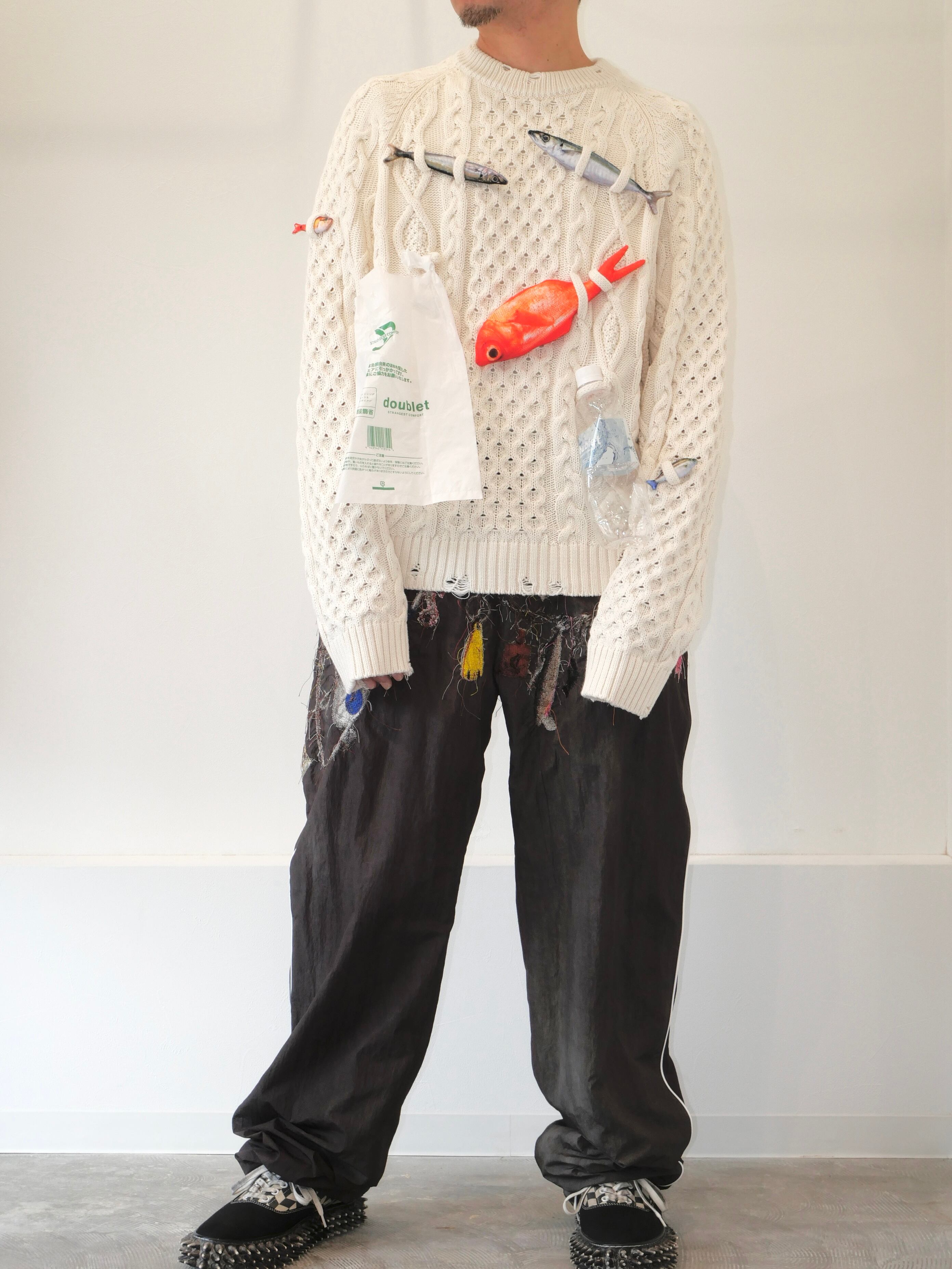 A FISHERMAN KNIT MADE FROM “MURON”—A JAPANESE NYLON YARN UPCYCLED FROM DISCARDED FISHING NETS—COVERED WITH COTTON FOR A NATURAL TOUCH. THE CABLE STITCHES EXTEND LIKE TANGLED NETS, CATCHING FISH, PLASTIC BAGS, AND BOTTLES ALONG THE WAY.