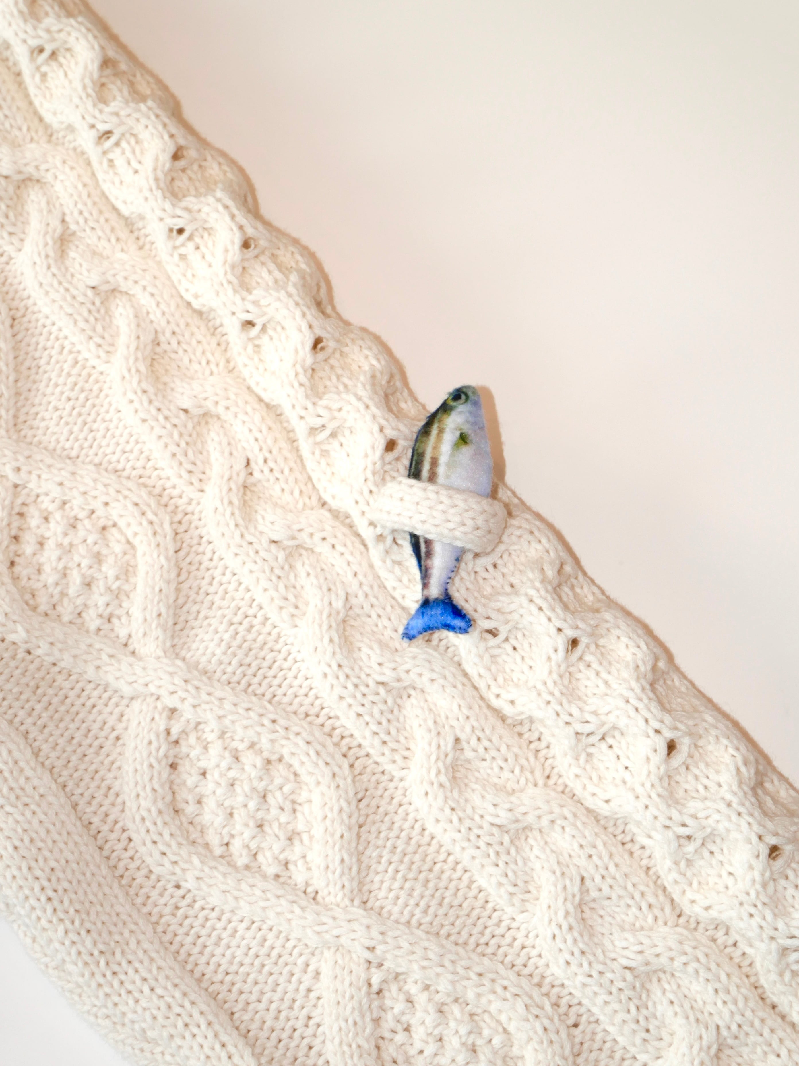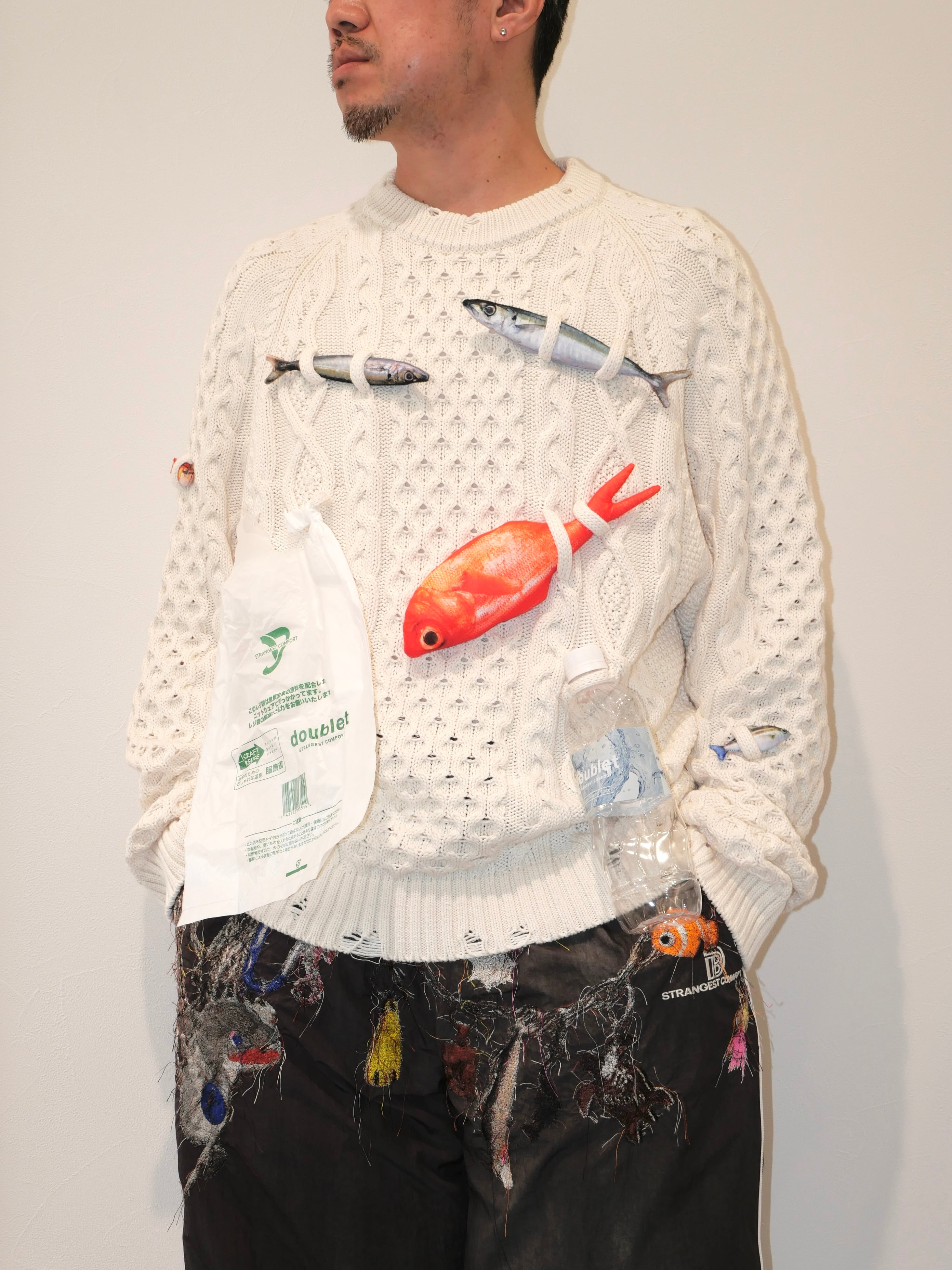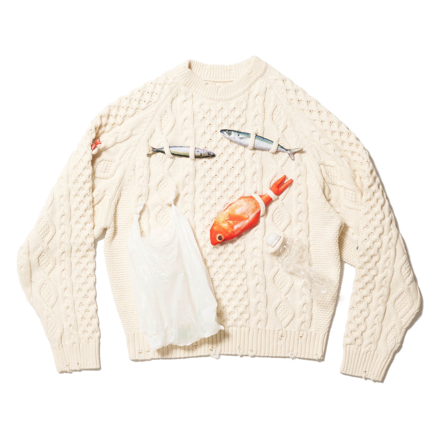 日本由来100%の魚網をリサイクルして生まれたナイロン糸「MURON」を、コットンでカバーリングして編んだフィッシャーマンニット。ケーブル編みが網のように飛び出し、そこに金目鯛やビニール袋、ペットボトルなどが絡みついています。まるで海に漂う漁網のように、命と廃棄物の両方を巻き込む編み目に仕上げました。