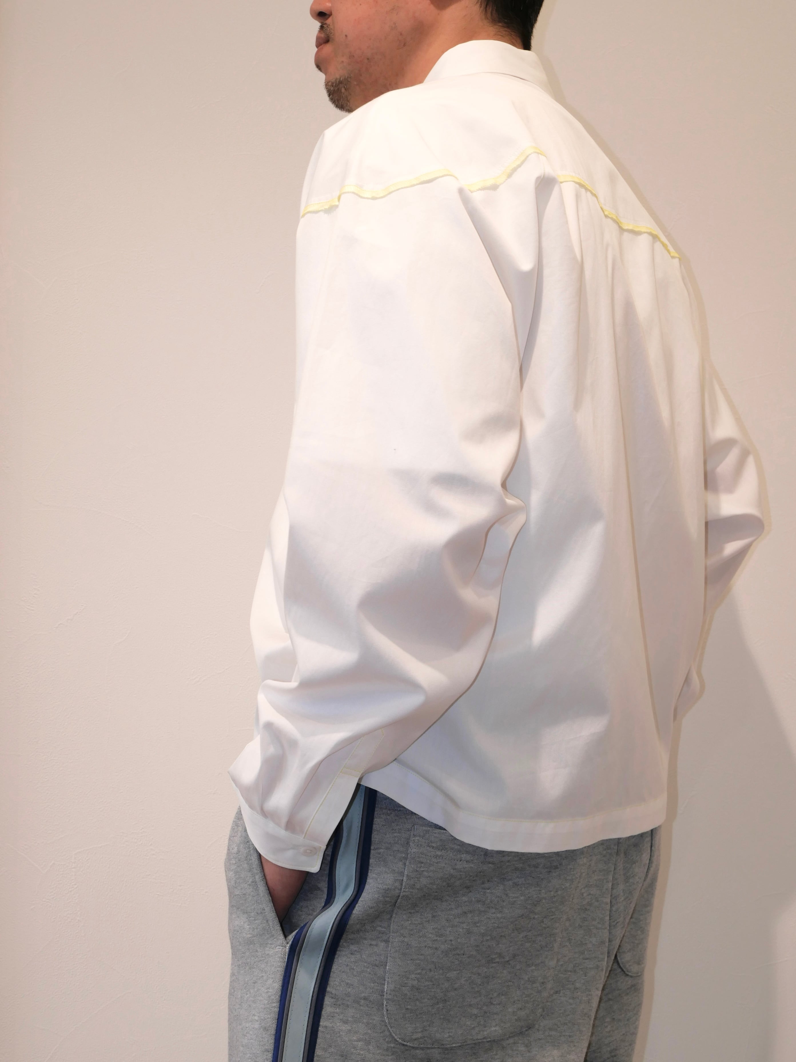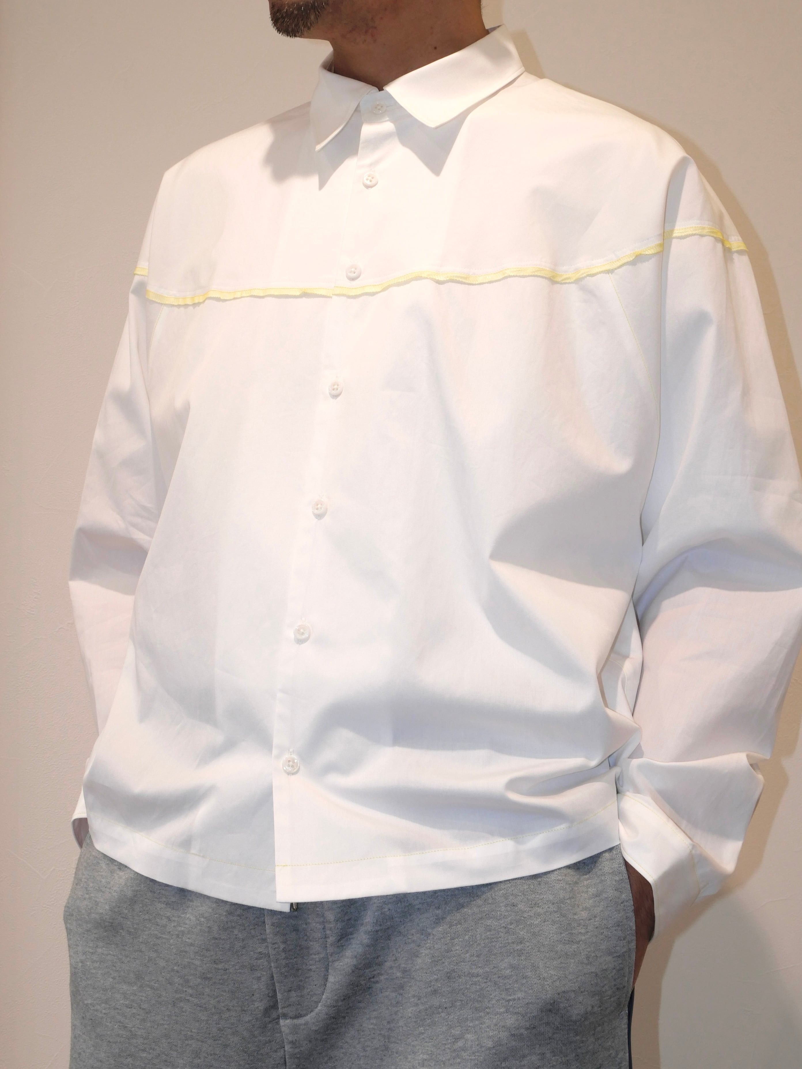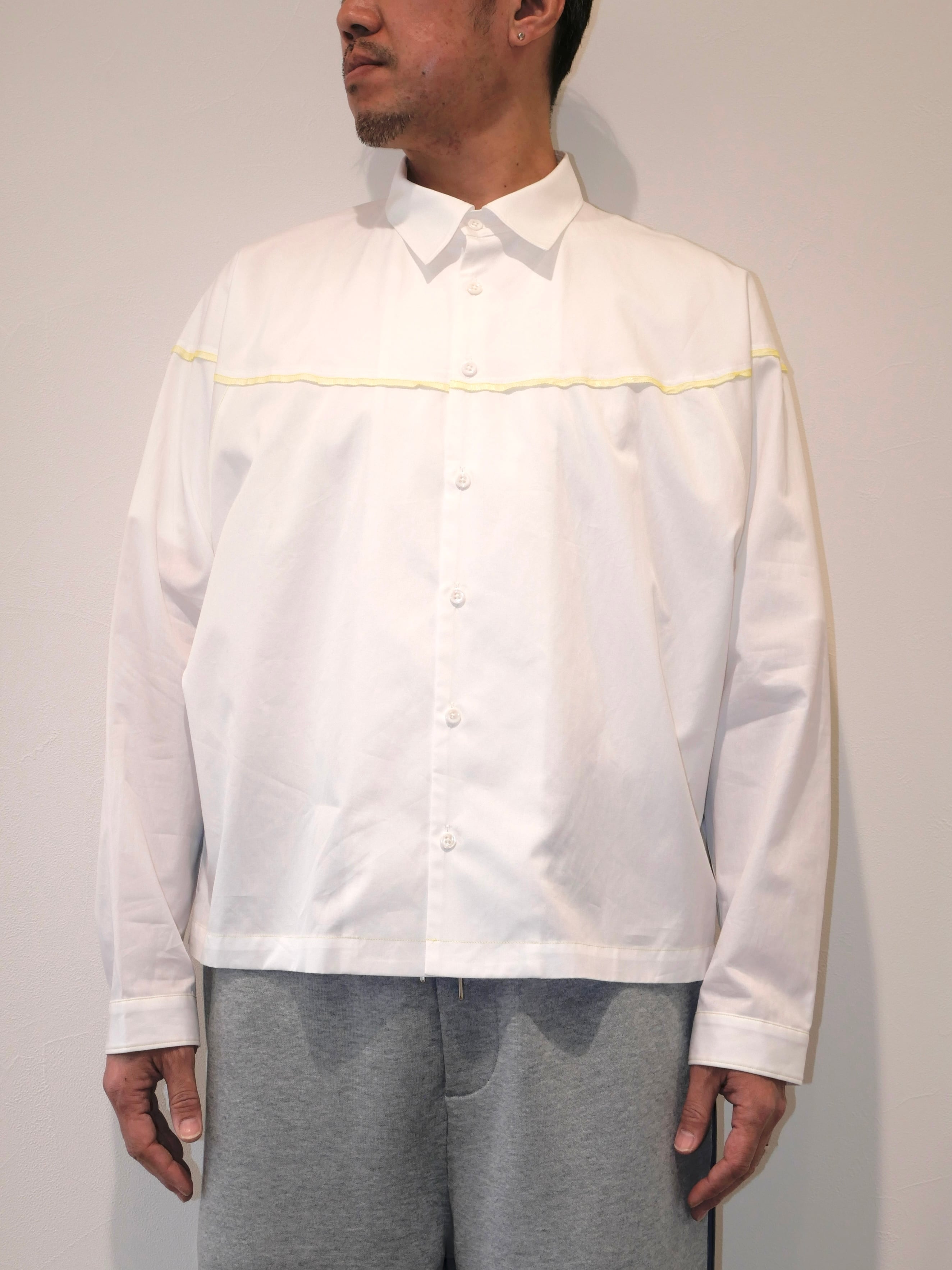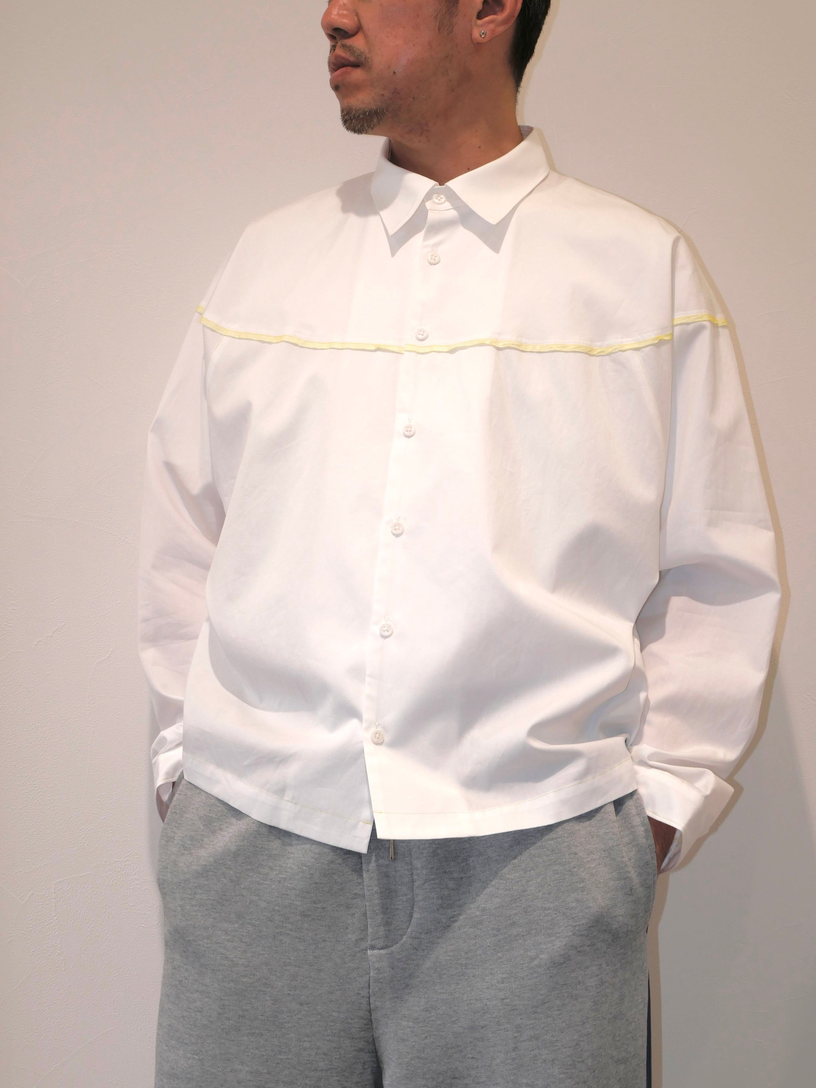 着丈の短めデザインとなっており、どんなボトムスでもバランスがとりやすいシルエットのシャツです。