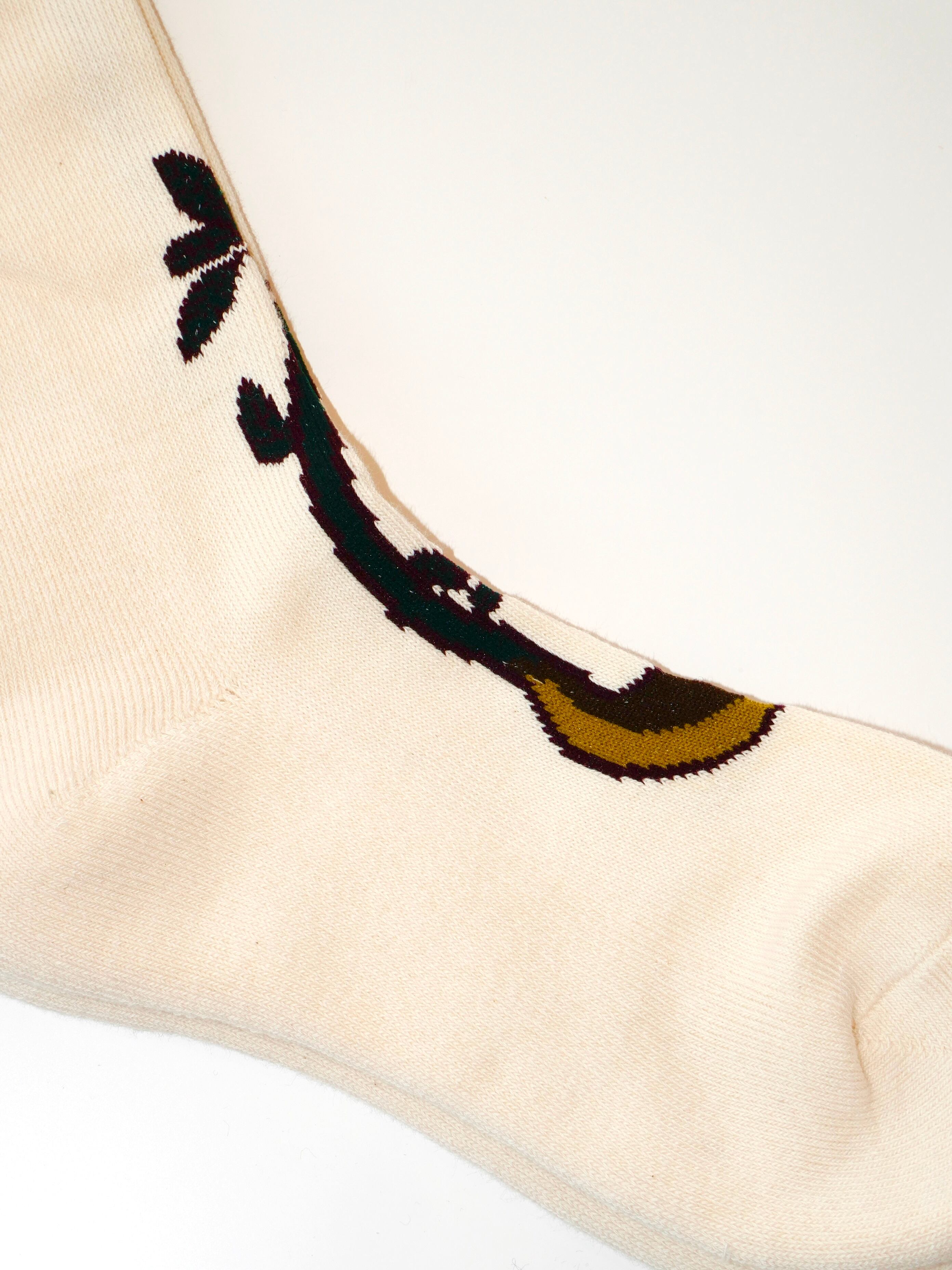 デザイナーが今期のテーマを表すモチーフをハンドドローイングで描き、それを用いたソックス。