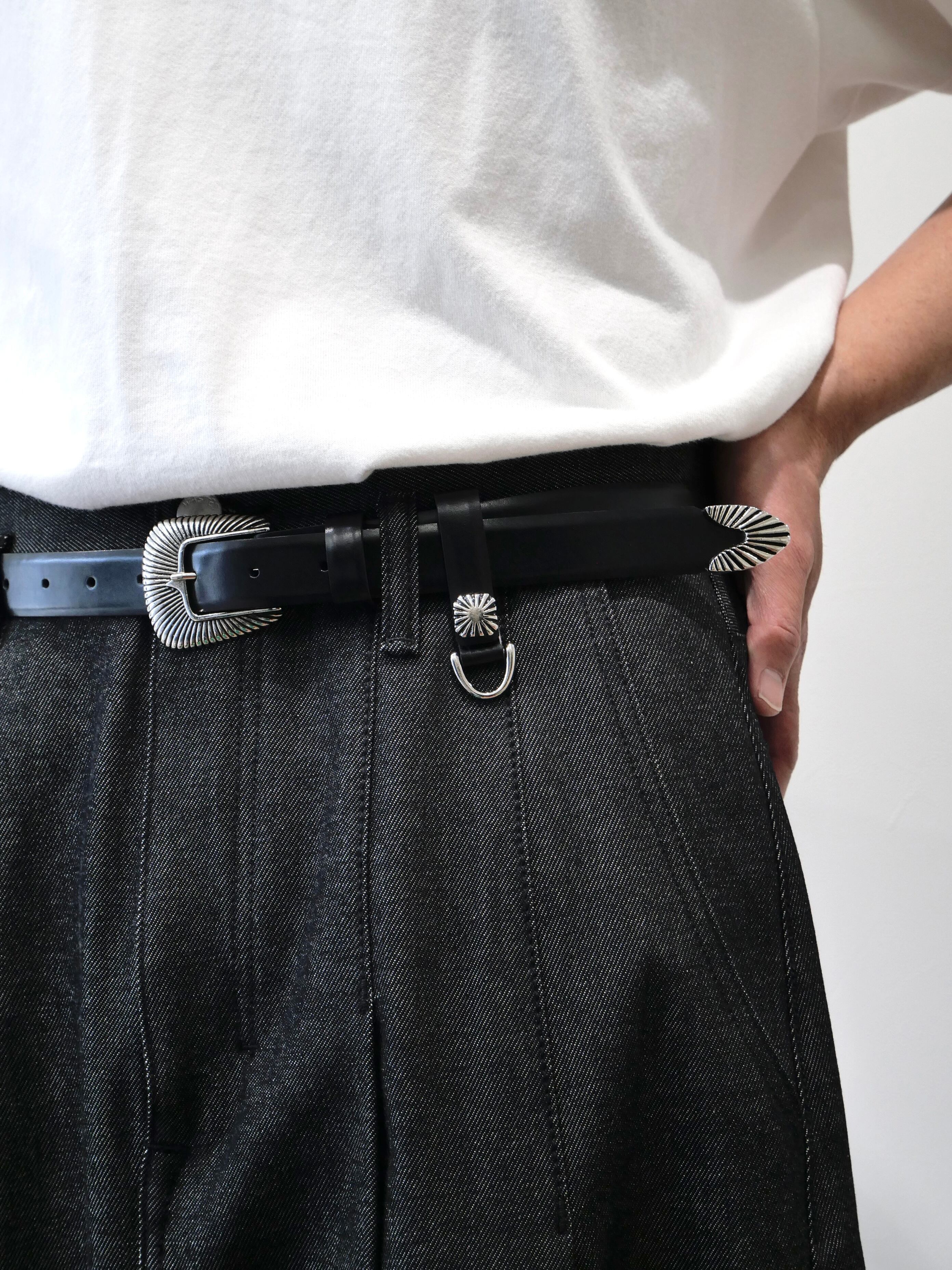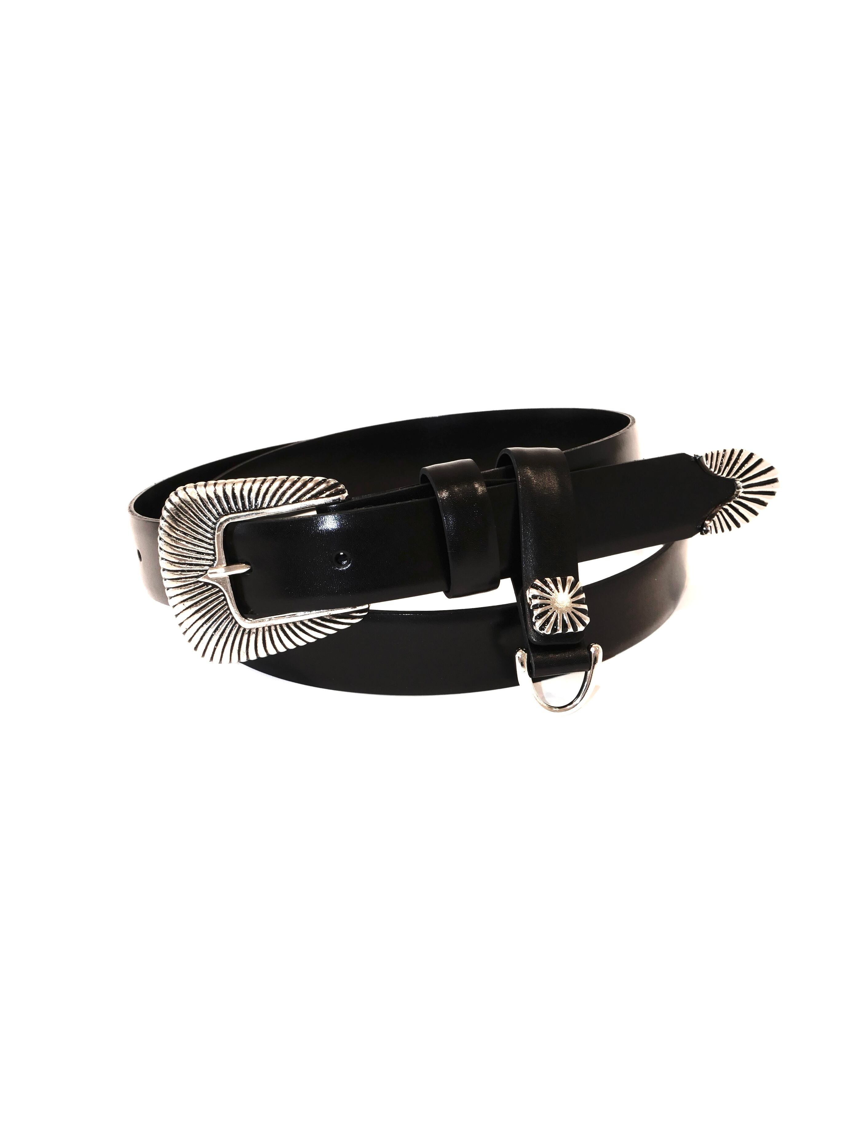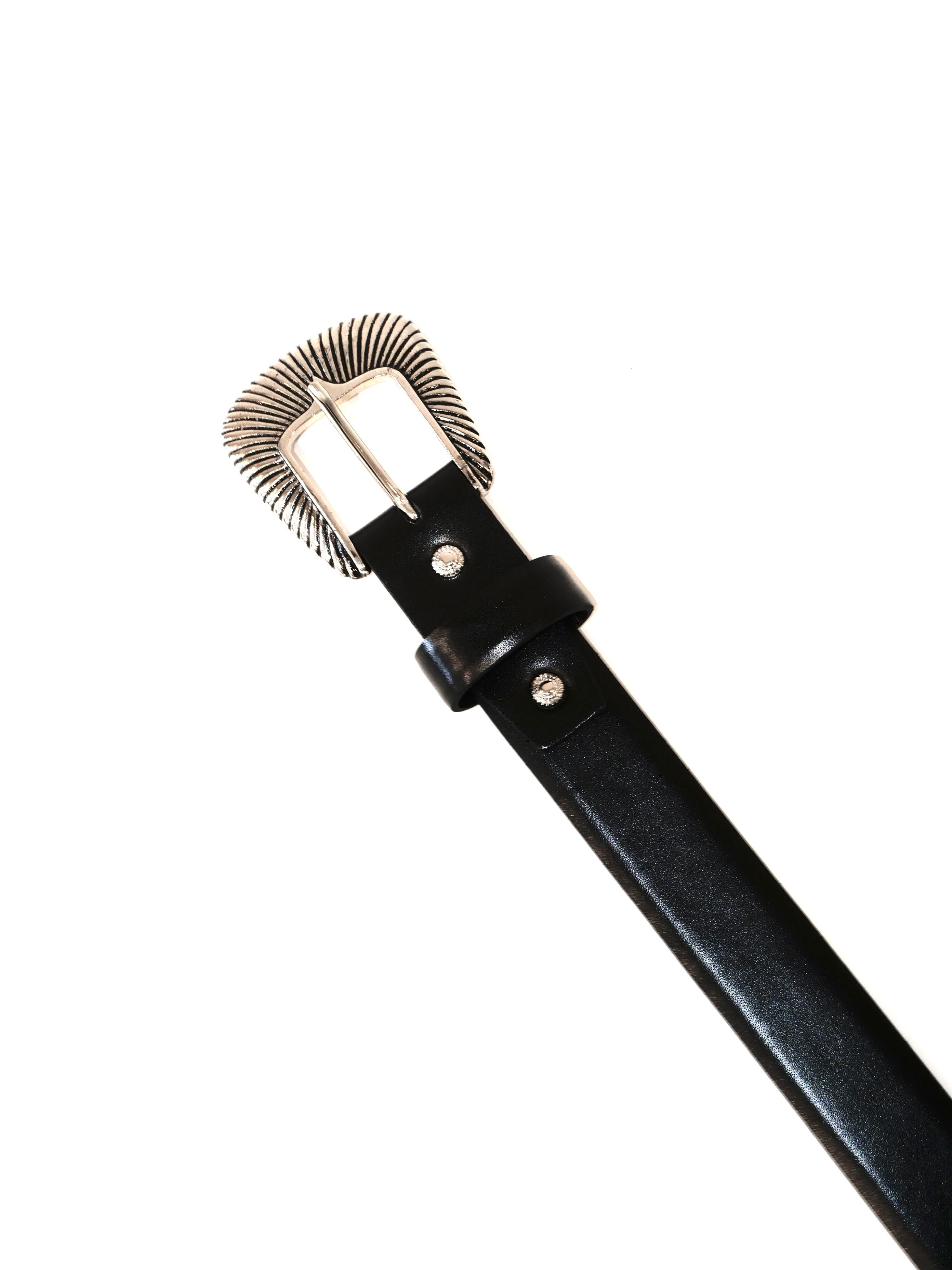 バックルにウェスタン調ディティール、大ぶりなシルバーのメタルバックル。
