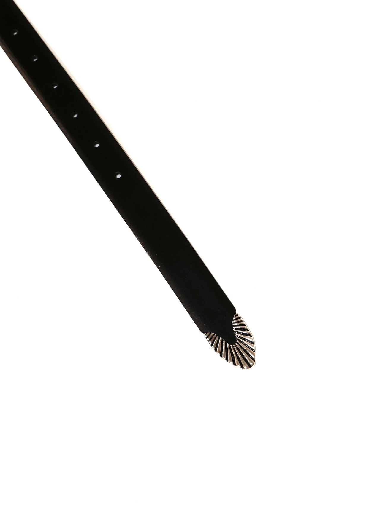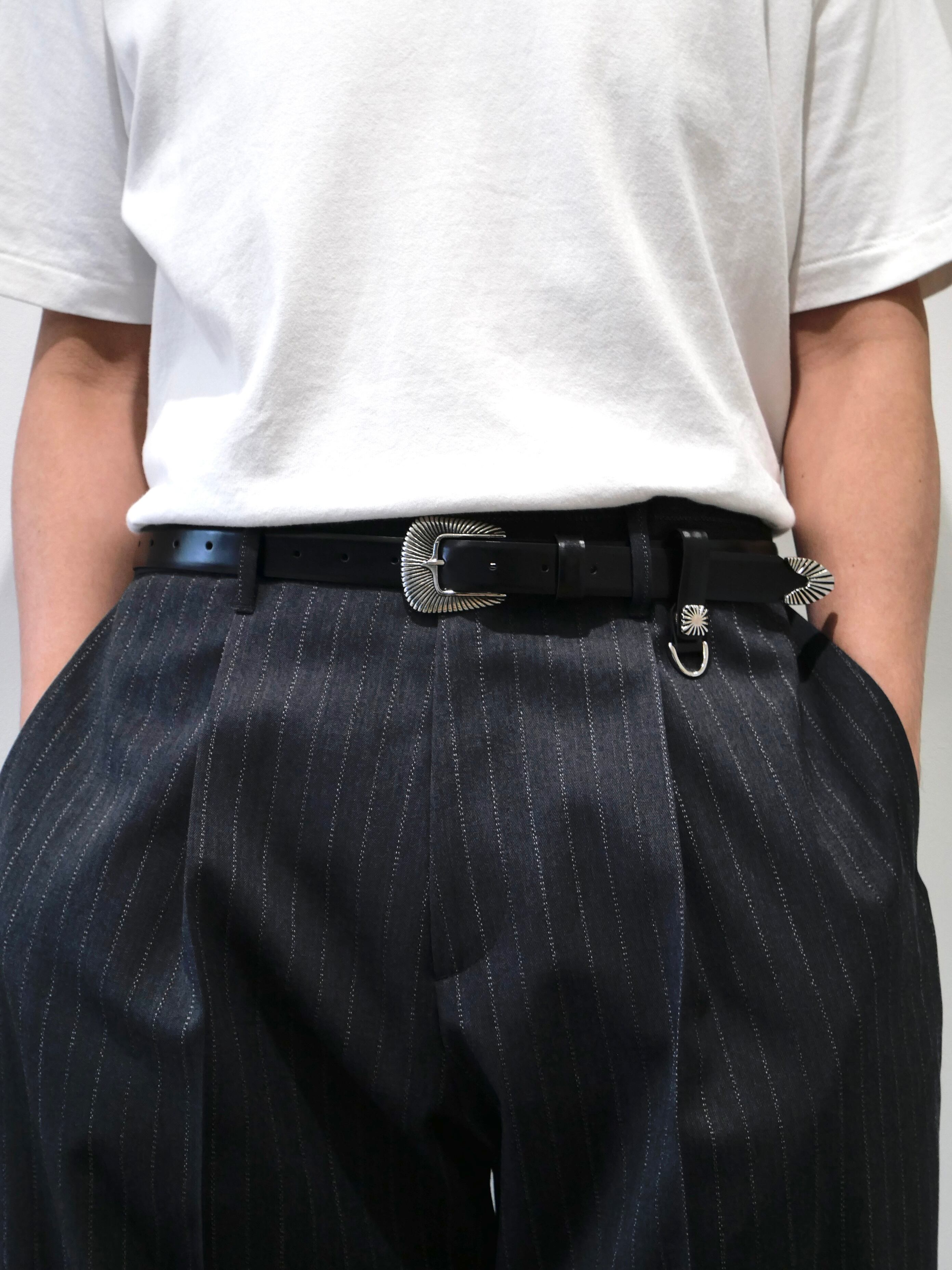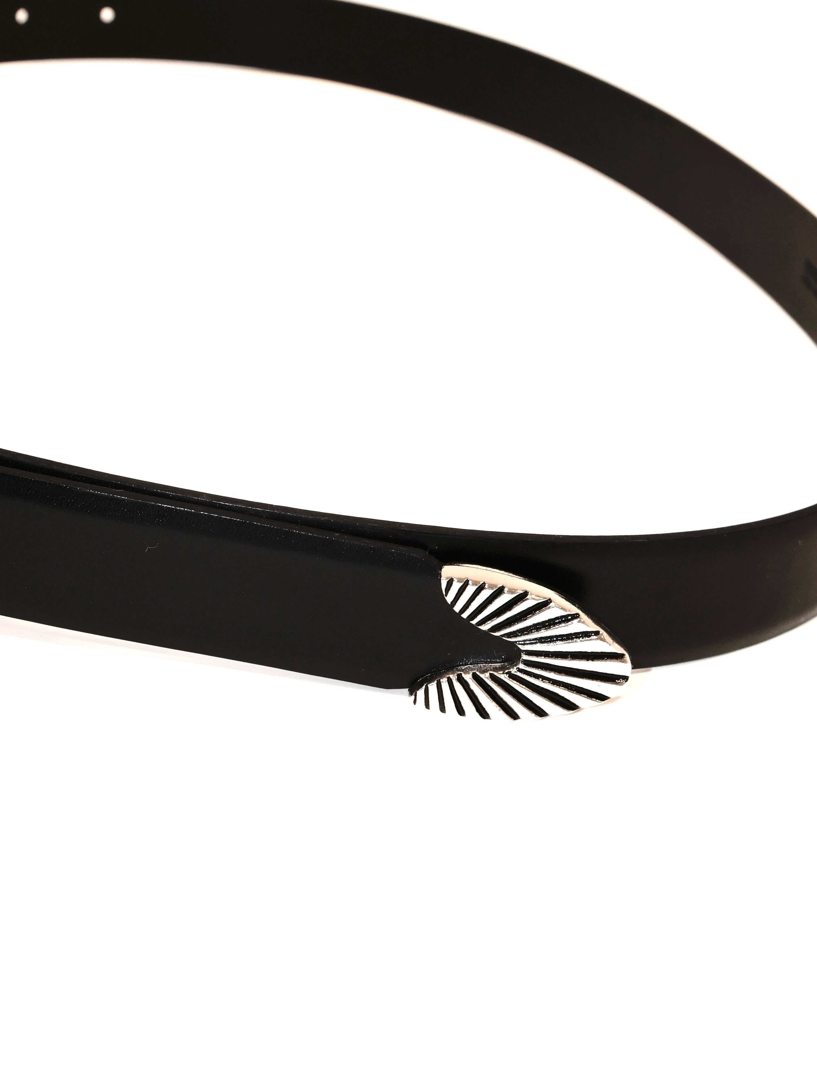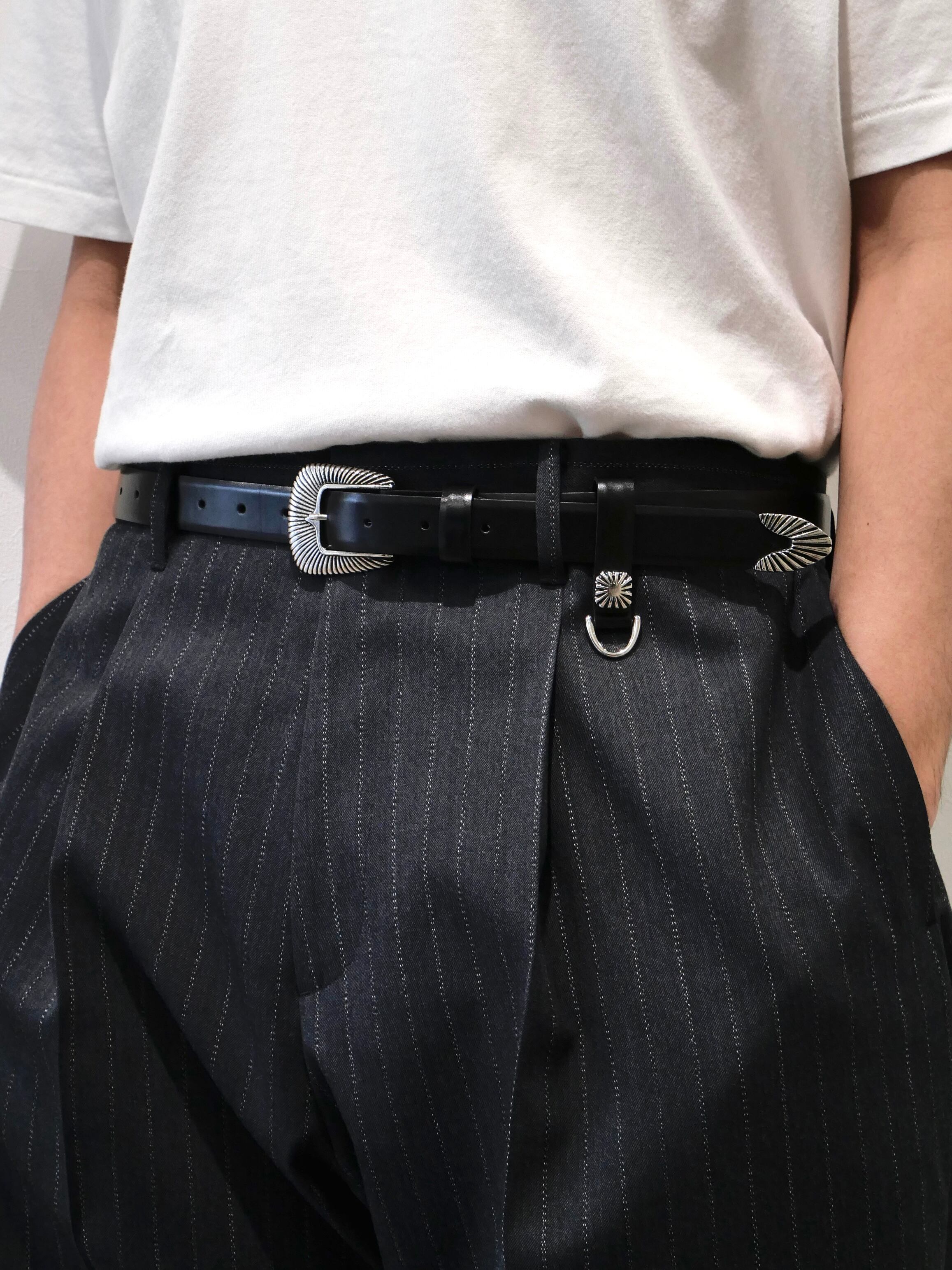 バックルにウェスタン調ディティール、大ぶりなシルバーのメタルバックル。