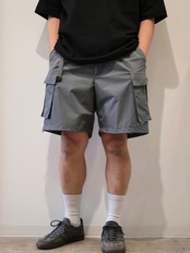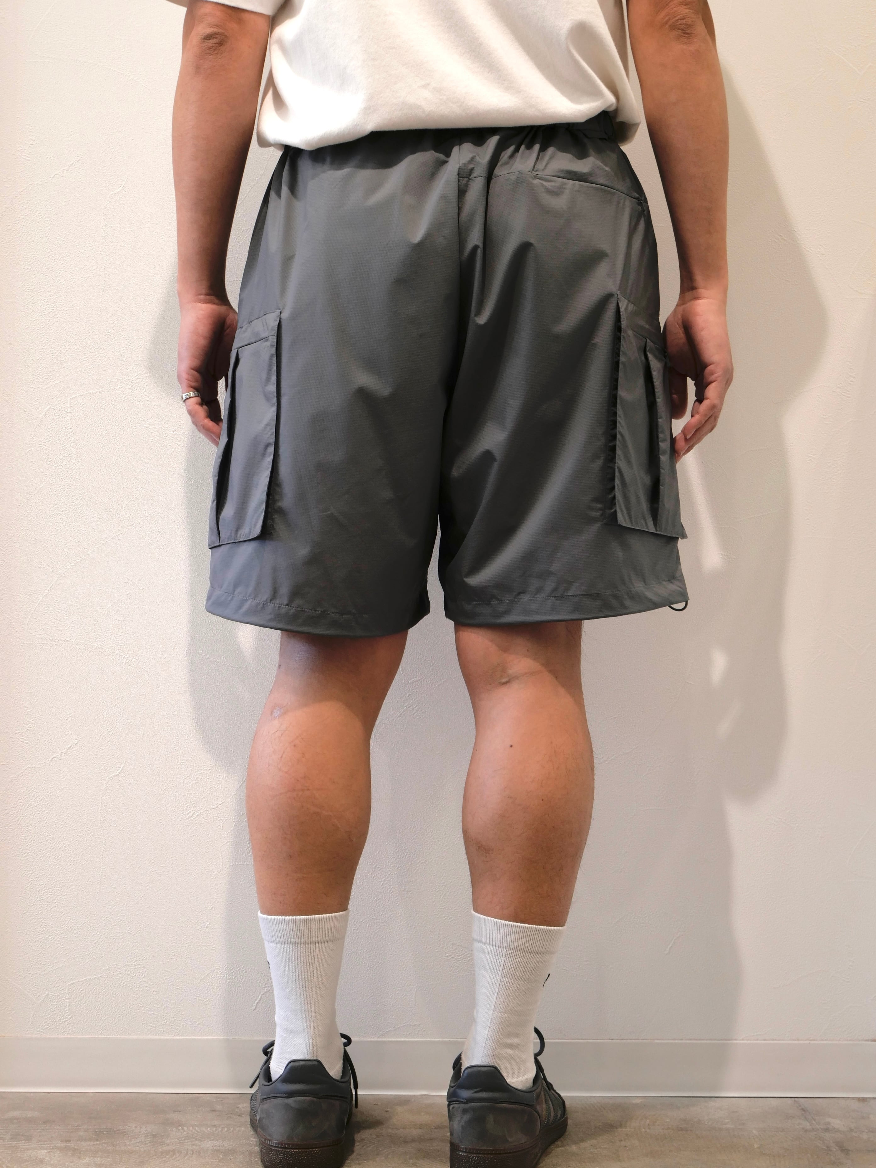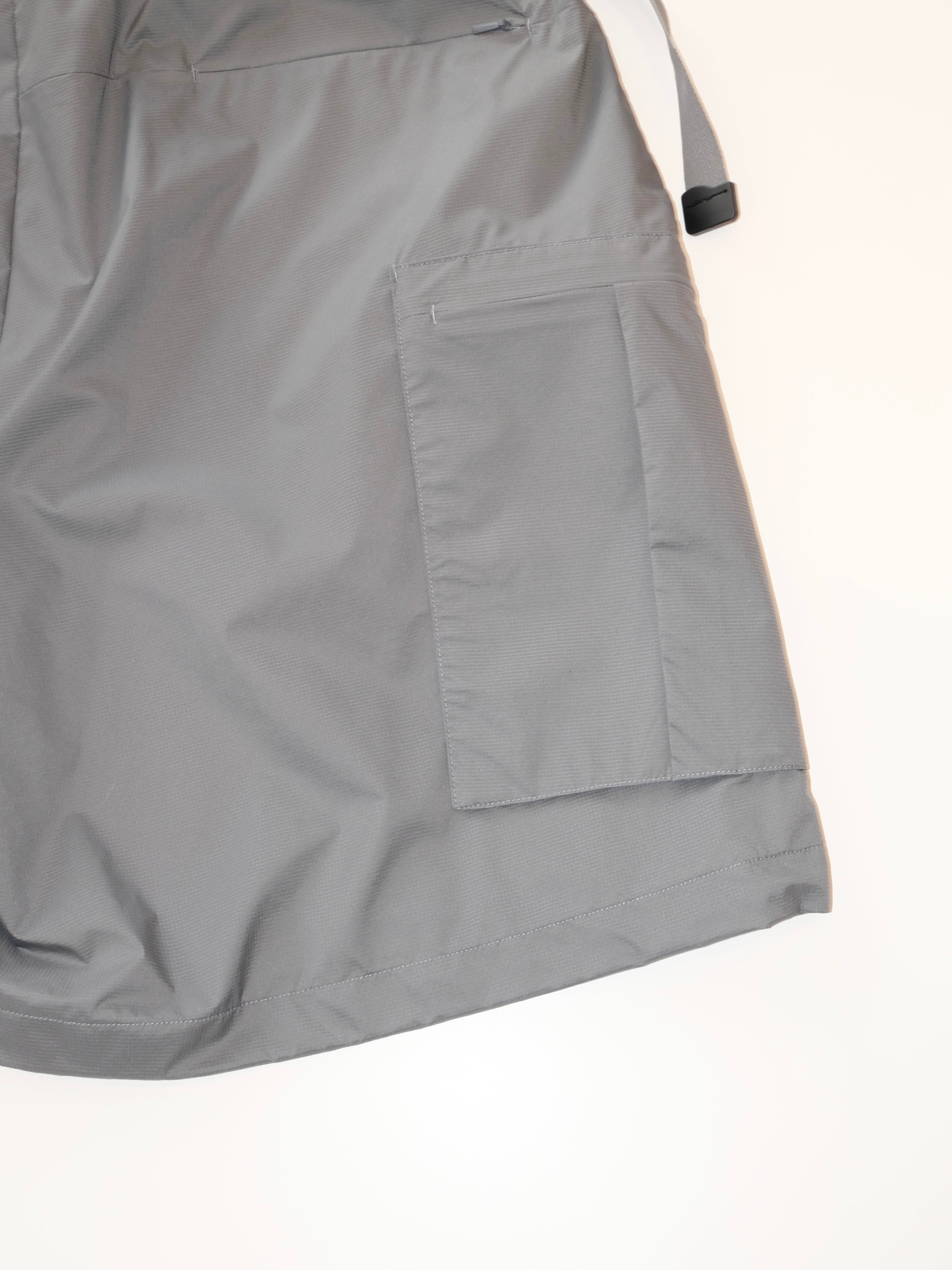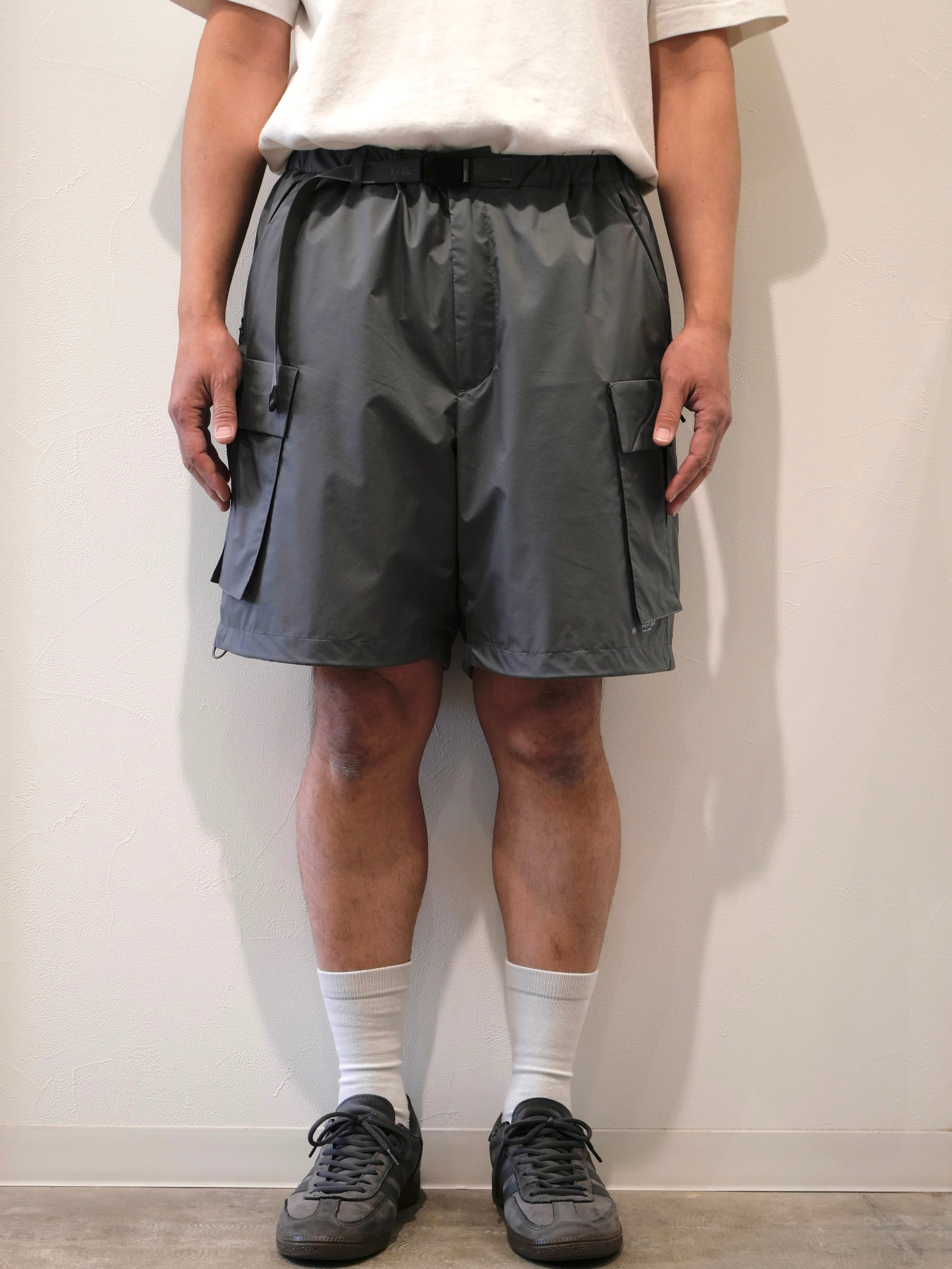 変形カーゴポケットが特徴的な、膝上丈のテクニカルショーツ。