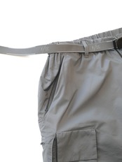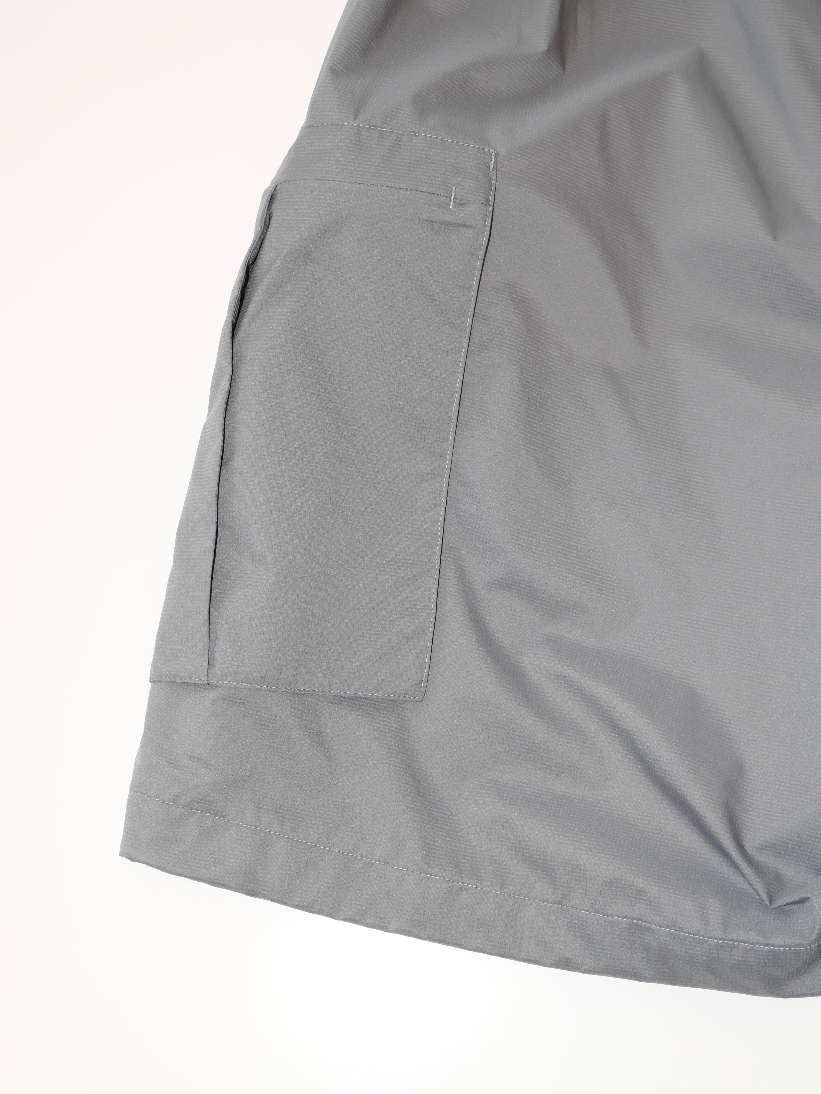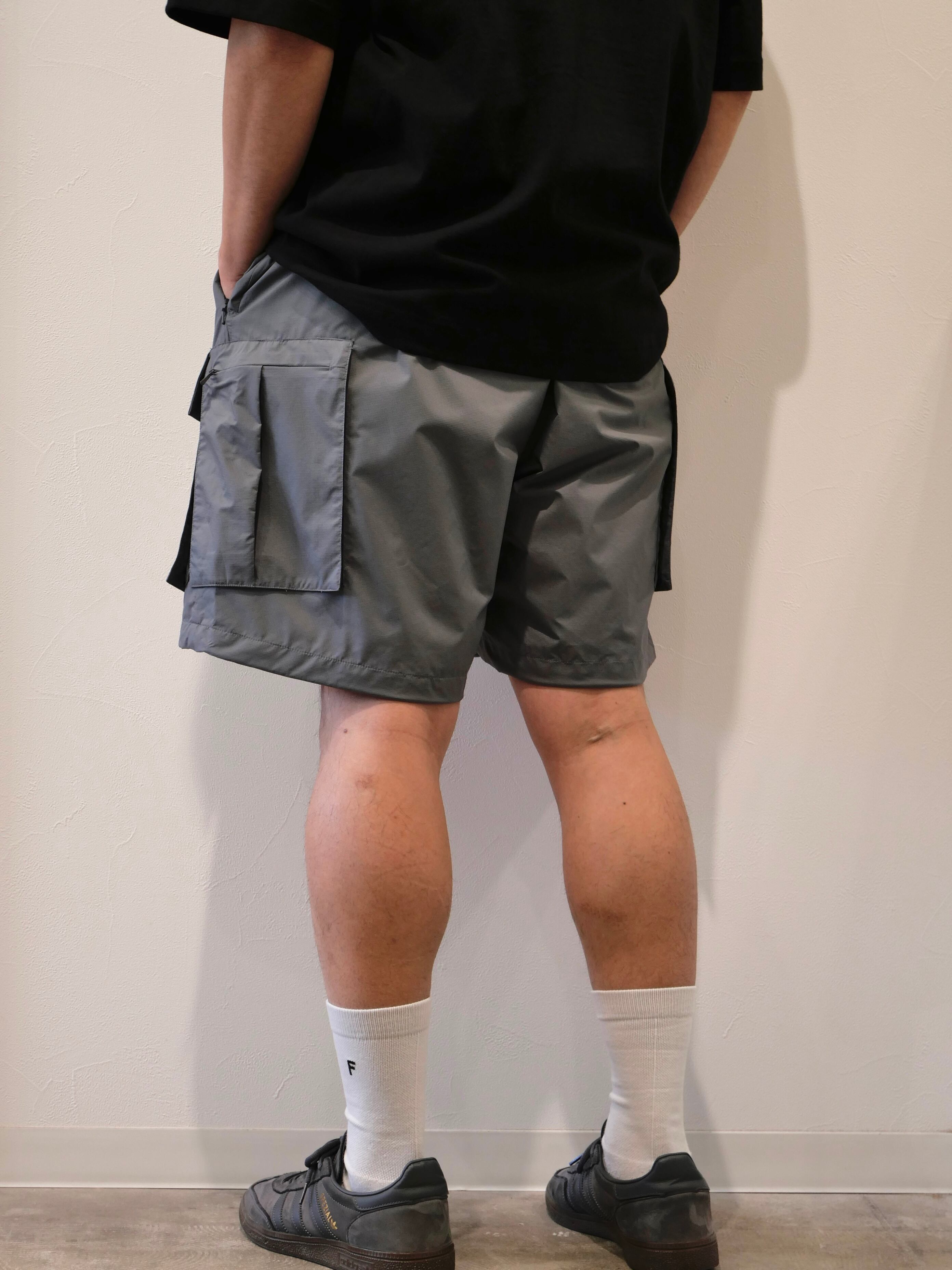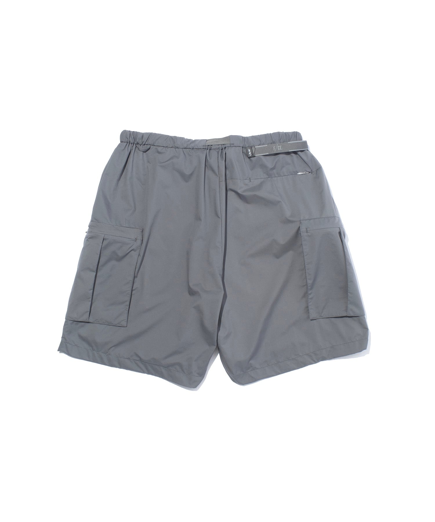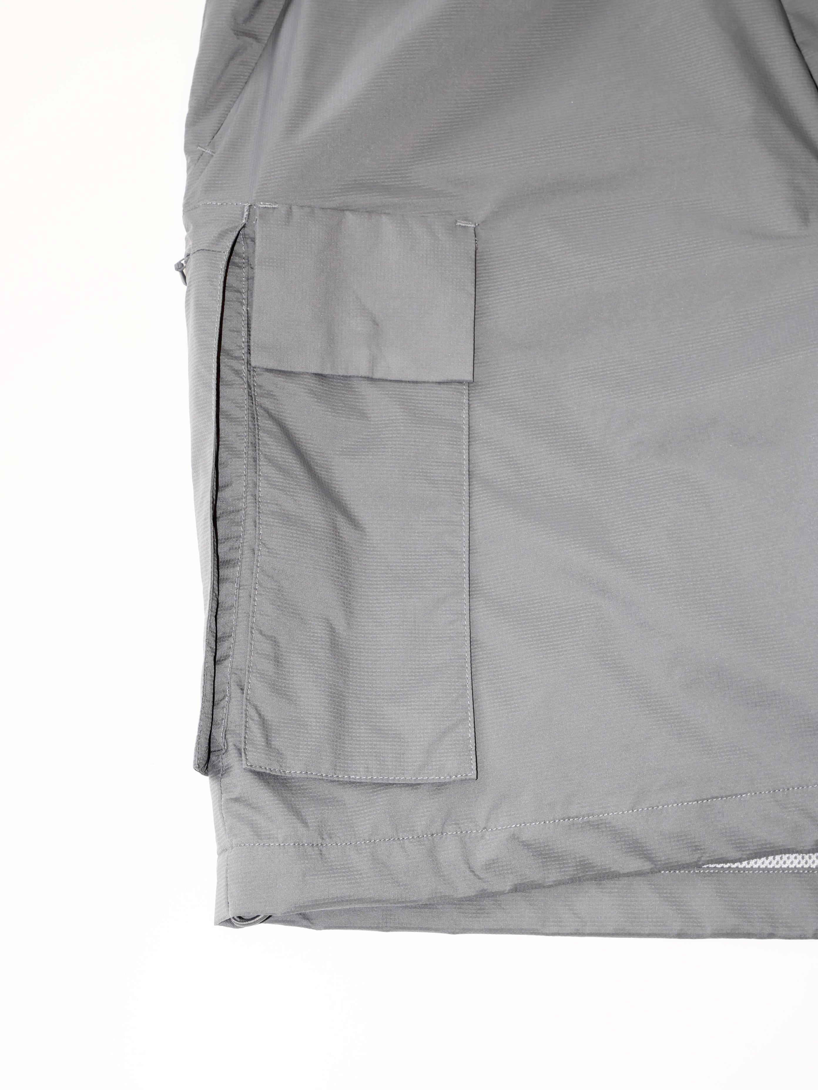 変形カーゴポケットが特徴的な、膝上丈のテクニカルショーツ。