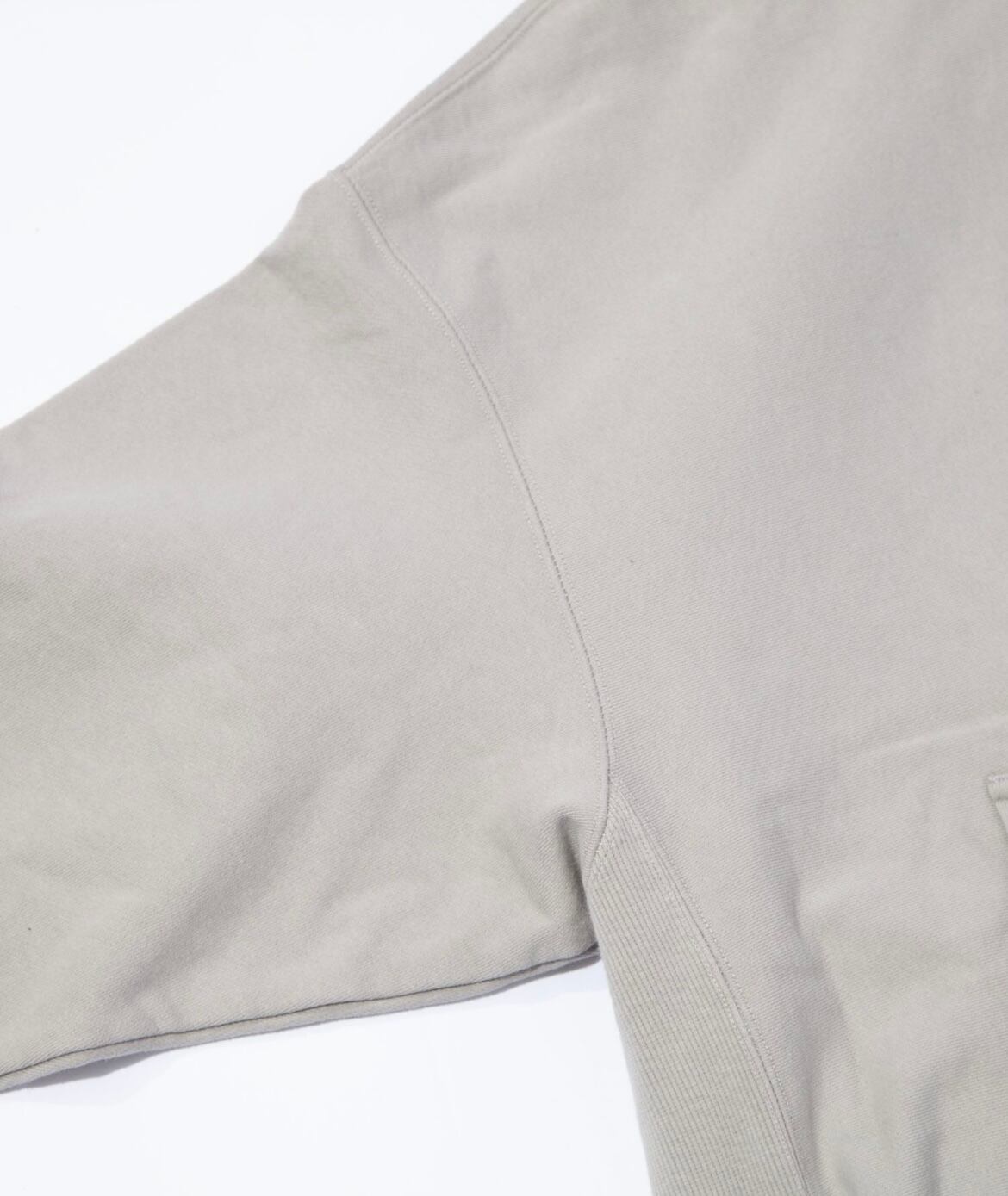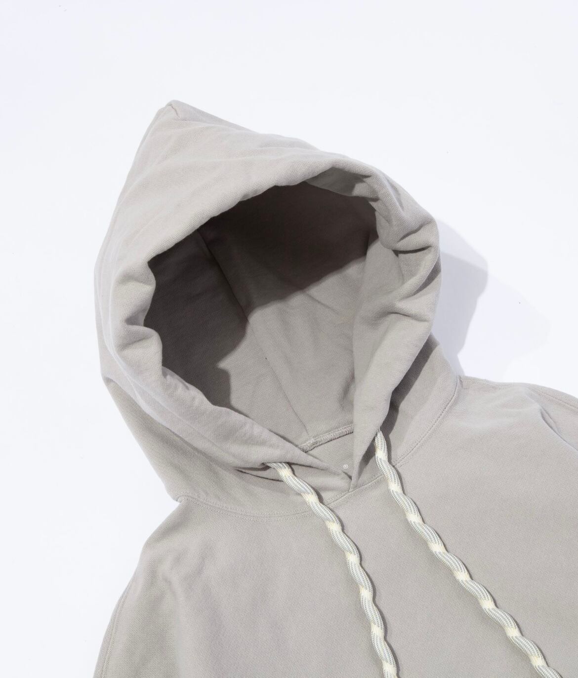 リサイクル糸を使用した、厚みがあり強度のあるリバースウィーブ風のビッグスウェットフーディー。