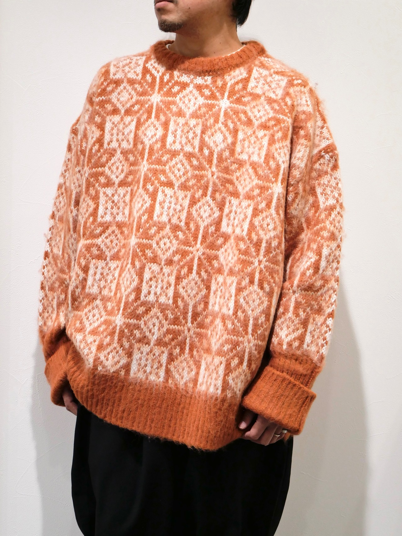 光沢感と毛足感のあるモヘヤ糸をジャガード編みにし、全面にノルディックの雪柄を表現した、オーバーサイズのざっくりプルオーバー。